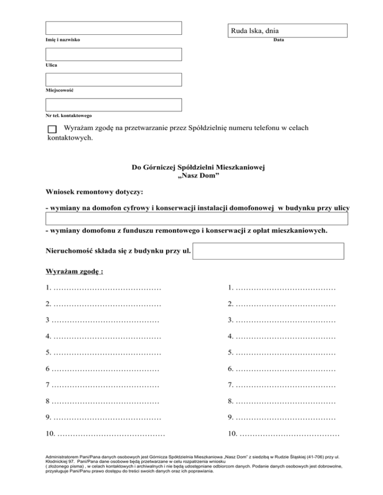 Ruda lska, dnia Imię i nazwisko Data Ulica Miejscowość Nr tel. kontaktowego Wyrażam zgodę na przetwarzanie przez Spółdzielnię numeru telefonu w celach kontaktowych. Do Górniczej Spółdzielni Mieszkaniowej „Nasz Dom” Wniosek remontowy dotyczy: - wymiany na domofon cyfrowy i konserwacji instalacji domofonowej w budynku przy ulicy - wymiany domofonu z funduszu remontowego i konserwacji z opłat mieszkaniowych. Nieruchomość składa się z budynku przy ul. Wyrażam zgodę : 1. …………………………………… 1. ………………………………… 2. …………………………………… 2. ………………………………… 3 …………………………………… 3. ………………………………… 4. …………………………………… 4. ………………………………… 5. …………………………………… 5. ………………………………… 6 …………………………………… 6. ………………………………… 7 …………………………………… 7. ………………………………… 8 …………………………………… 8. ………………………………… 9. …………………………………… 9. ………………………………… 10. …………………………………… 10. ………………………………… Administratorem Pani/Pana danych osobowych jest Górnicza Spółdzielnia Mieszkaniowa „Nasz Dom” z siedzibą w Rudzie Śląskiej (41-706) przy ul. Kłodnickiej 97. Pani/Pana dane osobowe będą przetwarzane w celu rozpatrzenia wniosku ( złożonego pisma) , w celach kontaktowych i archiwalnych i nie będą udostępniane odbiorcom danych. Podanie danych osobowych jest dobrowolne, przysługuje Pani/Panu prawo dostępu do treści swoich danych oraz ich poprawiania.