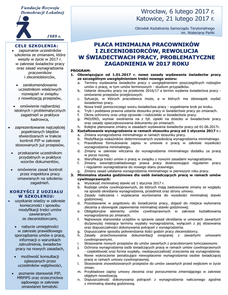 6 lutego 2017 r. Rozwiązania Wrocław, informatyczne Katowice, 21 lutego 2017 r. Ośrodek Kształcenia Samorządu Terytorialnego im. Waleriana Pańki CELE SZKOLENIA: zapoznanie uczestników szkolenia ze zmianami, które weszły w życie w 2017 r. w zakresie świadectw pracy oraz zasad wynagradzania pracowników i zleceniobiorców, zarekomendowanie uczestnikom właściwych rozwiązań w związku z nowelizacją przepisów, omówienie najbardziej istotnych i problematycznych zagadnień w praktyce kadrowca, zaprezentowanie najczęściej popełnianych błędów stwierdzanych w trakcie kontroli PIP w zakresie stosowanych już przepisów, przekazanie uczestnikom przydatnych w praktyce wzorów dokumentów, omówienie zasad kontroli przez inspektora pracy omawianych na szkoleniu zagadnień. KORZYŚCI Z UDZIAŁU W SZKOLENIU: uzyskanie wiedzy w zakresie konieczności i sposobu modyfikacji treści umów zawieranych ze zleceniobiorcami, nabycie umiejętności w zakresie prawidłowego sporządzania umów o pracę, informacji o warunkach zatrudnienia, świadectw pracy na nowych zasadach, możliwość konsultacji zgłaszanych przez uczestników wątpliwości, poznanie stanowisk PIP, MRPiPS oraz orzecznictwa sądowego w zakresie omawianej tematyki. PŁACA MINIMALNA PRACOWNIKÓW I ZLECENIOBIORCÓW, REWOLUCJA W ŚWIADECTWACH PRACY, PROBLEMATYCZNE ZAGADNIENIA W 2017 ROKU PROGRAM: 1. Obowiązujące od 1.01.2017 r. nowe zasady wydawania świadectw pracy ze szczególnym uwzględnieniem treści nowego wzoru: a. Terminy wydawania świadectw pracy z uwzględnieniem poszczególnych rodzajów umów o pracę, w tym umów terminowych - studium przypadków. b. Ustanie stosunku pracy na przełomie 2016/17 a termin wydania świadectwa pracy omówienie przepisów przejściowych. c. Sytuacje, w których pracodawca może, a w których ma obowiązek wydać świadectwo pracy. d. Nowa treść pomocniczego wzoru świadectwa pracy - wypełnianie krok po kroku. e. Tryb i podstawa prawna ustania stosunku pracy w świadectwie pracy po zmianach. f. Okres ochronny oraz urlop ojcowski i rodzicielski w świadectwie pracy. g. PKD/EKD, wymiar zwolnienia na z tyt. opieki na dziecko w świadectwie pracy oraz zasady opieczętowywania dokumentu po zmianach. h. Kolejne planowane zmiany w zasadach wydawania świadectw pracy od 01.06.2017r. 2. Kształtowanie wynagrodzenia w ramach stosunku pracy od 1 stycznia 2017 r.: a. Zmiana wynagrodzenia minimalnego w ramach stosunku pracy. b. Modyfikacja wskaźników determinowanych wysokością wynagrodzenia minimalnego. c. Prawidłowe formułowanie zapisu w umowie o pracę w zakresie wysokości wynagrodzenia minimalnego. d. Zmiany w zakresie wliczania do wynagrodzenia minimalnego dodatku za pracę w porze nocnej. e. Weryfikacja treści umów o pracę w związku z nowymi zasadami wynagradzania. f. Zmiany wewnątrzzakładowego prawa pracy dostosowujące regulamin pracy i regulamin wynagradzania do nowego stanu prawnego. g. Zmiany zasad ustalania wynagrodzenia minimalnego w pierwszym roku pracy. 3. Minimalna stawka godzinowa dla osób świadczących pracę w ramach umów cywilnoprawnych: a. Wysokość minimalnej stawki od 1 stycznia 2017 r. b. Rodzaje umów cywilnoprawnych, do których mają zastosowanie zmiany ze względu na sposób określania wynagrodzenia, przedmiot oraz strony umowy. c. Zasady naliczania i wypłacania wyrównania do wysokości minimalnej stawki godzinowej. d. Pozostawanie w pogotowiu do świadczenia pracy, dojazd do miejsca wykonania zlecenia a obowiązek zapewnienia minimalnej stawki godzinowej. e. Obligatoryjne elementy umów cywilnoprawnych w zakresie kształtowania wynagrodzenia po zmianach. f. Najnowsze stanowiska urzędów w sprawie zasad określania w umowach zawartych do/powyżej miesiąca terminu wypłaty wynagrodzenia, wyłączeń z jej stosowania oraz dopuszczalności dokonywania potrąceń z wynagrodzenia. g. Dopuszczalne sposoby potwierdzania ilości godzin pracy zleceniobiorcy. h. Zasady przechowywania dokumentacji związanej z zawartymi umowami cywilnoprawnymi. i. Stosowanie nowych przepisów do umów zawartych z pracobiorcami tymczasowymi. j. Ochrona wynagrodzenia osób świadczących pracę w ramach umów cywilnoprawnych - częstotliwość oraz forma wypłaty, niedopuszczalność zrzeczenia się wynagrodzenia. k. Nowe wykroczenie penalizujące niewypłacenie wynagrodzenia osobie świadczącej pracę w ramach umowy cywilnoprawnej. l. Stosowanie znowelizowanych przepisów do umów zawartych przed wejściem w życie zmian. m. Przykładowe zapisy umowy zlecenia oraz porozumienia zmieniającego w zakresie objętym nowelizacją. n. Dopuszczalność dokonywania potrąceń z wynagrodzenia naliczonego zgodnie z minimalną stawką godzinową. AD RES A CI S Z KOL E N IA : szkolenie skierowane jest do osób, które na co dzień zajmują się problematyką pracowniczego i niepracowniczego zatrudnienia, w szczególności kadry kierowniczej, pracowników działów kadr, personalnych, pracowników działów prawno-organizacyjnych. DAN E D O KO NT AKT U : Ośrodek Kształcenia Samorządu Terytorialnego im. Waleriana Pańki 40-014 Katowice ul. Mariacka 1 NIP: 522-000-18-95 Tel 32 259 86 73, 32 253 84 09 Fax. 32 259 86 73 w. 22, 26 e-mail: [email protected] www . oks t .p l OS O BA D O KO NT AKT U : Milena Dudek, tel. 71 372 41 21 [email protected] KOD SZKOLENIA: 4. Uprawnienia PIP w zakresie weryfikacji zasad wynagradzania: a. Świadczenie pracy w ramach stosunku pracowniczego i cywilnoprawnego. b. Prawidłowe dobieranie podstawy zatrudnienia (umowa o pracę, zlecenia, dzieło) w zależności od przedmiotu umowy oraz warunków, w jakich jest świadczona praca. c. Środki prawne, które inspektor pracy jest uprawniony wydać po weryfikacji prawidłowości wypłacania minimalnej stawki godzinowej. d. Zasady wzmożonych kontroli przez PIP warunków świadczenia pracy w ramach umów cywilnoprawnych w kontekście niezawierania ich w warunkach stosunku pracy. e. Zasady planowanych przez PIP
