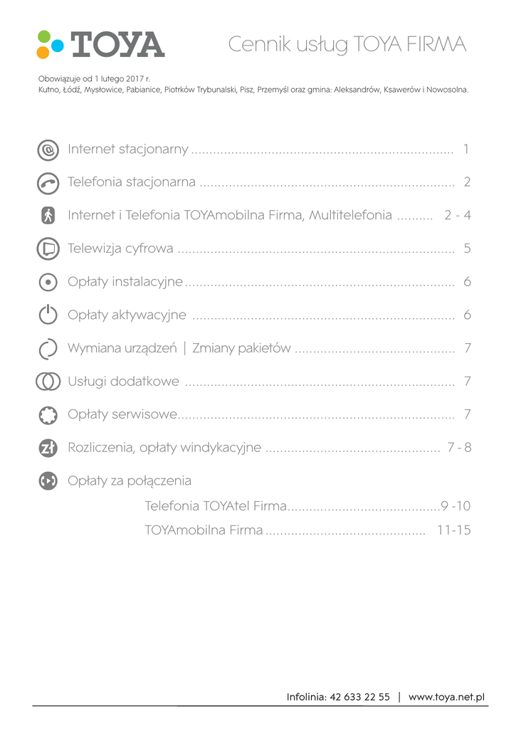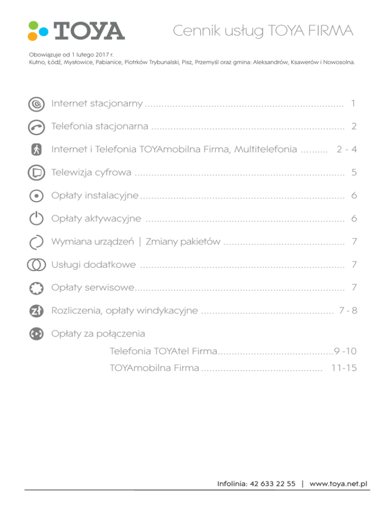 Cennik usług TOYA FIRMA Obowiązuje od 1 lutego 2017 r. Kutno, Łódź, Mysłowice, Pabianice, Piotrków Trybunalski, Pisz, Przemyśl oraz gmina: Aleksandrów, Ksawerów i Nowosolna. Internet stacjonarny ........................................................................ 1 Telefonia stacjonarna ...................................................................... 2 Internet i Telefonia TOYAmobilna Firma, Multitelefonia .......... 2 - 4 Telewizja cyfrowa ............................................................................ 5 Opłaty instalacyjne .......................................................................... 6 Opłaty aktywacyjne ........................................................................ 6 Wymiana urządzeń | Zmiany pakietów ............................................ 7 Usługi dodatkowe .......................................................................... 7 Opłaty serwisowe............................................................................ 7 zł Rozliczenia, opłaty windykacyjne ................................................ 7 - 8 Opłaty za połączenia Telefonia TOYAtel Firma..........................................9 -10 TOYAmobilna Firma ............................................ 11-15 Infolinia: 42 633 22 55 | www.toya.net.pl Cennik usług TOYA FIRMA Obowiązuje od 1 lutego 2017 r. Kutno, Łódź, Mysłowice, Pabianice, Piotrków Trybunalski, Pisz, Przemyśl oraz gmina: Aleksandrów, Ksawerów i Nowosolna. Internet stacjonarny TOYAnet Firma opłaty abonamentowe przy umowie na czas nieokreślony S M L XL obsługa domeny firmowej pięć kont poczty elektronicznej o objętości 5 GB każde przestrzeń na stronę WWW o objętości 1 GB pakiet ,,Bezpieczny Internet TOYA” 2) na 2 urządzenia WiFi 3) możliwość podłączenia max. 32 terminali abonenckich 5) korzystanie z Urządzenia dostępowego Usługa bez limitu ilości przesłanych danych 1) Pakiety możliwość uzyskania dwóch stałych publicznych adresów IP możliwość uzyskania jednego stałego, publicznego adresu IP SLA 6) 24 godziny Szczegóły dotyczące prędkości dla poszczególnych Pakietów Prędkość deklarowana oraz maksymalna w kierunku ściągania/wysyłania danych Prędkość zwykle dostępna w kierunku ściągania/wysyłania danych Prędkość minimalna w kierunku ściągania/wysyłania danych Opłata za pakiet SLA 6) 12 godziny 30/5 Mb/s 120/15 Mb/s 180/18 Mb/s 280/25 Mb/s 23/4 Mb/s 90/12 Mb/s 135/14 Mb/s 210/19 Mb/s 15/3 Mb/s 60/8 Mb/s 90/9 Mb/s 140/13 Mb/s Cena netto Cena brutto Cena netto Cena brutto Cena netto Cena brutto Cena netto Cena brutto 65 zł 79,95 zł 85 zł 104,55 zł 95 zł 116,85 zł 105 zł 129,15 zł Usługi dodatkowe Pakiet ,,Bezpieczny Internet TOYA” 2) na 5 urządzeń 13 zł 15,99 zł 13 zł 15,99 zł 10 zł 12,30 zł 10 zł 12,30 zł Pakiet ,,Bezpieczny Internet TOYA” 2) na 10 urządzeń 24 zł 29,52 zł 24 zł 29,52 zł 20 zł 24,60 zł 20 zł 24,60 zł Pakiet ,,Bezpieczny Internet TOYA” 2) na 20 urządzeń 40 zł 49,20 zł 40 zł 49,20 zł 35 zł 43,05 zł 35 zł 43,05 zł 4 zł 40 zł 4,92 zł 49,20 zł 4 zł 40 zł 4,92 zł 49,20 zł 4 zł 49 zł 35 zł 4,92 zł 60,27 zł 43,05 zł 4 zł 49 zł 35 zł 4,92 zł 60,27 zł 43,05 zł WiFi Plus 4) SLA 6) 6 godzin GO ON BIZNES 7) Prędkości dostępne przy połączeniu z modemem kablowym poprzez port Ethernet. Obsługa domeny firmowej – obejmuje prowadzenie serwera DNS dla domeny klienta. „Bezpieczny Internet TOYA” – program antywirusowy z licencją na określoną w tabeli liczbę urządzeń. Zasady korzystania z Usługi i jej zakres określa Regulamin Usługi Bezpieczny Internet TOYA. 3) WiFi – użytkowanie modemu z portem WiFi pracującym w paśmie 2,4 GHz. 4) WiFi Plus – użytkowanie modemu z portem WiFi pracującym w paśmie 2,4 GHz i 5 GHz jednocześnie . Opcja niedostępna w technologii GPON. 5) Cena obejmuje podłączenie pierwszego terminala abonenckiego. Nie obejmuje kosztów związanych z podłączeniem drugiego i kolejnych terminali abonenckich oraz wykonaniem sieci komputerowej. Dodatkowe terminale abonenckie muszą być zainstalowane w tym samym lokalu co pierwszy i podłączone do tego samego Urządzenia dostępowego. 6) SLA – gwarantowany czas usunięcia usterki. Zasady korzystania z Usługi i jej zakres określa Regulamin Usługi Gwarancja SLA. 7) GO ON BIZNES – dostęp do wielokrotnego odtwarzania utworów muzycznych z licencją do rozpowszechniania publicznego z dostępnych zasobów w miesiącu. Serwis dostępny dla Abonentów posiadających aktywną usługę TOYAnet Firma. Zasady korzystania z Usługi i jej zakres określa Regulamin korzystania z serwisu muzycznego ,,GO ON BIZNES”. 1) 2) Faktura papierowa w cenie usługi. Infolinia: 42 633 22 55 | www.toya.net.pl 1 Cennik usług TOYA FIRMA Obowiązuje od 1 lutego 2017 r. Kutno, Łódź, Mysłowice, Pabianice, Piotrków Trybunalski, Pisz, Przemyśl oraz gmina: Aleksandrów, Ksawerów i Nowosolna. Telefonia stacjonarna TOYAtel Firma opłaty abonamentowe przy umowie na czas nieokreślony M L Dwie linie telefoniczne stacjonarne w jednej lokalizacji z dwoma różnymi numerami. Darmowe, nielimitowane połączenia z numerami stacjonarnymi i mobilnymi w sieci TOYA. Pakiety Darmowe rozmowy na krajowe numery stacjonarne i komórkowe. Darmowe rozmowy na krajowe numery stacjonarne. 200 darmowych minut na krajowe numery stacjonarne dla dwóch linii łącznie. Opłata za pakiet XL Cena netto Cena brutto Cena netto Cena brutto Cena netto Cena brutto 33 zł 40,59 zł 60 zł 73,80 zł 80 zł 98,40 zł Darmowe połączenia nie dotyczą numerów skróconych, serwisów tematycznych, połączeń na numery 80x i Premium Rate. Faktura papierowa w cenie usługi. Internet i telefonia TOYAmobilna Firma opłaty abonamentowe przy umowie na czas nieokreślony Telefonia Komórkowa Pakiety Opłata za pakiet Karta SIM Połączenia na krajowe numery stacjonarne, komórkowe i SMS do krajowych sieci komórkowych - bez ogra