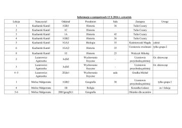 Informacje o zastępstwach 13 X 2016 r. czwartek Lekcja Nauczyciel Oddział Przedmiot Sala Zastępca 1 Kucharski Kamil 1GB|1 Historia 36 Tulin Cezary 2 Kucharski Kamil 1C Historia 3 Kucharski Kamil 1A Historia 45 Tulin Cezary 4 Kucharski Kamil 1GB|2 Historia 36 Tulin Cezary 5 Kucharski Kamil 1GA|1 Biologia 35 Kuśmierczak Magda całość 6 Kucharski Kamil 1GA|2 Historia 35 Uczniowie zwolnieni tylko grupa 2 8 Kucharski Kamil 1E Historia 25 Walczyk Mikołaj 2 Lazarowicz Agnieszka 3c|DZ Wychowanie fizyczne - Uczniowie przychodzą później Gr. dziewcząt 3 Lazarowicz Agnieszka 3c|DZ Wychowanie fizyczne - Uczniowie przychodzą później Gr. dziewcząt Uwagi Tulin Cezary 4 -5 Lazarowicz Agnieszka 2E|dz1 Wychowanie fizyczne aula Grudka Michał 1 Molisz Małgorzata 1GB|2 Geografia 38 Uczniowie przychodzą później tylko grupa 2 4 Molisz Małgorzata 1B Religia Koszałka Łukasz za 1 lekcję 5-6 Molisz Małgorzata 2IB1|geogSL1 Geografia Okienko dla uczniów