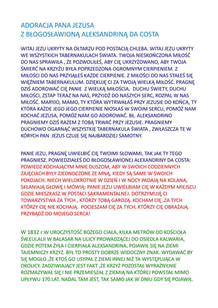 ADORACJA PANA JEZUSA Z BŁOGOSŁAWIONĄ ALEKSANDRINĄ DA COSTA WITAJ JEZU UKRYTY NA OŁTARZU POD POSTACIĄ CHLEBA. WITAJ JEZU UKRYTY WE WSZYSTKICH TABERNAKULACH ŚWIATA. TWOJA NIESKOŃCZONA MIŁOŚĆ DO NAS SPRAWIŁA , ŻE POZWOLIŁEŚ, ABY CIĘ UKRZYŻOWANO, ABY TWOJA ŚMIERĆ NA KRZYŻU BYŁA POPRZEDZONA OGROMNYM CIERPIENIEM. Z MIŁOŚCI DO NAS PRZYJĄŁEŚ KAŻDE CIERPIENIE. Z MIŁOŚCI DO NAS STAŁEŚ SIĘ WIĘŹNIEM TABERNAKULUM. DZIĘKUJĘ CI ZA TWOJĄ WIELKĄ MIŁOŚĆ. PRAGNĘ DZIŚ ADOROWAĆ CIĘ PANIE Z WIELKĄ MIŁOŚCIA. DUCHU ŚWIETY, DUCHU MIŁOŚCI, ZSTAP TERAZ NA NAS, PRZYJDŹ DO NASZYCH SERC, ROZPAL W NAS MIŁOŚĆ. MARYJO, MAMO, TY KTÓRA WYTRWAŁAŚ PRZY JEZUSIE DO KOŃCA, TY KTÓRA KAŻDE JEGO JEGO CIERPIENIE NIOSŁAŚ W SWOIM SERCU, POMÓŻ NAM KOCHAĆ JEZUSA, POMÓŻ NAM GO ADOROWAĆ. BŁ. ALEKSANDRINO PRAGNIEMY DZIŚ RAZEM Z TOBĄ TRWAĆ PRZY JEZUSIE. PRAGNIEMY DUCHOWO OGARNĄĆ WSZYSTKIE TABERNAKULA ŚWIATA , ZWŁASZCZA TE W KÓRYCH PAN JEZUS CZUJE SIĘ NAJBARDZIEJ SAMOTNY. PANIE JEZU, PRAGNĘ UWIELBIĆ CIĘ TWOIMI SŁOWAMI, TAK JAK TY TEGO PRAGNIESZ. POWIEDZIAŁEŚ DO BŁOGOSŁAWIONEJ ALEXANDRINY DA COSTA: POWIEDZ KOCHAJĄCYM MNIE DUSZOM, ABY W SWOICH CODZIENNYCH ZAJĘCIACH BYŁY ZJEDNOCZONE ZE MNĄ, KIEDY SĄ SAME W SWOICH POKOJACH. NIECH WIELOKROTNIE W DZIEŃ I W NOCY PADAJĄ NA KOLANA, SKŁANIAJĄ GŁOWĘ I MÓWIĄ: PANIE JEZU UWIELBIAM CIĘ W KAŻDYM MIEJSCU GDZIE MIESZKASZ W POSTACI SAKRAMENTALNEJ. DOTRZYMUJĘ CI TOWARZYSTWA ZA TYCH , KTÓRZY TOBĄ GARDZĄ. KOCHAM CIĘ ,ZA TYCH KTÓRZY CIĘ NIE KOCHAJĄ. POCIESZAM CIĘ ZA TYCH, KTÓRZY CIĘ OBRAŻAJĄ. PRZYBĄDŹ DO MOJEGO SERCA! W 1832 r W UROCZYSTOŚĆ BOŻEGO CIAŁA, KILKA METRÓW OD KOŚCIOŁA ŚW.EULALII W BALASAR NA ULICY PROWADZĄCEJ DO OSIEDLA KALWARIA, GDZIE POTEM ŻYŁA I CIERPIAŁA ALEXSANDRINA, POJAWIŁ SIĘ NA ZIEMI TAJEMNICZY KRZYŻ. BYŁ TO PROSTY DOBRZE WIDOCZNY ZNAK. WYDAWAĆ BY SIĘ MOGŁO ,ŻE KTOŚ GO USYPAŁ Z ZIEMI INNEJ NIŻ TA WYSTĘPUJĄCA W OKOLICY. ZADZIWIAJĄCY JEST FAKT ,ŻE KRZYŻ POZOSTAŁ WYRAŻNY,NIE ROZMAZYWAŁ SIĘ I NIE PRZEMIESZAŁ Z ZIEMIĄ NA KTÓREJ POWSTAŁ MIMO UPŁYWU 170 LAT. NADAL TAM JEST, TAK SAMO JAK W DNIU GDY SIĘ POJAWIŁ. ALEXSANDRINA MARIA DA COSTA UR. SIĘ 30 MARCA 1904r W MAŁEJ PORTUGALSKIEJ WIOSCE BALASAR .NALEŻAŁA DO RODZINY CHRZEŚCIJAŃSKIEJ, OD NAJMŁODSZYCH LAT ŻYWIŁA GŁĘBOKIE NABOŻEŃSTWO DO NAJŚWIETSZEJ MARYI PANNY. NAZYWAŁA JĄ CZULE MAEZINNA - KOCHANA MAMUSIA. W WIEKU 7LAT ZOSTAŁA WRAZ Z SIOSTRĄ DEOLINDĄ WYSŁANA PRZEZ RODZICÓW NA NAUKĘ DO SZKOŁY POWSZECHNEJ, GDZIE PRZYSTĄPIŁA DO PIERWSZEJ KOMUNI ŚW.I BIERZMOWANIA. PO KILKU MIESIĄCACH POWRÓCIŁA DO SOMU RODZINNEGO DO DZIELNICY ZWANEJ KALWARIĄ. W WIELKĄ SOBOTĘ 1918 ZOSTAŁA NAPADNIĘTA PRZEZ MĘŻCZYZNĘ, KTÓRY CHCIAŁ JĄ ZGWAŁCIĆ. UCIEKAJĄC PRZED NIM WYSKOCZYŁA Z DOMU PRZEZ OKNO I SPADŁA Z WYSOKOŚCI 4 METRÓW. Z POWODU TEGO UPADKU ZOSTAŁA CAŁKOWICIE SPARALIŻOWANA. W PIERWSZYCH LATACH CHOROBY ALEKSANDRINA BŁAGAŁA BOGA PRZEZ WSTAWIENNICTWO MARYI O ŁASKĘ UZDROWIENIA. JEDNAK PO PEWNYM CZASIE ZROZUMIAŁA, ŻE JEJ CHOROBA JEST WIELKĄ ŁASKĄ. STAŁA SIĘ WIĘŹNIEM SWOJEGO ŁÓŻKA, A JEJ MYŚLI NIEUSTANNIE BIEGŁY KU PANU JEZUSOWI -WIĘŹNIOWI TABERNAKULUM. PAN JEZUS POWIEDZIAŁ ALEXSANDRINIE : JESTEM SAMOTNY W TABERNAKULACH. CZUJĘ SIĘ BARDZO SMUTNY I ZNIEWAŻONY. ODWIEDZAĆ UWIĘZIONYCH I POCIESZAĆ ICH TO DOBRY UCZYNEK, A JA WŁAŚNIE JESTEM UWIĘZIONY, UWIĘZIONY Z MIŁOSCI. CZY CZĘSTO MYŚLE O JEZUSIE UWIĘZIONYM W TABERNAKULUM, SAMOTNYM, SMUTNYM, OPUSZCZONYM...? CZY PRZECHODZĄC OBOK KOŚCIOŁA MYŚLĘ O NIM? CZY GO POZDRAWIAM? CZY ODWIEDZAM GO, ABY CHOĆ CHWILĘ Z NIM POROZMAWIAĆ...? CHCĘ ABY NAUCZANO O SZACUNKU DO TABERNAKULUM . WIELU JEST TAKICH ,KTÓRZY CHODŹ WCHODZĄ DO KOŚCIOŁA, NAWET SIĘ ZE MNĄ NIE WITAJĄ I NIE ZATRZYMUJĄ SIĘ ANI NA CHWILĘ, ABY MNIE ADOROWAĆ. CHCIAŁBYM MIEĆ WIELU WIERNYCH STRAŻNIKÓW CZUWAJĄCYCH PRZY TABERNAKULACH, ABY UCHRONIĆ WAS PRZED WIELOMA PRZESTĘPSTWAMI. PRZYSZŁA BŁOGOSLAWIONA NIGDY NIE MIAŁA WĄTPLIWOŚCI CO DO POWOŁANIA OTRZYMANEGO OD BOGA. ZACZEŁA OD POSTANOWIENIA ,ŻE NIE ODMÓWI PANU NICZEGO. PROSIŁA NAJŚWIETSZĄ MARYJĘ PANNĘ, SWOJA MAMUSIĘ O WSPARCIE ORAZ RADĘ JAK PRZYPODOBAĆ SIĘ JEZUSOWI. PAN JEZUS KILKAKROTNIE PROSIŁ JĄ, ABY POZWOLIŁA SIĘ UKRZYŻOWAĆ : DAJ MI SWOJE RĘCE, CHCĘ JE UKRZYŻOWAĆ. DAJ MI SWOJE STOPY, CHCĘ JE PRZYBIĆ RAZEM ZE MNĄ. DAJ MI SWOJĄ GŁOWĘ, CHCĘ NA NIĄ NAŁOŻYĆ KORONĘ CIERNIOWĄ, TAK JAK MNIE TO UCZYNIONO. DAJ MI SWOJE SERCE, CHCĘ JE PRZEBIĆ WŁÓCZNIĄ, TAK JAK PRZEBILI MOJE. ODDAJ MI CAŁE SWOJE CIAŁO, ABYM MÓGŁ Z NIM ZROBIĆ, CO ZECHCĘ. JEJ PRAGNIENIE BYCIA UKRZYŻOWANĄ WRAZ Z JEZUSEM WYNIKAŁO Z JEJ OGROMNEJ MIŁOŚCI DO NIEGO. CIERPIENIE PRZYJĘTE Z MIŁOŚCI DO BOGA MA WIELKĄ MOC – MOC ZJEDNOCZENIA Z BOGIEM. W CIERPIENIU BÓG JEST NAJBLIŻEJ CZŁOWIEKA. JEZELI ODDAJEMY MU NASZE CIERPIENIA ON ŁĄCZY JE ZE SWOIM CIERPIENIEM, KTÓRE MA NIESKOŃCZONĄ WARTOŚĆ. NASZE MAŁE I WIELKIE CIERPIENIA TO OGROMNY SKARB, KTÓRY MOŻEMY OFIAROWAĆ BOGU. „Bóg, nie powoduje cierpienia stworzeń, lecz je dopuszcza, ponieważ - po grzechu pierworodnym - stanowi ono część ludzkiej kondycji. Jednakże Jego Serce pełne Miłości do ludzi kazało Mu wziąć na siebie - razem z Krzyżem wszystkie te udręki: nasze cierpienie, nasz smutek, nasz niepokój, nasz głód i pragnienie sprawiedliwości. Kiedy nawiedza nas cierpienie, które zdaje się przekraczać nasze możliwości, zawsze wolno nam prosić Boga, by nas od niego uwolnił. Trzeba to jednak czynić podobnie jak Pan Jezus w Ogrójcu, prosząc, by przede wszystkim spełniła się wola naszego Ojca w Niebie. Dlatego módlmy się często o wytrwałość i męstwo w cierpieniu. Starajmy się jak najbardziej świadomie prosić: „bądź wola Twoja”, kiedy odmawiamy modlitwę Pańską i pamiętajmy, że choć nieraz Krzyż przygniata nas do ziemi, to jednak bez niego nie wejdziemy do Nieba