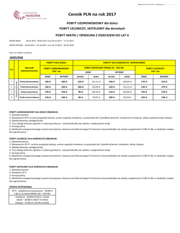 Załącznik nr 5a do cennika , obowiązuje od ............................. Cennik PLN na rok 2017 POBYT UZDROWISKOWY dla dzieci POBYT LECZNICZY, HOTELOWY dla dorosłych POBYT MATKI / OPIEKUNA Z DZIECKIEM DO LAT 6 SEZON NISKI: 04.01.2017– 30.04.2017 oraz 02.10.2017 – 17.12.2017 SEZON WYSOKI: 01.05.2017 – 01.10.2017 oraz 18.12.2017 – 03.01.2018 Ceny za miejsce w pokoju JAGUSIA POBYTY DLA DZIECI Warunki zakwaterowania 1 2 3 4 Pokoje komfortowe L.p. POBYTY DLA DOROSŁYCH (OPIEKUNÓW) POBYT HOTELOWY PKWiU 55 - VAT 8% POBYT UZDROWISKOWY VAT -zw NISKI POBYT LECZNICZY VAT -zw WYSOKI NISKI WYSOKI brutto netto brutto netto NISKI WYSOKI Pokój jednoosobowy 160 zł 180 zł 120 zł 111,11 zł 140 zł 129,63 zł 179 zł 219 zł Pokój dwuosobowy 140 zł 160 zł 100 zł 92,59 zł 120 zł 111,11 zł 149 zł 179 zł Pokój trzyosobowy 130 zł 150 zł 90 zł 83,33 zł 110 zł 101,85 zł 139 zł 159 zł Pokój czteroosobowy 120 zł 140 zł 80 zł 74,07 zł 100 zł 92,59 zł 129 zł 149 zł POBYT UZDROWISKOWY DLA DZIECI OBEJMUJE: 1. Zakwaterowanie. 2. Wyżywienie VP II: w dniu przyjazdu kolacja, w dniu wyjazdu śniadanie, w pozostałe dni 5 posiłków dziennie: śniadanie,II śniadanie, obiad, podwieczorek, kolacja. 3. Opiekę lekarską i pielęgniarską. 4. Trzy zabiegi dziennie zgodnie z ordynacją lekarza - od poniedziałku do soboty z wyłączeniem świąt. 5. Kurację pitną 6. Możliwość nieograniczonego czasem korzystania z basenu oraz Słonecznego Fit Centrum od poniedziałku do soboty w godzinach 15.00-21.00, w niedzielę i święta bez ograniczenia. POBYT LECZNICZY DLA DOROSŁYCH OBEJMUJE: 1. Zakwaterowanie. 2. Wyżywienie VP II*: w dniu przyjazdu kolacja, w dniu wyjazdu śniadanie, w pozostałe dni 3 posiłki dziennie: śniadanie, obiad, kolacja. 3. Opiekę lekarską i pielęgniarską. 4. Trzy zabiegi dziennie zgodnie z ordynacją lekarza - od poniedziałku do soboty z wyłączeniem świąt. 5. Kurację pitną 6. Możliwość nieograniczonego czasem korzystania z basenu oraz Słonecznego Fit Centrum od poniedziałku do soboty w godzinach 15.00-21.00, w niedzielę i święta bez ograniczenia. POBYT HOTELOWY DLA DOROSŁYCH OBEJMUJE: 1. Zakwaterowanie 2. Śniadanie VP II 3. Kurację pitną 4. Możliwość nieograniczonego czasem korzystania z basenu oraz Słonecznego Fit Centrum od poniedziałku do soboty w godzinach 15.00-21.00, w niedzielę i święta bez ograniczenia. OFERTA WYŻYWIENIA VP II - całodzienne wyżywienie – 39,00 zł ( 36,11 zł netto) PKWiU 56 – VAT 8% śniadanie –10,00zł (9,26 zł netto) obiad – 18,00 zł (16,67 zł netto) kolacja – 11,00 zł ( 10,19 zł netto) Załącznik nr 5a do cennika , obowiązuje od ............................. POBYT MATKI / OPIEKUNA Z DZIECKIEM DO LAT 6 W ramach pobytu: 1. Zakwaterowanie w pokoju 2-osobowym z łazienką 2. 3 posiłki dziennie, w przypadku wyżywienia dziecka – ½ porcji z możliwością diety, w tym również posiłków bezglutenowych 3. Kuracja pitna 4. Możliwość nieograniczonego czasem korzystania z basenu i Fit Centrum, z placu zabaw, siłowni plenerowej, boiska sportowego 5. Parking. Cennik pobytu/ za dzień pobytu (VAT -zw): Sezon niski Sezon wysoki 150,00 zł 170,00 zł Dodatkowo oferujemy możliwość skorzystania za dodatkową opłatą z: • zabiegów leczniczych • konsultacji lekarskich • porad dietetycznych • nauki pływania dla dzieci i dorosłych • wycieczek krajoznawczych nieodpłatnego wypożyczenia łóżeczka turystycznego (po wcześniejszej rezerwacji). POBYT LECZNICZY DLA DOROSŁYCH z dwoma zabiegami/ dzień – cena pobytu za osobodzień ulega obniżeniu 14 zł. POBYT LECZNICZY DLA DOROSŁYCH czterema zabiegami/ dzień – cena pobytu za osobodzień – dopłata 14 zł. * POBYT LECZNICZY DLA DOROSŁYCH - dopłata do wyżywienia VP I - cena pobytu za osobodzień ulega podwyższeniu - 20 zł (korzystanie z VPI w Sanatorium Polonia)