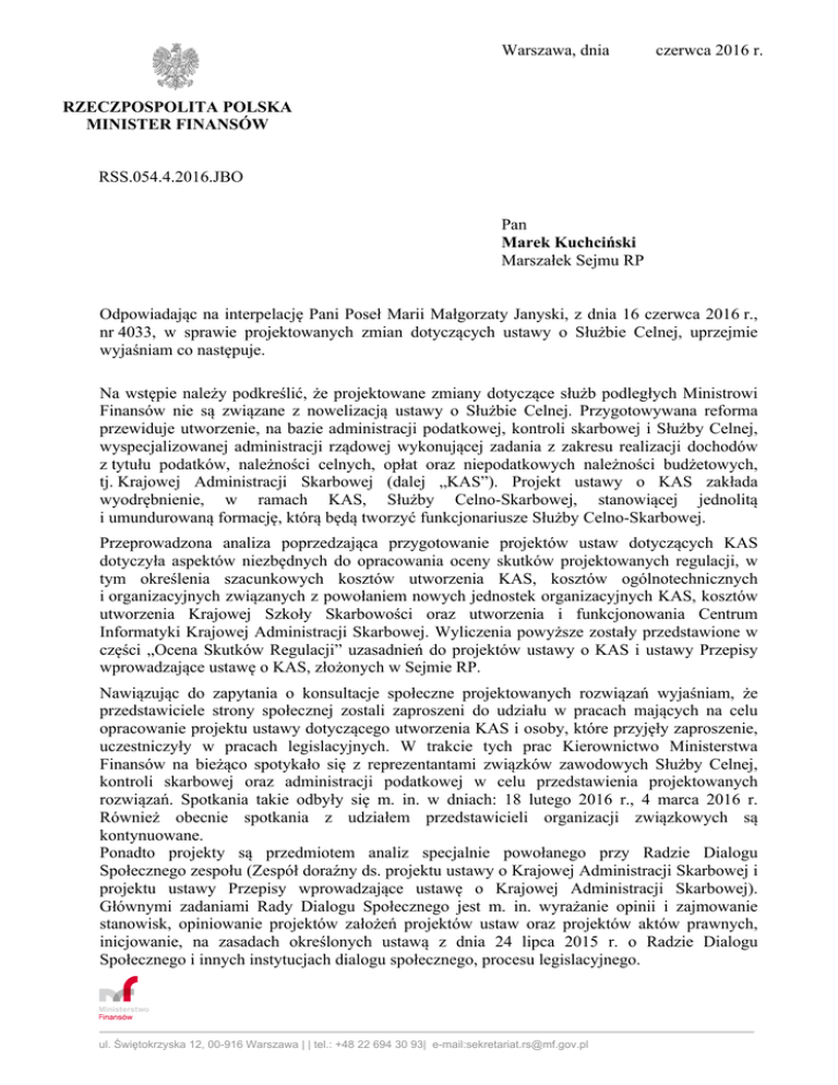 Warszawa, dnia czerwca 2016 r. RZECZPOSPOLITA POLSKA MINISTER FINANSÓW RSS.054.4.2016.JBO Pan Marek Kuchciński Marszałek Sejmu RP Odpowiadając na interpelację Pani Poseł Marii Małgorzaty Janyski, z dnia 16 czerwca 2016 r., nr 4033, w sprawie projektowanych zmian dotyczących ustawy o Służbie Celnej, uprzejmie wyjaśniam co następuje. Na wstępie należy podkreślić, że projektowane zmiany dotyczące służb podległych Ministrowi Finansów nie są związane z nowelizacją ustawy o Służbie Celnej. Przygotowywana reforma przewiduje utworzenie, na bazie administracji podatkowej, kontroli skarbowej i Służby Celnej, wyspecjalizowanej administracji rządowej wykonującej zadania z zakresu realizacji dochodów z tytułu podatków, należności celnych, opłat oraz niepodatkowych należności budżetowych, tj. Krajowej Administracji Skarbowej (dalej „KAS”). Projekt ustawy o KAS zakłada wyodrębnienie, w ramach KAS, Służby Celno-Skarbowej, stanowiącej jednolitą i umundurowaną formację, którą będą tworzyć funkcjonariusze Służby Celno-Skarbowej. Przeprowadzona analiza poprzedzająca przygotowanie projektów ustaw dotyczących KAS dotyczyła aspektów niezbędnych do opracowania oceny skutków projektowanych regulacji, w tym określenia szacunkowych kosztów utworzenia KAS, kosztów ogólnotechnicznych i organizacyjnych związanych z powołaniem nowych jednostek organizacyjnych KAS, kosztów utworzenia Krajowej Szkoły Skarbowości oraz utworzenia i funkcjonowania Centrum Informatyki Krajowej Administracji Skarbowej. Wyliczenia powyższe zostały przedstawione w części „Ocena Skutków Regulacji” uzasadnień do projektów ustawy o KAS i ustawy Przepisy wprowadzające ustawę o KAS, złożonych w Sejmie RP. Nawiązując do zapytania o konsultacje społeczne projektowanych rozwiązań wyjaśniam, że przedstawiciele strony społecznej zostali zaproszeni do udziału w pracach mających na celu opracowanie projektu ustawy dotyczącego utworzenia KAS i osoby, które przyjęły zaproszenie, uczestniczyły w pracach legislacyjnych. W trakcie tych prac Kierownictwo Ministerstwa Finansów na bieżąco spotykało się z reprezentantami związków zawodowych Służby Celnej, kontroli skarbowej oraz administracji podatkowej w celu przedstawienia projektowanych rozwiązań. Spotkania takie odbyły się m. in. w dniach: 18 lutego 2016 r., 4 marca 2016 r. Również obecnie spotkania z udziałem przedstawicieli organizacji związkowych są kontynuowane. Ponadto projekty są przedmiotem analiz specjalnie powołanego przy Radzie Dialogu Społecznego zespołu (Zespół doraźny ds. projektu ustawy o Krajowej Administracji Skarbowej i projektu ustawy Przepisy wprowadzające ustawę o Krajowej Administracji Skarbowej). Głównymi zadaniami Rady Dialogu Społecznego jest m. in. wyrażanie opinii i zajmowanie stanowisk, opiniowanie projektów założeń projektów ustaw oraz projektów aktów prawnych, inicjowanie, na zasadach określonych ustawą z dnia 24 lipca 2015 r. o Radzie Dialogu Społecznego i innych instytucjach dialogu społecznego, procesu legislacyjnego. ul. Świętokrzyska 12, 00-916 Warszawa | | tel.: +48 22 694 30 93| e-mail:[email protected] W dniu 3 czerwca br. projekty ustawy o KAS oraz ustawy Przepisy wprowadzające ustawę o KAS zostały złożone w Sejmie Rzeczypospolitej Polskiej jako projekty poselskie. W ramach prac sejmowych nad projektami zostały one w dniu 23 czerwca br. skierowane do konsultacji następujących podmiotów: Sądu Najwyższego, Prokuratora Generalnego, Krajowej Rady Sądownictwa, Prokuratorii Generalnej Skarbu Państwa, Narodowego Banku Polskiego, Komisji Nadzoru Finansowego, Naczelnej Rady Adwokackiej, Krajowej Rady Radców Prawnych, Krajowej Rady Doradców Podatkowych, Krajowej Rady Biegłych Rewidentów, Krajowej Izby Gospodarczej, Związku Banków Polskich, Krajowego Związku Banków Spółdzielczych, Spółdzielczej Kasy Oszczędnościowo-Kredytowej, Rady Dialogu Społecznego, Generalnego Inspektora Ochrony Danych Osobowych, Zakładu Ubezpieczeń Społecznych, Państwowej Inspekcji Pracy, Business Centre Club, Forum Związków Zawodowych, Konfederacji Lewiatan, Niezależnego Samorządnego Związku Zawodowego „Solidarność”, Ogólnopolskiego Porozumienia Związków Zawodowych, Pracodawców Rzeczypospolitej Polskiej i Związku Rzemiosła Polskiego). W tym samym terminie skierowano projekty również do opinii organizacji samorządowych. Zadania dotychczas wykonywane przez Służbę Celną będą realizowane w ramach KAS, w tym przez funkcjonariuszy Służby Celno-Skarbowej. Skumulowanie w jednolitych strukturach KAS zadań, obecnie realizowanych przez Służbę Celną, administrację podatkową oraz organy kontroli skarbowej, ma na celu uzyskanie m. in. większej efektywności działania organów celnych i podatkowych. Zakładane korzyści jakie ma przynieść utworzenie KAS dotyczą: 1) usprawnienia obsługi i wsparcia podatnika, w tym przedsiębiorcy w prawidłowym wypełnianiu obowiązków podatkowych i celnych, 2) umożliwienia efektywnego poboru podatków, 3) umożliwienia skutecznej egzekucji administracyjnej należności pieniężnych; 4) zmniejszenia luki podatkowej, 5) poprawy skuteczności i efektywności w zwalczaniu oszustw podatkowych i odzyskiwaniu zaległości podatkowych oraz celnych, 6) zwiększenia efektywności i skuteczności kontroli wywiązywania się przez podatników z zobowiązań podatkowych, 7) usprawnienia systemu zapewniającego bezpieczeństwo finansowe państwa, 8) wzmocnienia ochrony celnej granicy wschodniej Polski, która jest jednocześnie granicą Unii Europejskiej. Funkcjonowanie jednolitej administracji skarbowej niewątpliwie przyczyni się do usprawnienia współpracy oraz wymiany informacji między organami KAS. Wprowadzona reforma powinna również usprawnić współpracę z organami administracji państw Unii Europejskiej, co jest niezbędne z jednej strony ze względu na globalizację gos