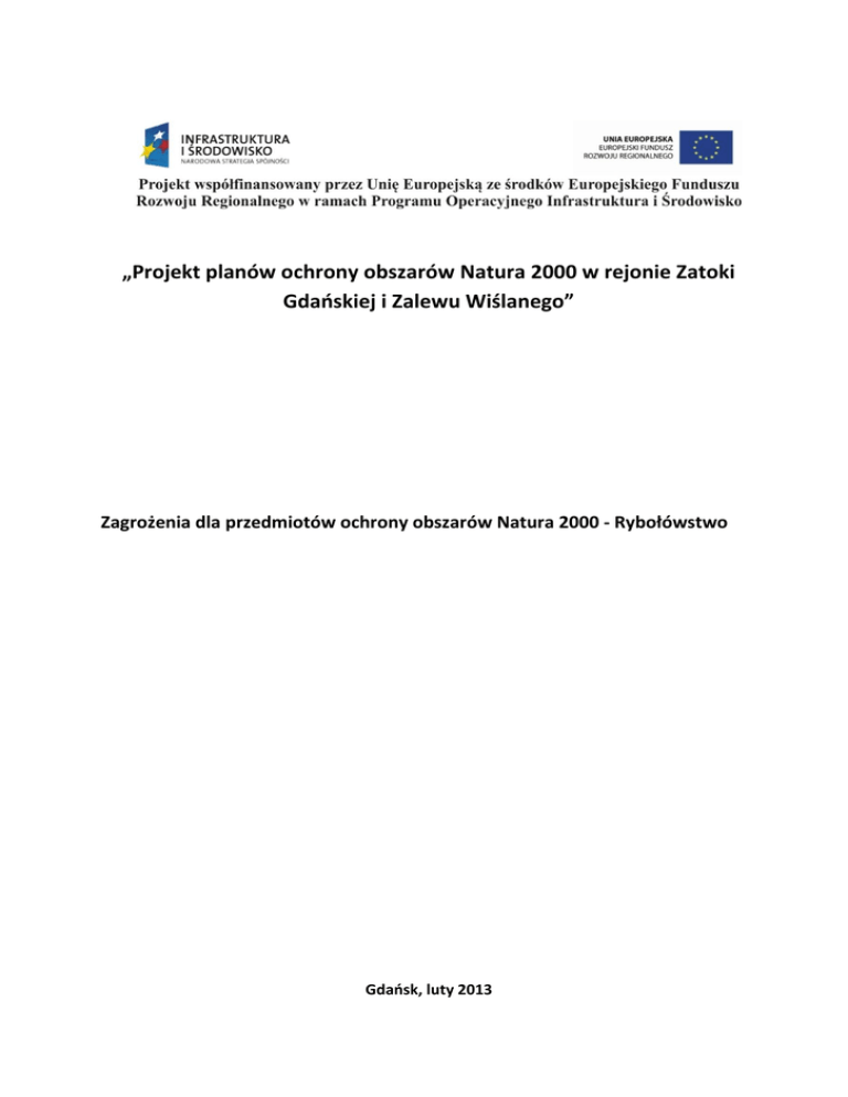 „Projekt planów ochrony obszarów Natura 2000 w rejonie Zatoki Gdańskiej i Zalewu Wiślanego” Zagrożenia dla przedmiotów ochrony obszarów Natura 2000 - Rybołówstwo Gdańsk, luty 2013 Wydawnictwa Wewnętrzne Instytutu Morskiego w Gdańsku Nr 6760 __________________________________________________________________________________ Praca zrealizowana w ramach umowy nr 02/IOW/POIŚ/2011 z dnia 15 kwietnia 2011 r. na zlecenie Urzędu Morskiego w Gdyni Autor: Piotr Pieckiel Kierownik Zadania: Lidia Kruk-Dowgiałło _________________________________________________________________________ Gdańsk, luty 2013 Spis treści Wstęp ......................................................................................................................................................... 4 Materiał i metoda ....................................................................................................................................... 6 Opracowanie wyników ............................................................................................................................... 8 1. Wielkości jednostki połowowej i intensywność prowadzonego rybołówstwa .............................. 8 2. Stosowane narzędzia połowowe .................................................................................................... 9 3. Cele połowu ukierunkowanego oraz przyłów (uwzględniając ptaki) ............................................. 9 4. Obserwacje wędkarstwa morskiego oraz nielegalnego połowu ryb ............................................ 12 5. Obserwacje ssaków morskich....................................................................................................... 13 Podsumowanie i ocena zagrożeń ............................................................................................................. 13 Literatura: ................................................................................................................................................. 14 Wstęp Poniższą pracę wykonano w ramach zadania pn.: „Opracowanie projektów planów ochrony obszarów Natura 2000 w rejonie Zatoki Gdańskiej i Zalewu Wiślanego” realizowanego w latach 20112014 na zlecenie UM w Gdyni. W celu rozpoznania skali potencjalnego oddziaływania zagrożeń, pn.: rybołówstwo i zbieranie zasobów wodnych (kod: F02), znajdującego się na Liście Referencyjnej Zagrożeń N2000, zastosowano jedną z metod - przeprowadzenie ankiety wśród aktywnie łowiących rybaków w następujących obszarach chronionych (rys. 1): a) Specjalnych Obszarach Ochrony Siedlisk (SOOS): Zatoka Pucka i Półwysep Helski PLH220032, Ostoja w Ujściu Wisły PLH220044; b) Obszarach Specjalnych Ochrony Ptaków (OSO): Zatoka Pucka PLB220005, Ujście Wisły PLB220004; Rysunek 1. Obszary Natura 2000 w granicach Zatoki Gdańskiej wykorzystywane przez ankietowanych rybaków Na podstawie uzyskanych informacji oceniono wpływ rybołówstwa i zbierania zasobów wodnych (kod: F02) z podziałem na: rybołówstwo bierne (kod: F02.01) rybołówstwo czynne (kod: F02.02) wędkarstwo (kod: F02.03) Zagrożenia z kategorii rybołówstwo i zbieranie zasobów wodnych (kod: F02) z Listy Referencyjnej Zagrożeń N2000 różnią się od sporządzonej przez Urząd Morski na potrzeby realizacji zadania listy zagrożeń : niszczenie zbiorowisk dennych roślin i zwierząt, śmiertelność w wyniku efektu kontaktu z narzędziem połowu, przyłów chronionych gatunków ryb, przyłów gatunków ptaków, przyłów gatunków ssaków, przyłów gatunków ryb poniżej wymiaru ochronnego, przełowienie, kłusownictwo, degradacja lokalnych, rodzimych zasobów genetycznych oraz niezamierzona introdukcja gatunków obcych; Wykonano analizę zgodnie ze wskazaniami Zamawiającego, dla zagadnień, dla których pozyskane dane z ankiet umożliwiały ocenę (szczegóły dot. oceny w metodyce). Analizowano potencjalny wpływ rybołówstwa i zbierania zasobów wodnych (kod: F02) na przedmioty ochrony siedlisk przyrodniczych z I załącznika Dyrektywy Siedliskowej i gatunków roślin i zwierząt z II załącznika Dyrektywy Siedliskowej znajdujących się w danych obszarach. Wyniki analizy ankiet są materiałem uzupełniającym informacje niezbędne do oceny zagrożeń, które pozyskiwane są również z opracowań naukowych oraz danych Centrum Monitoringu Rybołówstwa (przeanalizowane pozycje literaturowe są wyszczególnione w sprawozdaniu zbiorczym), która będzie wchodziła w skład końcowej oceny danego zagrożenia w dalszym etapie prac. Zatoka Gdańska, w której granicach znajdują się analizowane obszary chronione Natura 2000 (rys. 1) jest pod stałą presją rybołówstwa (Polański 2000, Jackowski 2002). Notuje się tu największe nakłady połowowe rybołówstwa przybrzeżnego w Polsce (ibidem). Lokalne, tradycyjne rybołówstwo przybrzeżne opiera się tutaj na stosowaniu stawnych narzędzi połowowych jak sieci skrzelowe, mieroże i żaki (ibidem). Skład gatunkowy oraz ilościowy połowów od 1960 do 2000 roku ulegał znacznym zmianom (Jackowski 1998, Jackowski 2002). W latach 60. i 70. ubiegłego stulecia zwiększony nakład połowowy obserwowano w wewnętrznej części Zatoki Gdańskiej, gdzie łowiono duże ilości ryb słodkowodnych takich jak szczupaki i płocie oraz dwuśrodowiskowe węgorze (Morawski 1982). Obecnie główne łowiska zlokalizowane są w zewnętrznej części Zatoki Gdańskiej, a połowy szczupaka, płoci i węgorza są incydentalne (CMR 2012). Obecny skład gatunkowy połowów zdominowany jest przez gatunki typowo morskie: dorsza, stornię, śledzia, szprota i dwuśrodowiskowe: troć i łososia (ibidem). Materiał i metoda Do pozyskania informacji opracowano ankietę, która zawierała 16 pytań. Jedno związane było z obserwacją morświnów, a 15 dotyczyło rybołówstwa. Pytania podzielono na dwie następujące grupy: pytania zamknięte (8 pytań), w odpowiedzi na które ankietowany zaznaczał „
