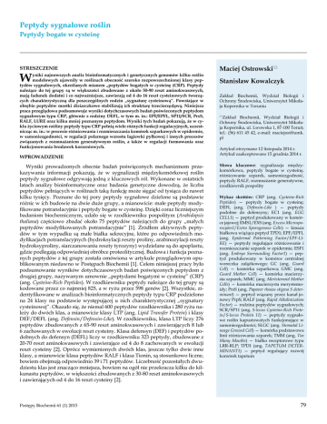 Peptydy sygnałowe roślin Peptydy bogate w cysteinę STRESZCZENIE W yniki najnowszych analiz bioinformatycznych i genetycznych genomów kilku roślin modelowych ujawniły w roślinach obecność szeroko rozpowszechnionej klasy peptydów sygnałowych, określanych mianem „peptydów bogatych w cysteinę (CRP). Peptydy należące do tej grupy są w większości zbudowane z około 50-90 reszt aminokwasowych, mają ładunek dodatni i co najważniejsze, zawierają od 4 do 16 reszt cysteinowych tworzących charakterystyczną dla poszczególnych rodzin „sygnaturę cysteinową”. Powstające w obrębie peptydów mostki disiarczkowe stabilizują ich strukturę trzeciorzędąwą. Niniejsza praca przeglądowa podsumowuje wyniki dotychczasowych badań poświeconych peptydom sygnałowym typu CRP, głównie z rodziny DEFL, w tym m. in.: EPF/EPFL, SP11/SCR, PrsS, RALF, LURE oraz kilku mniej poznanym peptydom. Wyniki tych badań pokazują, że w cyklu życiowym rośliny peptydy typu CRP pełnią wiele różnych funkcji regulacyjnych, uczestnicząc m. in.: w procesie różnicowania i rozmieszczania komórek szparkowych w epidermie, w samoniezgodności, w regulacji polarnego wzrostu łagiewki pyłkowej i innych procesów związanych z rozmnażaniem generatywnym roślin, a także w regulacji formowania oraz funkcjonowania brodawek korzeniowych. WPROWADZENIE Wyniki prowadzonych obecnie badań poświęconych mechanizmom przekazywania informacji pokazują, że w sygnalizacji międzykomórkowej roślin peptydy sygnałowe odgrywają jedną z kluczowych ról. Wykonane w ostatnich latach analizy bioinformatyczne oraz badania genetyczne dowodzą, że liczba peptydów pełniących w roślinach taką funkcję może sięgać od tysiąca do nawet kilku tysięcy. Poznane do tej pory peptydy sygnałowe dzielone są podstawie różnic w ich budowie na dwie duże grupy, a mianowicie: małe peptydy modyfikowane potranslacyjnie i peptydy bogate w cysteinę. Dzięki coraz liczniejszym badaniom biochemicznym, udało się w rzodkiewniku pospolitym (Arabidopsis thaliana) częściowo zbadać około 75 peptydów należących do grupy „małych peptydów modyfikowanych potranslacyjnie” [1]. Źródłem aktywnych peptydów w tym wypadku są małe białka sekrecyjne, które po odpowiednich modyfikacjach potranslacyjnych (hydroksylacji reszty proliny, arabinozylacji reszty hydroksyproliny, siarczanowaniu reszty tyrozyny) wydzielane są do apoplastu, gdzie podlegają odpowiedniej obróbce proteolitycznej. Budowa i funkcja poznanych peptydów z tej grupy została omówiona w artykule przeglądowym opublikowanym niedawno w Postępach Biochemii [1]. Celem niniejszej pracy było podsumowanie wyników dotychczasowych badań poświęconych peptydom z drugiej grupy, nazywanym umownie „peptydami bogatymi w cysteinę” (CRP) (ang. Cysteine-Rich Peptides). W rzodkiewniku peptydy należące do tej grupy są kodowane przez co najmniej 825, a w ryżu przez 598 genów [2]. Wszystkie, zidentyfikowane w analizach bioinformatycznych peptydy typu CRP podzielono na 24 klasy na podstawie występującej u nich charakterystycznej „sygnatury cysteinowej”. Okazało się, że niemal 600 peptydów rzodkiewnika i 280 ryżu należy do dwóch klas, a mianowicie klasy LTP (ang. Lipid Transfer Protein) i klasy DEF/DEFL (ang. Defensin/Defensin-Like). W rzodkiewniku, klasa LTP liczy 276 peptydów zbudowanych z 65-90 reszt aminokwasowych i zawierających 8 lub 6 zachowanych w ewolucji reszt cysteiny. Klasa defensyn (DEF) i peptydów podobnych do defensyn (DEFL) liczy w rzodkiewniku 323 peptydy, zbudowane z 20-70 reszt aminokwasowych i zawierające od 4 do 8 zachowanych w ewolucji reszt cysteiny [2]. Oprócz wymienionych dwóch klas, jeszcze tylko dwie inne klasy, a mianowicie klasa peptydów RALF i klasa Tionin, są stosunkowo liczne, bowiem obejmują odpowiednio 39 i 71 peptydów. Liczebność pozostałych dwudziestu klas jest znacząco mniejsza, bowiem na ogół nie przekracza kilku do kilkunastu peptydów, w większości zbudowanych z 30-80 reszt aminokwasowych i zawierających od 4 do 16 reszt cysteiny [2]. Postępy Biochemii 61 (1) 2015 Maciej Ostrowski Stanisław Kowalczyk Zakład Biochemii, Wydział Biologii i Ochrony Środowiska, Uniwersytet Mikołaja Kopernika w Toruniu Zakład Biochemii, Wydział Biologii i Ochrony Środowiska, Uniwersytet Mikołaja Kopernika, ul. Lwowska 1, 87-100 Toruń; tel.: (56) 611 45 42, e-mail: maciejost@umk. pl Artykuł otrzymano 12 listopada 2014 r. Artykuł zaakceptowano 15 grudnia 2014 r. Słowa kluczowe: sygnalizacja międzykomórkowa, peptydy bogate w cysteinę, różnicowanie szparek, samoniezgodność, peptydy RALF, rozmnażanie generatywne, rzodkiewnik pospolity Wykaz skrótów: CRP (ang. Cysteine-Rich Peptides) — peptydy bogate w cysteinę; DEFL (ang. Defensin-Like ) — peptydy podobne do defensyny; EC1 (ang. EGG CELL1) — peptyd produkowany w komórce jajowej; EMS1/EXS (ang. Excess Microsporocytes1/Extra Sporogenous Cells) — kinaza białkowa wiążąca peptyd TPD1; EPF/EPFL (ang. Epidermal Patterning Factor/EPF-LIKE) — peptydy regulujące różnicowanie i rozmieszczanie szparek w epidermie; ESF1 (ang. Embryo Surrounding Factor1) — peptyd produkowany w komórce centralnej woreczka zalążkowego; GC (ang. Guard Cell) — komórka szparkowa; GMC (ang. Guard Mother Cell) — komórka macierzysta szparek; MMC (ang. Meristemoid Mother Cells) — komórka macierzysta merystemoidy; PrsS (ang. Papaver rhoeas stigma S determinant) — peptyd wiązany przez kanał jonowy PrpS; RALF (ang. Rapid Alkalinization Factor) — rodzina peptydów sygnałowych; SCR/SP11 (ang. S-locus Cysteine-Rich Protein/S-locus Protein 11) — peptydy sygnałowe roślin kapustowatych funkcjonujące w samoniezgodności; SLGC (ang. Stomatal Lineage Ground Cell) — komórka podstawowa linii różnicowania szparek; TMM (ang. Too Many Mouths) — białko receptorowe typu LRR-RLP; TPD1 (ang. TAPETUM DETERMINANT1) — peptyd regulujący roz
