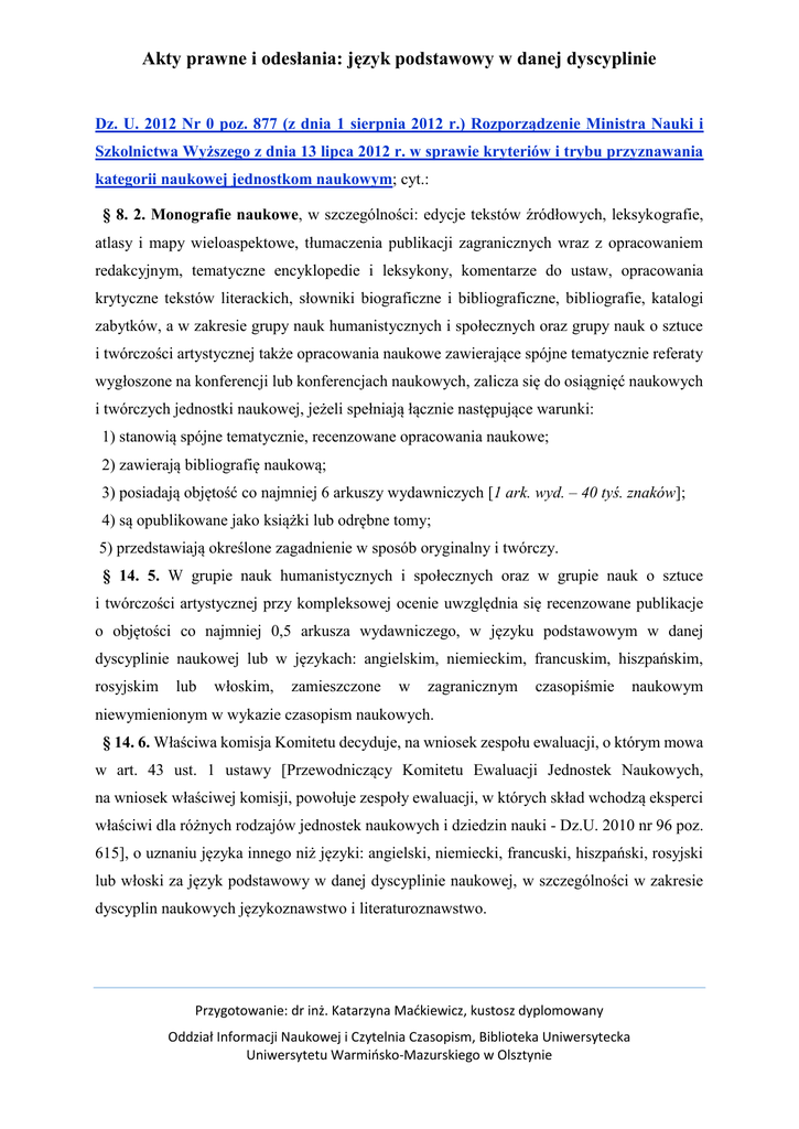 Akty prawne i odesłania: język podstawowy w danej dyscyplinie Dz. U. 2012 Nr 0 poz. 877 (z dnia 1 sierpnia 2012 r.) Rozporządzenie Ministra Nauki i Szkolnictwa Wyższego z dnia 13 lipca 2012 r. w sprawie kryteriów i trybu przyznawania kategorii naukowej jednostkom naukowym; cyt.: § 8. 2. Monografie naukowe, w szczególności: edycje tekstów źródłowych, leksykografie, atlasy i mapy wieloaspektowe, tłumaczenia publikacji zagranicznych wraz z opracowaniem redakcyjnym, tematyczne encyklopedie i leksykony, komentarze do ustaw, opracowania krytyczne tekstów literackich, słowniki biograficzne i bibliograficzne, bibliografie, katalogi zabytków, a w zakresie grupy nauk humanistycznych i społecznych oraz grupy nauk o sztuce i twórczości artystycznej także opracowania naukowe zawierające spójne tematycznie referaty wygłoszone na konferencji lub konferencjach naukowych, zalicza się do osiągnięć naukowych i twórczych jednostki naukowej, jeżeli spełniają łącznie następujące warunki: 1) stanowią spójne tematycznie, recenzowane opracowania naukowe; 2) zawierają bibliografię naukową; 3) posiadają objętość co najmniej 6 arkuszy wydawniczych [1 ark. wyd. – 40 tyś. znaków]; 4) są opublikowane jako książki lub odrębne tomy; 5) przedstawiają określone zagadnienie w sposób oryginalny i twórczy. § 14. 5. W grupie nauk humanistycznych i społecznych oraz w grupie nauk o sztuce i twórczości artystycznej przy kompleksowej ocenie uwzględnia się recenzowane publikacje o objętości co najmniej 0,5 arkusza wydawniczego, w języku podstawowym w danej dyscyplinie naukowej lub w językach: angielskim, niemieckim, francuskim, hiszpańskim, rosyjskim lub włoskim, zamieszczone w zagranicznym czasopiśmie naukowym niewymienionym w wykazie czasopism naukowych. § 14. 6. Właściwa komisja Komitetu decyduje, na wniosek zespołu ewaluacji, o którym mowa w art. 43 ust. 1 ustawy [Przewodniczący Komitetu Ewaluacji Jednostek Naukowych, na wniosek właściwej komisji, powołuje zespoły ewaluacji, w których skład wchodzą eksperci właściwi dla różnych rodzajów jednostek naukowych i dziedzin nauki - Dz.U. 2010 nr 96 poz. 615], o uznaniu języka innego niż języki: angielski, niemiecki, francuski, hiszpański, rosyjski lub włoski za język podstawowy w danej dyscyplinie naukowej, w szczególności w zakresie dyscyplin naukowych językoznawstwo i literaturoznawstwo. Przygotowanie: dr inż. Katarzyna Maćkiewicz, kustosz dyplomowany Oddział Informacji Naukowej i Czytelnia Czasopism, Biblioteka Uniwersytecka Uniwersytetu Warmińsko-Mazurskiego w Olsztynie Akty prawne i odesłania: język podstawowy w danej dyscyplinie Załącznik nr 4 KARTA KOMPLEKSOWEJ OCENY JEDNOSTKI NAUKOWEJ dla grupy nauk humanistycznych i społecznych (dotyczy nauk humanistycznych, nauk teologicznych, nauk społecznych, nauk ekonomicznych i nauk prawnych) I. OSIĄGNIĘCIA NAUKOWE I TWÓRCZE 1. Publikacje w czasopismach naukowych: Lp. 4. Publikacja w innym zagranicznym czasopiśmie naukowym, w języku podstawowym w danej dyscyplinie naukowej lub językach: angielskim, niemieckim, francuskim, hiszpańskim, rosyjskim lub włoskim (uwzględnia się publikacje o objętości co najmniej 0,5 arkusza wydawniczego) – 4 pkt 2. Monografie naukowe: Lp. 1. Autorstwo monografii naukowej w języku podstawowym w danej dyscyplinie naukowej lub w językach: angielskim, niemieckim, francuskim, hiszpańskim, rosyjskim lub włoskim – 25 pkt Lp. 2. Autorstwo monografii naukowej w języku polskim (jeżeli język polski nie jest językiem podstawowym w danej dyscyplinie naukowej) lub w języku innym niż języki: angielski, niemiecki, francuski, hiszpański, rosyjski lub włoski – 20 pkt Lp. 3. Autorstwo rozdziału w monografii naukowej w języku podstawowym w danej dyscyplinie naukowej lub w językach: angielskim, niemieckim, francuskim, hiszpańskim, rosyjskim lub włoskim – 5 pkt Lp. 4. Autorstwo rozdziału w monografii naukowej w języku polskim (jeżeli język polski nie jest językiem podstawowym w danej dyscyplinie naukowej) lub w języku innym niż języki: angielski, niemiecki, francuski, hiszpański, rosyjski lub włoski – 4 pkt Lp. 5. Redakcja naukowa monografii wieloautorskiej w języku podstawowym w danej dyscyplinie naukowej lub w językach: angielskim, niemieckim, francuskim, hiszpańskim, rosyjskim lub włoskim – 5 pkt Lp. 6. Redakcja naukowa monografii naukowej wieloautorskiej w języku polskim (jeżeli język polski nie jest językiem podstawowym w danej dyscyplinie naukowej) lub w języku innym niż: angielski, niemiecki, francuski, hiszpański, rosyjski lub włoski – 4 pkt Przygotowanie: dr inż. Katarzyna Maćkiewicz, kustosz dyplomowany Oddział Informacji Naukowej i Czytelnia Czasopism, Biblioteka Uniwersytecka Uniwersytetu Warmińsko-Mazurskiego w Olsztynie Akty prawne i odesłania: język podstawowy w danej dyscyplinie "Często zadawane pytania" - odpowiedzi na pytania związane z kompleksową oceną działalności naukowej i badawczo-rozwojowej jednostek naukowych (MNiSW) [I kwartał 2013 r.]; cyt.: Pytanie nr 42. Co oznacza termin: „Język podstawowy w danej dyscyplinie naukowej”? Odp. MNiSW. Termin ten oznacza język, który w procesie kompleksowej oceny jednostek naukowych jest traktowany w danej dyscyplinie naukowej – z uwagi na jej specyfikę – w zakresie stosowanej punktacji analogicznie jak języki angielski, niemiecki, francuski, hiszpański rosyjski lub włoski w innych dyscyplinach naukowych. O uznaniu języka za podstawowy w danej dyscyplinie naukowej decyduje właściwa komisja Komitetu Ewaluacji Jednostek Naukowych na wniosek zespołu ewaluacji, w skład którego wchodzą eksperci właściwi dla dziedzin nauki i rodzajów ocenianych jednostek naukowych. KEJN-80 13-14 lutego 2013 r.: Protokół nr 2/2013 posiedzenia Komitetu Ewaluacji Jednostek Naukowych w dniu 10 stycznia 2013 r. w siedzibie Ministerstwa Nauki i Szkolnictwa Wyższego; cyt.: Ad. 8. Przewodnicz