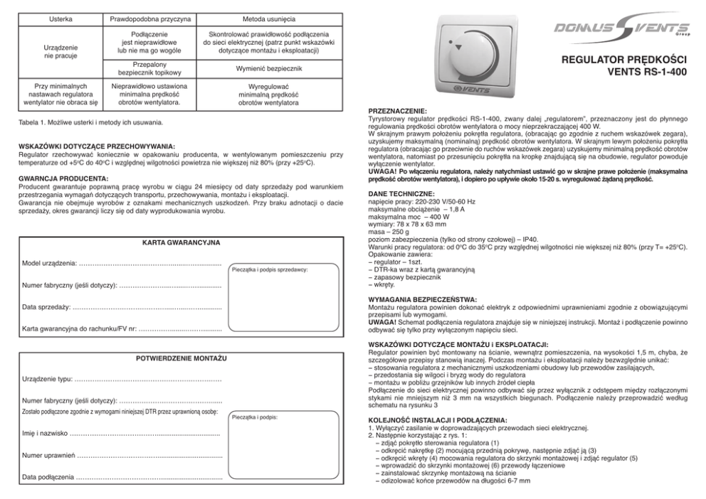 Usterka Urządzenie nie pracuje Przy minimalnych nastawach regulatora wentylator nie obraca się Prawdopodobna przyczyna Metoda usunięcia Podłączenie jest nieprawidłowe lub nie ma go wogóle Skontrolować prawidłowość podłączenia do sieci elektrycznej (patrz punkt wskazówki dotyczące montażu i eksploatacji) Nieprawidłowo ustawiona minimalna prędkość obrotów wentylatora. Wyregulować minimalną prędkość obrotów wentylatora Przepalony bezpiecznik topikowy Tabela 1. Możliwe usterki i metody ich usuwania. Wymienić bezpiecznik WSKAZÓWKI DOTYCZĄCE PRZECHOWYWANIA: Regulator rzechowywać koniecznie w opakowaniu producenta, w wentylowanym pomieszczeniu przy temperaturze od +5oC do 40oC i względnej wilgotności powietrza nie większej niż 80% (przy +25oC). GWARNCJA PRODUCENTA: Producent gwarantuje poprawną pracę wyrobu w ciągu 24 miesięcy od daty sprzedaży pod warunkiem przestrzegania wymagań dotyczących transportu, przechowywania, montażu i eksploatacji. Gwarancja nie obejmuje wyrobów z oznakami mechanicznych uszkodzeń. Przy braku adnotacji o dacie sprzedaży, okres gwarancji liczy się od daty wyprodukowania wyrobu. KARTA GWARANCYJNA Model urządzenia: …………………………………….......……............ Numer fabryczny (jeśli dotyczy): …………………...…....……............ Pieczątka i podpis sprzedawcy: Karta gwarancyjna do rachunku/FV nr: …………….......………......... POTWIERDZENIE MONTAŻU Urządzenie typu: ………………………………………………………… Zostało podłączone zgodnie z wymogami niniejszej DTR przez uprawnioną osobę: Imię i nazwisko ………………………………….................................. Numer uprawnień ………………………………................................... Data podłączenia …………………………………................................ PRZEZNACZENIE: Tyrystorowy regulator prędkości RS-1-400, zwany dalej „regulatorem”, przeznaczony jest do płynnego regulowania prędkości obrotów wentylatora o mocy nieprzekraczającej 400 W. W skrajnym prawym położeniu pokrętła regulatora, (obracając go zgodnie z ruchem wskazówek zegara), uzyskujemy maksymalną (nominalną) prędkość obrotów wentylatora. W skrajnym lewym położeniu pokrętła regulatora (obracając go przeciwnie do ruchów wskazówek zegara) uzyskujemy minimalną prędkość obrotów wentylatora, natomiast po przesunięciu pokrętła na kropkę znajdującą się na obudowie, regulator powoduje wyłączenie wentylator. UWAGA! Po włączeniu regulatora, należy natychmiast ustawić go w skrajne prawe położenie (maksymalna prędkość obrotów wentylatora), i dopiero po upływie około 15-20 s. wyregulować żądaną prędkość. DANE TECHNICZNE: napięcie pracy: 220-230 V/50-60 Hz maksymalne obciążenie – 1,8 A maksymalna moc – 400 W wymiary: 78 x 78 x 63 mm masa – 250 g poziom zabezpieczenia (tylko od strony czołowej) – IP40. Warunki pracy regulatora: od 0oC do 35oC przy względnej wilgotności nie większej niż 80% (przy T= +25oC). Opakowanie zawiera: − regulator – 1szt. − DTR-ka wraz z kartą gwarancyjną − zapasowy bezpiecznik − wkręty. WYMAGANIA BEZPIECZEŃSTWA: Montażu regulatora powinien dokonać elektryk z odpowiednimi uprawnieniami zgodnie z obowiązującymi przepisami lub wymogami. UWAGA! Schemat podłączenia regulatora znajduje się w niniejszej instrukcji. Montaż i podłączenie powinno odbywać się tylko przy wyłączonym napięciu sieci. Data sprzedaży: ……………………………………...…....……............ Numer fabryczny (jeśli dotyczy): ……………………………………..... REGULATOR PRĘDKOŚCI VENTS RS-1-400 Pieczątka i podpis: WSKAZÓWKI DOTYCZĄCE MONTAŻU i EKSPLOATACJI: Regulator powinien być montowany na ścianie, wewnątrz pomieszczenia, na wysokości 1,5 m, chyba, że szczegółowe przepisy stanowią inaczej. Podczas montażu i eksploatacji należy bezwzględnie unikać: − stosowania regulatora z mechanicznymi uszkodzeniami obudowy lub przewodów zasilających, − przedostania się wilgoci i bryzg wody do regulatora − montażu w pobliżu grzejników lub innych źródeł ciepła Podłączenie do sieci elektrycznej powinno odbywać się przez wyłącznik z odstępem między rozłączonymi stykami nie mniejszym niż 3 mm na wszystkich biegunach. Podłączenie należy przeprowadzić według schematu na rysunku 3 KOLEJNOŚĆ INSTALACJI I PODŁĄCZENIA: 1. Wyłączyć zasilanie w doprowadzających przewodach sieci elektrycznej. 2. Następnie korzystając z rys. 1: − zdjąć pokrętło sterowania regulatora (1) − odkręcić nakrętkę (2) mocującą przednią pokrywę, następnie zdjąć ją (3) − odkręcić wkręty (4) mocowania regulatora do skrzynki montażowej i zdjąć regulator (5) − wprowadzić do skrzynki montażowej (6) przewody łączeniowe − zainstalować skrzynkę montażową na ścianie − odizolować końce przewodów na długości 6-7 mm − podłączyć przewody do zacisków położonych na płycie regulatora zgodnie ze schematem podłączenia (rys. 3) − zainstalować regulator w skrzynce montażowej w taki sposób, aby zaciski (patrz rys. 2) znajdowały się na górze, następnie przymocować wkrętami Dla prawidłowej pracy konieczne jest, ustawienie minimalnej prędkości obrotów wentylatora. W tym celu należy: − skręcić pokrętło sterowania w stronę przeciwną do ruchów wskazówek zegara do położenia skrajnego, zostawiwszy regulator w stanie włączonym (nie doprowadzając do wyłączenia) − podać zasilanie elektryczne − za pomocą śrubokrętu z izolowaną rękojeścią obracać suwak potencjometru (patrz rys. 2), doprowadzając prędkość obrotów wentylatora do żądanej − ustawić regulator w położenie „wyłączono” (obracać w kierunku przeciwnym do wskazówek zegara), poczekać do zatrzymania się obrotów wentylatora − wł