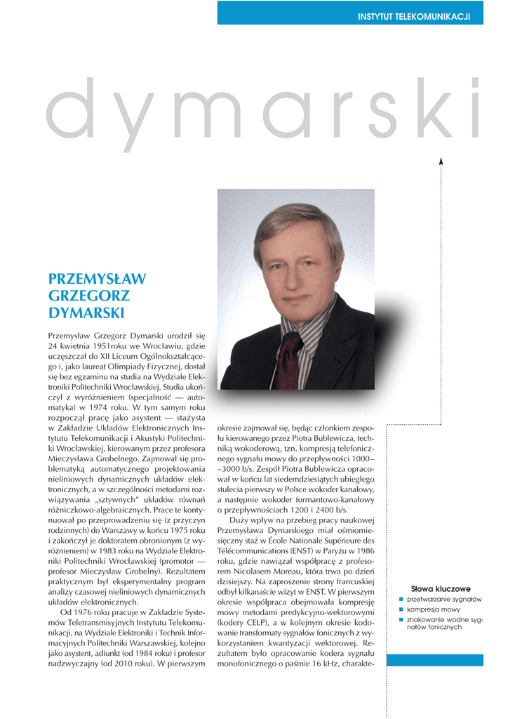 INSTYTUT TELEKOMUNIKACJI dymarski PRZEMYS£AW GRZEGORZ DYMARSKI Przemys³aw Grzegorz Dymarski urodzi³ siê 24 kwietnia 1951roku we Wroc³awiu, gdzie uczêszcza³ do XII Liceum Ogólnokszta³c¹cego i, jako laureat Olimpiady Fizycznej, dosta³ siê bez egzaminu na studia na Wydziale Elektroniki Politechniki Wroc³awskiej. Studia ukoñczy³ z wyró¿nieniem (specjalnoœæ — automatyka) w 1974 roku. W tym samym roku rozpocz¹³ pracê jako asystent — sta¿ysta w Zak³adzie Uk³adów Elektronicznych Instytutu Telekomunikacji i Akustyki Politechniki Wroc³awskiej, kierowanym przez profesora Mieczys³awa Grobelnego. Zajmowa³ siê problematyk¹ automatycznego projektowania nieliniowych dynamicznych uk³adów elektronicznych, a w szczególnoœci metodami rozwi¹zywania „sztywnych” uk³adów równañ ró¿niczkowo-algebraicznych. Prace te kontynuowa³ po przeprowadzeniu siê (z przyczyn rodzinnych) do Warszawy w koñcu 1975 roku i zakoñczy³ je doktoratem obronionym (z wyró¿nieniem) w 1983 roku na Wydziale Elektroniki Politechniki Wroc³awskiej (promotor — profesor Mieczys³aw Grobelny). Rezultatem praktycznym by³ eksperymentalny program analizy czasowej nieliniowych dynamicznych uk³adów elektronicznych. Od 1976 roku pracuje w Zak³adzie Systemów Teletransmisyjnych Instytutu Telekomunikacji, na Wydziale Elektroniki i Technik Informacyjnych Politechniki Warszawskiej, kolejno jako asystent, adiunkt (od 1984 roku) i profesor nadzwyczajny (od 2010 roku). W pierwszym okresie zajmowa³ siê, bêd¹c cz³onkiem zespo³u kierowanego przez Piotra Bublewicza, technik¹ wokoderow¹, tzn. kompresj¹ telefonicznego sygna³u mowy do przep³ywnoœci 1000 – –3000 b/s. Zespó³ Piotra Bublewicza opracowa³ w koñcu lat siedemdziesi¹tych ubieg³ego stulecia pierwszy w Polsce wokoder kana³owy, a nastêpnie wokoder formantowo-kana³owy o przep³ywnoœciach 1200 i 2400 b/s. Du¿y wp³yw na przebieg pracy naukowej Przemys³awa Dymarskiego mia³ oœmiomiesiêczny sta¿ w École Nationale Supérieure des Télécommunications (ENST) w Pary¿u w 1986 roku, gdzie nawi¹za³ wspó³pracê z profesorem Nicolasem Moreau, która trwa po dzieñ dzisiejszy. Na zaproszenie strony francuskiej odby³ kilkanaœcie wizyt w ENST. W pierwszym okresie wspó³praca obejmowa³a kompresjê mowy metodami predykcyjno-wektorowymi (kodery CELP), a w kolejnym okresie kodowanie transformaty sygna³ów fonicznych z wykorzystaniem kwantyzacji wektorowej. Rezultatem by³o opracowanie kodera sygna³u monofonicznego o paœmie 16 kHz, charakte- Słowa kluczowe n przetwarzanie sygnałów n kompresja mowy n znakowanie wodne sygnałów fonicznych INSTYTUT TELEKOMUNIKACJI D ryzuj¹cego siê zmienn¹ przep³ywnoœci¹ binarn¹ (od 32 do 64 kb/s). W ostatnim okresie wspó³praca z Nicolasem Moreau koncentruje siê wokó³ problemów znakowania wodnego sygna³ów fonicznych i „rzadkiego” modelowania sygna³ów w zastosowaniu do kompresji mowy. Zdobyte doœwiadczenia zosta³y wykorzystane w pracy zamówionej przez KBN dotycz¹cej m.in. opracowania kodera sygna³u mowy o zmiennej przep³ywnoœci binarnej (2.4/4.8/8.0 kb/s). We wspó³pracy z Wojskowym Instytutem £¹cznoœci i firm¹ i Tel-KA powsta³ równie¿ wokoder radiowy, dla „cyfryzacji” radiostacji krótkofalowych. Innym kierunkiem zainteresowañ naukowych Przemys³awa Dymarskiego jest synteza mowy z tekstu i rozpoznawanie mowy. We wspó³pracy z Arturem Janickim, S³awomirem Kul¹ oraz firm¹ ELAN-Informatique z Tuluzy, bra³ udzia³ w opracowaniu modelu syntezatora difonowego, umo¿liwiaj¹cego sterowanie intonacj¹ na poziomie wyrazowym i zdaniowym. Od kilku lat prowadzi równie¿ prace nad pomiarami jakoœci sygna³u mowy, muzyki i obrazu ruchomego — w zastosowaniu do badañ jakoœci us³ug telekomunikacyjnych. Przemys³aw Dymarski kieruje Zespo³em Przetwarzania Sygna³u Mowy, z³o¿onym z pracowników i doktorantów Zak³adu Systemów Teletransmisyjnych. Wyniki prac Przemys³awa Dymarskiego w dziedzinie kompresji mowy i innych sygna³ów akustycznych zosta³y opublikowane w rozprawie habilitacyjnej Predykcyjne i wektorowe metody kompresji sygna³u mowy, obronionej w koñcu 2003 roku. Swoje doœwiadczenia w pracy naukowej i in ¿y nier skiej wy ko rzy stu je w dy dak ty ce i kszta³ceniu kadry na Wydziale Elektroniki i Technik Informacyjnych. Ma g³ówny udzia³ w opracowaniu i prowadzeniu wyk³adów i laboratoriów: „Przetwarzanie sygna³ów w telekomunikacji”, „Podstawy teoretyczne multimediów”, oraz pewien udzia³ w przedmiotach „Podstawy transmisji cyfrowej”, „Systemy teletransmisyjne” i „Communications”. Jest wspó³autorem 2 skryptów wydanych w Wydawnictwach Politechniki Warszawskiej, prowadzi³ kilkadziesi¹t prac dyplomowych i 3 doktorskie (jedna praca po obronie). Na Wydziale Elektroniki i Technik Informacyjnych kieruje specjalnoœci¹ Sieci i systemy telekomunikacyjne, jest cz³onkiem Wydzia³owej Komisji Akredytacji Przedmiotów i Komisji Wyborczej. Jest te¿ cz³onkiem Komitetu Technicznego ds. Multimediów Polskiego Komitetu Normalizacyjnego, koordynuje prace nad t³umaczeniem norm ITU i ETSI. Mieszka w podwarszawskim Konstancinie-Jeziornej, lubi góry latem i zim¹, ma dwie córki — harfistki.