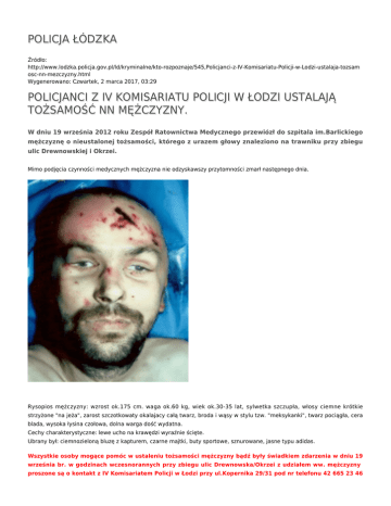 POLICJA ŁÓDZKA Źródło: http://www.lodzka.policja.gov.pl/ld/kryminalne/kto-rozpoznaje/545,Policjanci-z-IV-Komisariatu-Policji-w-Lodzi-ustalaja-tozsam osc-nn-mezczyzny.html Wygenerowano: Czwartek, 2 marca 2017, 03:29 POLICJANCI Z IV KOMISARIATU POLICJI W ŁODZI USTALAJĄ TOŻSAMOŚĆ NN MĘŻCZYZNY. W dniu 19 września 2012 roku Zespół Ratownictwa Medycznego przewiózł do szpitala im.Barlickiego mężczyznę o nieustalonej tożsamości, którego z urazem głowy znaleziono na trawniku przy zbiegu ulic Drewnowskiej i Okrzei. Mimo podjęcia czynności medycznych mężczyzna nie odzyskawszy przytomności zmarł następnego dnia. Rysopios mężczyzny: wzrost ok.175 cm. waga ok.60 kg, wiek ok.30-35 lat, sylwetka szczupła, włosy ciemne krótkie strzyżone "na jeża", zarost szczotkowaty okalajacy całą twarz, broda i wąsy w stylu tzw. "meksykanki", twarz pociągła, cera blada, wysoka łysina czołowa, dolna warga dość wydatna. Cechy charakterystyczne: lewe ucho na krawędzi wyraźnie ścięte. Ubrany był: ciemnozieloną bluzę z kapturem, czarne majtki, buty sportowe, sznurowane, jasne typu adidas. Wszystkie osoby mogące pomóc w ustaleniu tożsamości mężczyzny bądź były świadkiem zdarzenia w dniu 19 września br. w godzinach wczesnorannych przy zbiegu ulic Drewnowska/Okrzei z udziałem ww. mężczyzny proszone są o kontakt z IV Komisariatem Policji w Łodzi przy ul.Kopernika 29/31 pod nr telefonu 42 665 23 46 w godz.8-16 lub całodobowo 42 665 23 00 i 997. Ocena: 0/5 (0) Tweetnij
