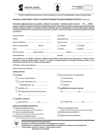 Projekt współfinansowany przez Unię Europejską w ramach Europejskiego Funduszu Społecznego Szkolenie: KURS KADRY I PŁACE Z WYKORZYSTANIEM TECHNIK INFORMATYCZNYCH (96 godziny) Formularz zgłoszeniowy do projektu „Otwarci na wiedzę – konkurencyjni w pracy” Nr ……/2012 (Prosimy o czytelne wypełnienie formularza drukowanymi literami. Wypełniony formularz prosimy wysłać pocztą lub złożyć w biurze realizacji projektu w Gminnym Centrum Informacji przy ul. Żyrardowskiej 4, 96-320 Mszczonów. Złożenie niniejszego kwestionariusza nie gwarantuje uczestnictwa w szkoleniu. Złożenie formularza jest pierwszym etapem rekrutacji na szkolenie.) imię (imiona) ………………….……………………………. nazwisko PESEL ……………………….………………………. wykształcenie ……………………………………………. numer telefonu …………………….…………………………. adres zamieszkania ulica obszar …………………….…………………………. adres e-mail ……………………………………………. ……………………………………………. miejski nr domu ............ wiejski nr lokalu ................... kod pocztowy ……-……… miejscowość ………………………………………... gmina …………………….…………………… województwo ………………………………….……………. powiat ………………………………….……………………. W rozumieniu art. 25 Kodeksu Cywilnego „Miejscem zamieszkania osoby fizycznej jest miejscowość, w której osoba ta przebywa z zamiarem stałego pobytu” oraz art. 5.1 Ustawy o ewidencji ludności i dowodach osobistych „Osoba (…) jest zobowiązana zameldować się w miejscu stałego pobytu”. dokładna nazwa pracodawcy ……………………………………………………………………………………………………………… pełny adres pracodawcy ……………………………….……………………………………………………………………………………. rodzaj umowy: o pracę: stosunek pracy na podstawie: na czas nieokreślony mianowania na czas określony, do …………………….. powołania zastępstwo, do …………………………. wyboru próbny, do …………………………………….. spółdzielcza umowa o pracę do wykonywania określonej pracy, od …….….…….……..…… do ……………………..…… do ……………………………………………… cywilno- prawna: zlecenie od …………..…… do …………..…… rodzaj przedsiębiorstwa/firmy: mikroprzedsiębiorstwo o dzieło od …………..…… do …………..…… duże przedsiębiorstwo (liczba zatrudnionych do 9 pracowników) (liczba zatrudnionych powyżej 249 pracowników) małe przedsiębiorstwo administracja publiczna (liczba zatrudnionych do 49 pracowników) średnie przedsiębiorstwo organizacja pozarządowa (liczba zatrudnionych do 249 pracowników) Priorytet VIII. Regionalne kadry gospodarki Działanie 8.1. Rozwój pracowników i przedsiębiorstw w regionie Poddziałanie 8.1.1 Wspieranie rozwoju kwalifikacji zawodowych i doradztwa dla przedsiębiorstw Tytuł projektu: Otwarci na wiedzę – konkurencyjni w pracy POKL.08.01.01-14-454/09 Projekt współfinansowany przez Unię Europejską w ramach Europejskiego Funduszu Społecznego Ja niżej podpisany/-a oświadczam, iż przyjmuję do wiadomości, że: moje dane osobowe będą przetwarzane wyłącznie w celu rekrutacji do Projektu; spełniam kryteria kwalifikacyjne uprawniające mnie do udziału w projekcie i zgłaszam zainteresowanie nabyciem nowych, uzupełnianiem lub podwyższeniem kwalifikacji i umiejętności z własnej inicjatywy poza godzinami i miejscem pracy, niezależnie od pracodawcy, poprzez udział w projekcie „Otwarci na wiedzę - konkurencyjni w pracy” realizowanym przez Gminę Mszczonów/ Gminne Centrum Informacji; dane zawarte w formularzu są zgodne ze stanem prawnym i faktycznym; jestem świadomy/-a odpowiedzialności prawnej, jaką poniosę w przypadku podania nieprawdziwych danych; jednocześnie zobowiązuję się do poinformowania Biura Projektu (Gminne Centrum Informacji) w przypadku, gdy podane dane ulegną zmianie; oświadczam, że zapoznałem/-am się z treścią Regulaminu rekrutacji i uczestnictwa w projekcie. ……………………………………. ………………………………………………… miejscowość i data czytelny podpis deklaracja dotycząca preferowanych dni szkolenia preferowane dni zajęć: poniedziałek wtorek środa czwartek piątek sobota niedziela a) zajęcia w tygodniu (od poniedziałku do piątku) odbywają od godziny 17.00. b) zajęcia w weekendy (sobota, niedziela) odbywają się od godziny 9.00. deklaracja dotycząca zainteresowania działaniami towarzyszącymi koszt dojazdu na szkolenie: tak nie opieka nad małymi dziećmi (3-7 lat) podczas szkolenia: tak, data urodzenia dziecka/ dzieci: …………………………………………………………………………………………………. nie nie dotyczy ……………………………………. miejscowość i data ………………………………………………… czytelny podpis Priorytet VIII. Regionalne kadry gospodarki Działanie 8.1. Rozwój pracowników i przedsiębiorstw w regionie Poddziałanie 8.1.1 Wspieranie rozwoju kwalifikacji zawodowych i doradztwa dla przedsiębiorstw Tytuł projektu: Otwarci na wiedzę – konkurencyjni w pracy POKL.08.01.01-14-454/09