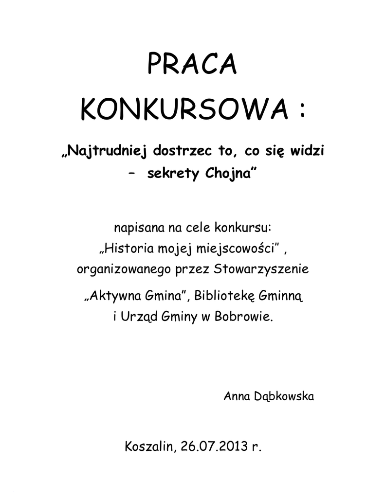 PRACA KONKURSOWA : „Najtrudniej dostrzec to, co się widzi – sekrety Chojna” napisana na cele konkursu: „Historia mojej miejscowości’’ , organizowanego przez Stowarzyszenie „Aktywna Gmina”, Bibliotekę Gminną i Urząd Gminy w Bobrowie. Anna Dąbkowska Koszalin, 26.07.2013 r. „Najtrudniej dostrzec to, co się widzi - sekrety Chojna” „Dzieje ludzkości są zapisane historią rodzin” – takie motto towarzyszyło mi przy napisaniu tych mini wspomnień, gdy w Internecie, na stronie Gminy Bobrowo, przeczytałam informację o konkursie „ Historia mojej miejscowości”. Pochodzę ze wsi Chojno. Tam spędziłam swoje dzieciństwo i młodość. Od 23 lat mieszkam i pracuję w Koszalinie. Obrazy wiejskiego życia często przywołuję w pamięci, w której też zapisane są wspomnienia i relacje nieżyjących już dziadków i rodziców. Długoletnimi mieszkańcami Chojna byli wspomniani wyżej dziadkowie Celmerowie. Pokochali się w czasach odradzającej się Polski, na pograniczu granic pruskiej i rosyjskiej. Związek małżeński zawarli w 1923 roku. Dziadek Izydor pochodził z zaboru rosyjskiego, urodził się w 1899 r. w Łapinożu, do szkoły uczęszczał w Osieku. Babcia Anastazja urodziła się w 1904 r. w Cieszynach, po drugiej stronie rzeki Drwęcy, w zaborze pruskim. Do szkoły uczęszczała we Wrockach. On mówił po rosyjsku, ona po niemiecku, obydwoje doskonale mówili i pisali po polsku, gdyż o język ten bardzo dbano w ich rodzinnych domach. Dziadkowi wprawdzie przypisano inną kobietę do „żeniaczki”, w ramach tzw. swatania, ale zrezygnował z tego ożenku, wbrew woli swoich rodziców i poszedł za głosem serca. Moja babcia była piękną, urodziwą kobietą, umiała wykonywać różne prace polowe, łącznie z pracami konnymi, z racji tego, iż jej ojciec szybko umarł i musiała pomagać jako jedna z najstarszych córek. Dziadek za swoją matrymonialną decyzję musiał ponieść karę i trochę go to ponoć kosztowało – zadośćuczynienie drugiej pannie było w postaci jakiejś fortuny ( pieniądze). Ale serce nie sługa – dziadkowie żyli w związku małżeńskim aż 63 lata! A. I. Celmerowie mieszkali w Chojnie od lat 20-tych XX w. Tam rodziły się ich dzieci. Ciężka praca na roli uczyła wszystkich pokory, posłuszeństwa, a wytchnienie dawała kąpiel w jeziorze Chojno. Ludność na wsi cieszyła się z urodzin dzieci, ale łączyła się w bólu na tzw. „pustych nocach” przy zmarłych, których wspólnie żegnano w rodzinnych domach. Dziadek często opowiadał mi o swoim życiu, ciężkiej pracy w gospodarstwie rolnym. Stwierdził, iż za dużo pracował i czasami warto jednak odpocząć, zatrzymać się na chwilę, zrobić coś dla siebie. Opowiadał np., iż jesienne orki wykonywał w dzień i w jasne, księżycowe noce, aby zdążyć przed mroźną zimą – w okresie międzywojennym ubiegłego stulecia nie było przecież ciągników ani obecnie istniejącej mechanizacji rolnictwa : „ Jo, jo, moje dziecko, na tym polu jest odciśnięta moja stopa przy stopie, moja depa przy depie” – mówił w choińskiej gwarze. Życie pędziło siłą natury, od przylotu bocianów wiosną, do ich sejmiku późnym latem i odlotu. Bociany były nieodzowną częścią rodziny. I też bardzo wymierną – dziadkowie mieli ośmioro dzieci. Wielką pomocnicą bocianów była moja babcia Celmerowa, która była akuszerką, czyli położną. Pomogła przyjść na świat wielu dzieciom ze wsi Chojno i okolicznych wiosek. Ze wspomnień mamy wynikało, iż w jej oczach jawił się taki obraz: nadjeżdża pod dom furmanka z woźnicą, babcia rzuca swoją codzienną pracę, bierze nożyczki i inne akcesoria „położnicze”, np. prześcieradło i szybko jedzie z woźnicą do porodu . Babcia swojej profesji nauczyła się sama. Zawsze marzyła, aby któraś z wnuczek była położną, ale żadna nie była tak odważna… II wojna światowa zaburzyła życie rodzinom na całym świecie, także i w maleńkim Chojnie. Powrócę tu krótko do wątku znajomości obcych języków przez moich dziadków. Ta umiejętność bardzo przydała im się właśnie w czasach wojennych, kiedy trzeba było rozmawiać i niejednokrotnie pertraktować z Niemcami i Rosjanami, w sprawach nie tylko codziennych, ale czasem życia i śmierci. Zresztą, trudno było o rozmowę z żołnierzami rosyjskimi, którzy, gdy weszli na podwórko, krzyczeli: „Atwierac dzwieri !” („Otworzyć drzwi !”) i zanim ktoś je otworzył, już strzelali. Kule przeleciały kilka centymetrów nad głową cioci Sabiny, siostry mojej mamy. Żadnych zasad, żadnych reguł! A duże gospodarstwo, które dziadek kupił od Niemca z Chojna w latach 20 – tych XX w., zostało przez tegoż samego człowieka zajęte i przywłaszczone w czasach wojennych. Dziadek Celmer wcielony był przymusowo do armii niemieckiej. Gdy dowiedział się, ze ma ruszyć na front wschodni, wiedział, ze stamtąd może już nie wrócić. Na przepustce w domu, celowo, bardzo mocno, okaleczył sobie nogę , aby pozostać z żoną, dziećmi, by nie iść na pewną śmierć na Wschód. Funkcjonariusze niemieccy SS wielokrotnie go przesłuchiwali. Wszyscy bali się ich, gdy zajeżdżali pod dom w czarnych mundurach. Dziadkowie z dziećmi zostali wydaleni do obozu w Potulicach (tam pomógł im ówczesny proboszcz z Mszana – ks. Panek), następnie na przymusowe roboty do gospodarstwa wiejskiego do Niemca na Kaszubach, we wsi Krokowa, 10 kilometrów od linii Morza Bałtyckiego. Tam wszyscy łącznie ze starszymi dziećmi musieli ciężko pracować, np. zadaniem dziadka była praca w polu, babci w gospodarstwie, dzieci w ogrodzie. Raz w niedzielę dziadek zabrał swoje pociechy na pieszą, dziesięciokilometrową wędrówkę nad morze. Wszyscy doznali szoku, gdy fale zalały im buty, gdy zobaczyli pierwszy raz wielką wodę, taflę większą niż akwen jeziora Chojno. W tej niedoli i bezpańskości, choć raz coś wartego by