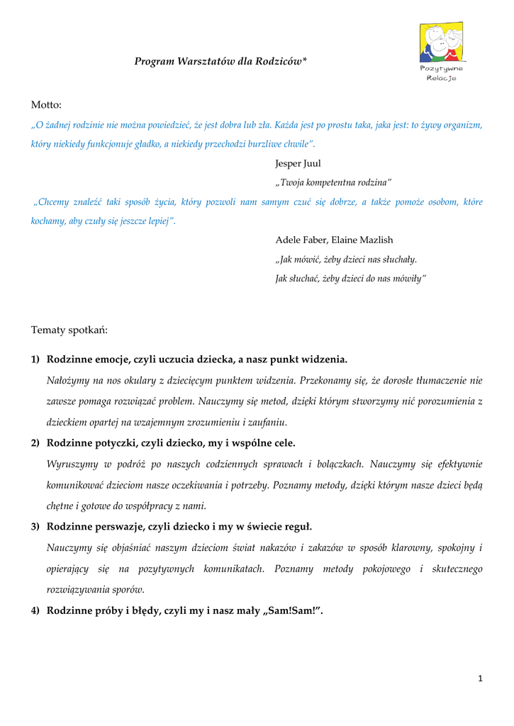 Program Warsztatów dla Rodziców* Motto: „O żadnej rodzinie nie można powiedzieć, że jest dobra lub zła. Każda jest po prostu taka, jaka jest: to żywy organizm, który niekiedy funkcjonuje gładko, a niekiedy przechodzi burzliwe chwile”. Jesper Juul „Twoja kompetentna rodzina” „Chcemy znaleźć taki sposób życia, który pozwoli nam samym czuć się dobrze, a także pomoże osobom, które kochamy, aby czuły się jeszcze lepiej”. Adele Faber, Elaine Mazlish „Jak mówić, żeby dzieci nas słuchały. Jak słuchać, żeby dzieci do nas mówiły” Tematy spotkań: 1) Rodzinne emocje, czyli uczucia dziecka, a nasz punkt widzenia. Nałożymy na nos okulary z dziecięcym punktem widzenia. Przekonamy się, że dorosłe tłumaczenie nie zawsze pomaga rozwiązać problem. Nauczymy się metod, dzięki którym stworzymy nić porozumienia z dzieckiem opartej na wzajemnym zrozumieniu i zaufaniu. 2) Rodzinne potyczki, czyli dziecko, my i wspólne cele. Wyruszymy w podróż po naszych codziennych sprawach i bolączkach. Nauczymy się efektywnie komunikować dzieciom nasze oczekiwania i potrzeby. Poznamy metody, dzięki którym nasze dzieci będą chętne i gotowe do współpracy z nami. 3) Rodzinne perswazje, czyli dziecko i my w świecie reguł. Nauczymy się objaśniać naszym dzieciom świat nakazów i zakazów w sposób klarowny, spokojny i opierający się na pozytywnych komunikatach. Poznamy metody pokojowego i skutecznego rozwiązywania sporów. 4) Rodzinne próby i błędy, czyli my i nasz mały „Sam!Sam!”. 1 W czasie zajęć poznamy techniki, dzięki którym nauczymy się podsycać wiarę naszych pociech we własne siły i możliwości. Nauczymy się metod wspierających przedsiębiorczość i własną inicjatywę naszych dzieci. 5) Rodzinny teatr, czyli jak dziecko staje się aktorem, a my reżyserem. Sprawdzimy, co w praktyce oznacza stwierdzenie „pozory mylą”. Nauczymy się metod, które pomogą naszym dzieciom budować prawdziwy i pozytywny wizerunek samych siebie. W praktyce wyjaśnimy stwierdzenie: „Jeśli chcesz, aby Twoje dziecko zachowywało się inaczej, traktuj je tak, jak by już to robiło”. 6) Rodzinna codzienność, czyli ćwiczymy, ćwiczymy i jeszcze raz ćwiczymy. W czasie zajęć podsumujemy oraz przećwiczymy wszystkie poznane metody. Podzielimy się naszą wiedzą praktyczną i teoretyczną. *Poniższy program dotyczy 6 spotkań 2,5 godzinnych. W przypadku spotkania jednorazowego, 5,5 godzinnego, program stanowi kompilację poniższych tematów ze szczególnym uwzględnieniem kwestii dotyczących rodzinnych emocji, współpracy oraz pokojowego rozwiązywania konfliktów. 2