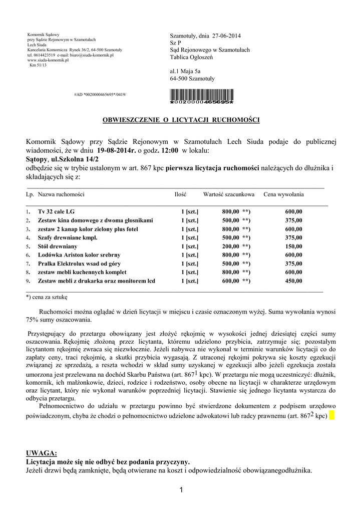 Komornik Sądowy przy Sądzie Rejonowym w Szamotułach Lech Siuda Kancelaria Komornicza Rynek 36/2, 64-500 Szamotuły tel. 0614423519 e-mail: [email protected] www.siuda-komornik.pl Km 51/13 Szamotuły, dnia 27-06-2014 Sz P Sąd Rejonowego w Szamotułach Tablica Ogłoszeń al.1 Maja 5a 64-500 Szamotuły #AD *0020000465695*/0419/ *0020000465695* OBWIESZCZENIE O LICYTACJI RUCHOMOŚCI Komornik Sądowy przy Sądzie Rejonowym w Szamotułach Lech Siuda podaje do publicznej wiadomości, że w dniu 19-08-2014r. o godz. 12:00 w lokalu: Sątopy, ul.Szkolna 14/2 odbędzie się w trybie ustalonym w art. 867 kpc pierwsza licytacja ruchomości należących do dłużnika i składających się z: _______________________________________________________________________________________________________________________ Lp. Nazwa ruchomości Ilość Wartość szacunkowa Cena wywołania _________________________________________________________________________________________________________________________ 1. 2. 3. 4. 5. 6. 7. 8. 9. Tv 32 cale LG Zestaw kina domowego z dwoma głosnikami zestaw 2 kanap kolor zielony plus fotel Szafy drewniane kmpl. Stół drewniany Lodówka Ariston kolor srebrny Pralka Elektrolux wsad od góry zestaw mebli kuchennych komplet Zestaw mebli z drukarka oraz monitorem lcd 1 [szt.] 1 [szt.] 1 [szt.] 1 [szt.] 1 [szt.] 1 [szt.] 1 [szt.] 1 [szt.] 1 [szt.] 800,00 500,00 800,00 500,00 200,00 800,00 500,00 800,00 600,00 **) **) **) **) **) **) **) **) **) 600,00 375,00 600,00 375,00 150,00 600,00 375,00 600,00 450,00 _______________________________________________________________________________________________________________________ *) cena za sztukę Ruchomości można oglądać w dzień licytacji w miejscu i czasie oznaczonym wyżej. Suma wywołania wynosi 75% sumy oszacowania. Przystępujący do przetargu obowiązany jest złożyć rękojmię w wysokości jednej dziesiątej części sumy oszacowania. Rękojmię złożoną przez licytanta, któremu udzielono przybicia, zatrzymuje się; pozostałym licytantom rękojmię zwraca się niezwłocznie. Jeżeli nabywca nie wykonał w terminie warunków licytacji co do zapłaty ceny, traci rękojmię, a skutki przybicia wygasają. Z utraconej rękojmi pokrywa się koszty egzekucji związanej ze sprzedażą, a reszta wchodzi w skład sumy uzyskanej w egzekucji albo jeżeli egzekucja została umorzona jest przelewana na dochód Skarbu Państwa (art. 8671 kpc). W przetargu nie mogą uczestniczyć: dłużnik, komornik, ich małżonkowie, dzieci, rodzice i rodzeństwo, osoby obecne na licytacji w charakterze urzędowym oraz licytant, który nie wykonał warunków poprzedniej licytacji. Stawienie się jednego licytanta wystarcza do odbycia przetargu. Pełnomocnictwo do udziału w przetargu powinno być stwierdzone dokumentem z podpisem urzędowo poświadczonym, chyba że chodzi o pełnomocnictwo udzielone adwokatowi lub radcy prawnemu (art. 8672 kpc) UWAGA: Licytacja może się nie odbyć bez podania przyczyny. Jeżeli drzwi będą zamknięte, będą otwierane na koszt i odpowiedzialność obowiązanegodłużnika. 1 z up. komornika Komornik Sądowy apl. Bartosz Rakowiecki Adresat oryginału: Sąd Rejonowego w Szamotułach Tablica Ogłoszeń 2 Lech Siuda