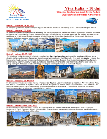 Viva Italia - 10 dni Wenecja, San Marino, Asyż, Rzym, Padwa wypoczynek na Riwierze Adriatyckiej www.online-travel.pl tel. 12 251 49 41, 509 989 466 Dzień 1 czwartek 06.07.2017 W późnych godzinach popołudniowych wyjazd z Krakowa. Przejazd tranzytowy przez Czechy i Austrię do Włoch. Dzień 2 piątek 07.07.2017 W godzinach porannych przyjazd do Wenecji. Rej łodzią turystyczną na Plac św. Marka, spacer po mieście, w czasie którego zobaczymy między innymi: Bazylikę Św. Marka -sanktuarium skrywające relikwie Św. Marka, sprowadzone z podbitego w 1204 roku z Konstantynopola, Wieżę Zegarową, Pałac Dożów oraz Most Westchnień. Następnie przejazd do hotelu, czas na odpoczynek po podróży. Obiadokolacja i nocleg. Dzień 3 sobota 08.07.2017 Po śniadaniu wykwaterowanie z hotelu, przejazd do San Marino najstarszej republiki świata znajdującej się w obrębie państwa włoskiego. Spacer po średniowiecznych zaułkach i fortyfikacjach. Przejazd do Asyżu - miasta św. Franciszka. Asyż nazwany miastem pokoju wznosi się na wzgórzu Subasio do dnia dzisiejszego zachował prawie nienaruszony średniowieczny wygląd. Zwiedzanie Bazyliki św. Franciszka oraz Bazyliki św. Klary, czas wolny na zakup pamiątek. Przejazd na obiadokolację i nocleg do hotelu położonego w okolicach Rzymu. Dzień 4 niedziela 09.07.2017 Po śniadaniu wykwaterowanie z hotelu. Przejazd do Rzymu. Udział w niedzielnej modlitwie Anioł Pański na Placu św. Piotra. Zwiedzanie Watykanu – Plac św. Piotra, Bazylika Św. Piotra, kaplica z grobem św. Jana Pawła II. Po południu zwiedzanie Rzymu antycznego, między innymi Forum Romanum i Colosseum. Przejazd do hotelu położonego w okolicach Rzymu, obiadokolacja i nocleg. Dzień 5 poniedziałek 10.07.2017 Po śniadaniu wykwaterowanie z hotelu. Przejazd do Rzymu, spacer po Rzymie barokowym: Piazza Navona, Fontanna di Trevi, Panteon, Schody Hiszpańskie. Czas wolny na zakupy pamiątkowe. Przejazd na obiadokolację i nocleg do hotelu na Riwierę Adriatycką. Dzień 6, 7 i 8 Po śniadaniu wypoczynek nad morzem na Riwierze Adriatyckiej. Obiadokolacja i nocleg. Dzień 9 piątek 14.07.2017 Po śniadaniu wykwaterowanie z hotelu przejazd do Padwy, siedziby jednego z najstarszych uniwersytetów, na którym studiowali między innymi Jan Kochanowski i Mikołaj Kopernik. Spacer po zabytkowym centrum oraz po placu Prato della Valle, który jest otoczony kanałem, przy którym stoi 78 posągów. Wizyta w bazylice św. Antoniego. W godzinach popołudniowych wyjazd w drogę powrotną do Polski. Przejazd tranzytowy przez Austrię i Czechy do Polski. Dzień 10 sobota 15.07.2017 Powrót do Krakowa w godzinach porannych. CENA 1750 zł TERMIN 06.07 – 15.07.2017 Cena obejmuje: Przejazd autokarem klasy LUX z klimatyzacją, barkiem, WC i DVD, opiekę polskojęzycznego pilota, 7 noclegów w hotelach***, 7 śniadań, 7 obiadokolacji, ubezpieczenie KL i NNW, program zwiedzania jw. Cena nie obejmuje: Obowiązkowo płatne koszty uczestnictwa w całym programie 110 euro (bilety wstępu do zwiedzanych obiektów, przewodnicy lokalni, taksa klimatyczna, wjazdy do miast, rejs statkiem w Wenecji, przejazdy metrem w Rzymie, tour guide system) * W nadmorskich miejscowościach wypoczynkowych we Włoszech korzystanie z serwisu plażowego jest płatne – około 7 euro za 1 osobę za 1 dzień (jest to cena serwisu plażowego, w ramach którego korzysta się z parasola plażowego i leżaka) W miejscowościach turystycznych, mało jest plaż publicznych, z których korzysta się bezpłatnie. *W holach we Włoszech bardzo często korzystanie z klimatyzacji jest dodatkowo płatne – około od 5 do 7 euro za dobę za pokój. (opłata za klimatyzację nie jest obowiązkowa!) *Posiłki w hotelach na terenie Włoch: Śniadania są zazwyczaj kontynentalne. Obiadokolacje są serwowane i składają się zazwyczaj z przystawki, dania głównego, sałatki oraz owoców lub deseru. Napoje do obiadokolacji są dodatkowo płatne. UCZESTNICY WYCIECZKI MUSZĄ POSIADAĆ WAŻNE PASZPORTY LUB DOWODY OSOBISTE!!!