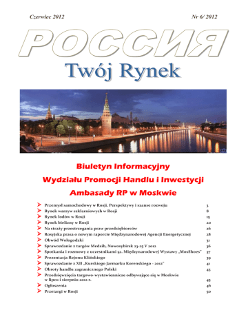 Czerwiec 2012 Nr 6/ 2012 Biuletyn Informacyjny Wydziału Promocji Handlu i Inwestycji Ambasady RP w Moskwie Przemysł samochodowy w Rosji. Perspektywy i szanse rozwoju 3 Rynek warzyw szklarniowych w Rosji 8 Rynek lodów w Rosji 15 Rynek bielizny w Rosji 20 Na straży przestrzegania praw przedsiębiorców 26 Rosyjska prasa o nowym raporcie Międzynarodowej Agencji Energetycznej 28 Obwód Wołogodzki 31 Sprawozdanie z targów Medsib, Nowosybirsk 23-25 V 2012 36 Spotkania i rozmowy z uczestnikami 52. Międzynarodowej Wystawy „MosShoes” 37 Prezentacja Rejonu Klińskiego 39 Sprawozdanie z XII „Kurskiego Jarmarku Korenskiego - 2012” 41 Obroty handlu zagranicznego Polski 43 Przedsięwzięcia targowo-wystawiennicze odbywające się w Moskwie w lipcu i sierpniu 2012 r. 45 Ogłoszenia 46 Przetargi w Rosji 50 Szanowni Państwo! Zapraszamy do lektury naszego czerwcowego wydania, które otwiera artykuł poświęcony rosyjskiemu rynkowi motoryzacyjnemu – drugiemu w Europie pod względem wielkości produkcji samochodów osobowych. Warto zauważyć, że branża ta wydaje się być perspektywiczna szczególnie z punktu widzenia polskich producentów części i komponentów do produkcji aut. W tej dziedzinie istnieją dla nas spore szanse na nawiązanie współpracy. WPHI w Moskwie bacznie obserwuje branżę i udziela swojego wsparcia zainteresowanym podmiotom. W Wydziale trwają właśnie przygotowania do wizyty studyjnej z udziałem polskich przedsiębiorców z branży motoryzacyjnej do Specjalnej Strefy Ekonomicznej Ałabuga w Tatarstanie. Misja organizowana jest we współpracy z Ministerstwem Rozwoju Gospodarczego Federacji Rosyjskiej. Ponadto naszych przedsiębiorców wspierać będziemy podczas wystawy samochodowej „MIMS Avtomechanika”, która odbędzie się w dniach 27-30 sierpnia br. w Moskwie. Podczas targów WPHI planuje zorganizowanie stoiska promocyjnoinformacyjnego oraz spotkanie polskich firm ze specjalnie wyselekcjonowanymi potencjalnymi rosyjskimi partnerami handlowymi. Ponadto uwadze polecamy artykuły poświęcone m.in. rynkom lodów, warzyw szklarniowych i bielizny oraz prezentacjom Obwodu Wołogodzkiego i Rejonu Klińskiego. Zachęcamy do zapoznania się również z pozostałymi opracowaniami naszych specjalistów. Zapraszamy do regularnych odwiedzin naszej strony www.moskwa.trade.gov.pl, na której na bieżąco zamieszczamy m.in. informacje oraz oferty współpracy otrzymane od polskich i rosyjskich przedsiębiorców. Z poważaniem, Kierownik WPHI Marek Ociepka Radca - Minister РОССИЯ, Twój Rynek, Nr 6/2012 2 Przemysł samochodowy w Rosji. Perspektywy i szanse rozwoju. opr. Marek Śmietana WPHI Moskwa se900.ru Rosyjski przemysł samochodowy szybko odbudował swoje pozycje po znacznym załamaniu, jakie przeżył w 2009r. w wyniku kryzysu fianasowego. Pod wzgledem wielkości produkcji samochodów osobowych Rosja zajmuje 2. miejsce w Europie, ustępując tylko Niemcom i 15. miejsce na swiecie. W 2011r. rosyjski przemysł samochodowy wyprodukował 1 mln 737 tys. samochodów osobowych, wzrost w stosunku do 2010r. wyniósł 44,5%. Wzrost produkcji samochodów ciężarowych w analogicznym okresie wyniósł 33,4%. W 2011r. rosyjska branża automotive wyprodukowała 207 tys. samochodów ciężarowych i 46,8 tys autobusów (wzrost o 3,6% w porównaniu r/r do 2010r.) Na szczególną uwagę zasługuje lawinowy wzrost produkcji samochodów osobowych tzw. nie rodzimych marek (pozostali producenci poza producentem samochodów marki LADA oraz WOŁGA), w porównaniu do roku 2010 ich wzrost produkcji w 2011 wyniósł 70%. Produkcja samochodów rodzimych marek w 2011 wzrosła o 13,9% i osiagnęła wielkość 665,7 tys. sztuk. Wychodzi zatem, że samochody marek zagranicznych produkowane w Rosji osiagnęły pułap ponad 1 mln sztuk i zdaniem wielu analityków tendencja wzrostu produkcji na terenie Federacji Rosyjskiej zostanie zachowana w najbliższym okresie. Przemawia za tym m.in. wielkość sprzedaży ogółem samochodów na rynku rosyjskim, jak i dynamika wzrostu. Za pięć pierwszych miesięcy 2012 wzrost sprzedaży samochodów w stosunku r/r kształtuje się na poziomie nie nizszym 11% w każdym miesiącu. РОССИЯ, Twój Rynek, Nr 6/2012 3 kolor niebieski – produkcja samochodów osobowych w Rosji kolor czerwony – sprzedaż samochodów osobowych w Rosji Potrzeby Rosji w unowocześnieniu swojego parku samochodowego są ogromne. W 2011r. Rosja importowała 1 mln 20 tys. samochodów osobowych, w tym prawie 900 tys. to były samochody nowe. Jako uzupełnienie powyższego grafiku można dodać, że w 2011r. Rosja wyeksportowała (głównie do krajów WNP) 68 tys samochodów. Począwszy od 2000r., władze rosyjskie prowadzą systematyczną pracę na rzecz trwałego umiejscowienia w Rosji światowych gigantów motoryzacyjnych. Na początku lat 2000-ych działania polegały na uruchomieniu produkcji montażowej, składającej samochody z gotowych podzespołów i agregatów. Uruchamiane linie montażowe były na różnym poziomie możliwości technologicznych, znaczna jednak już część spełniała wymogi montażowe na warunkach CKD (Completely Knocked Down - spawanie, lakierowanie). Rozpoczęto produkcje takich marek jak: Volkswagen, Skoda, BMW, Ford, Renault, Toyota, Chevrolet,Peugeot-Citroen, Mitsubishi, Nissan, Opel, Kia, Volvo Truck. Lokalizacje nowych zakładów samochodowych w Rosji: Petersburg: Toyota General Motors (Chevrolet, Opel) Nissan Hyundai Kia Scania Vsevolzhsk pod Petersburgiem: Ford Fiat РОССИЯ, Twój Rynek, Nr 6/2012 4 Kaługa: Volkswagen Skoda Peugeot — Citroen — Mitsubishi Volvo Moskwa: Renault LiAZ (autobusy) GolAZ СеАЗ Marussia Motors Tonar Miass: Iveco Kaliningrad: BMW, Opel, Chevrolet Cadillac KIA Taganrog: Chery(Chiny) Hyundai BYD (Chiny) Cherkesk: Lifan(Chiny) Ulyanovsk: BAW Motors Toliatti: Chevrolet Niva Rodzime marki samochodów rosyjskich są nadal produkowane, jednakże ich produkcja poza Zakładami KAMAZ spada: GAZ w Nizhny Novg