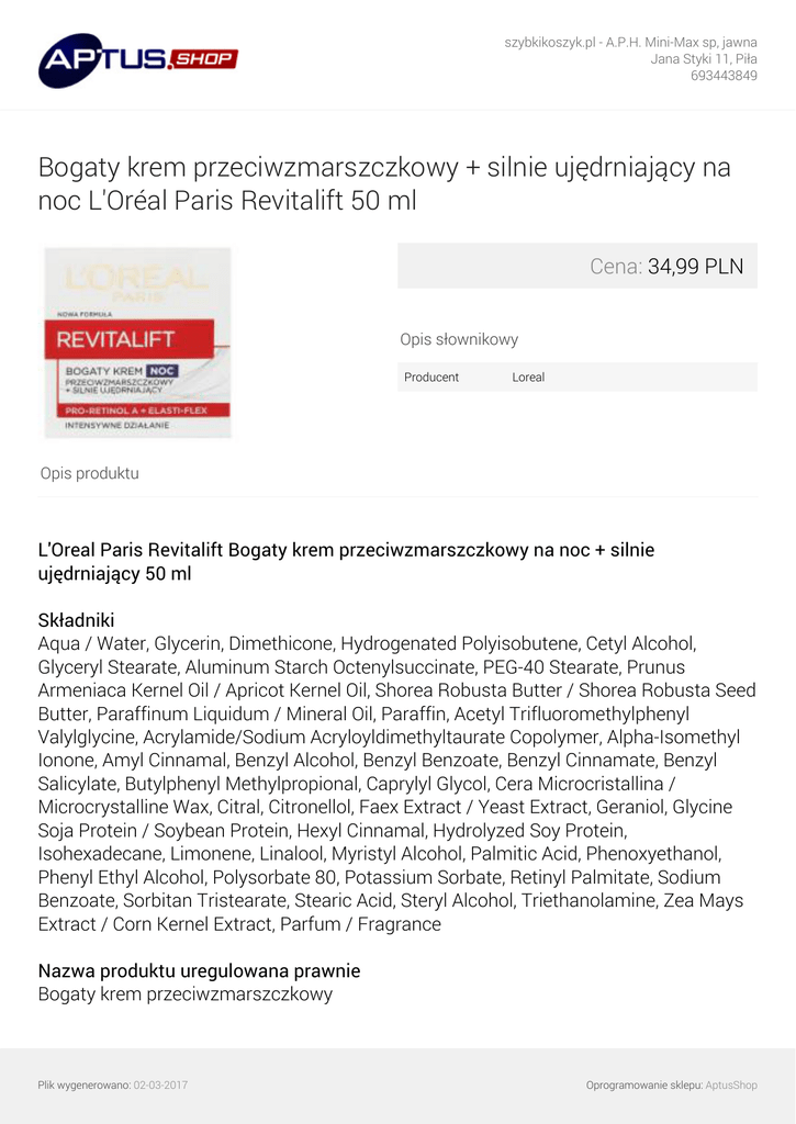szybkikoszyk.pl - A.P.H. Mini-Max sp, jawna Jana Styki 11, Piła 693443849 Bogaty krem przeciwzmarszczkowy + silnie ujędrniający na noc L'Oréal Paris Revitalift 50 ml Cena: 34,99 PLN Opis słownikowy Producent Loreal Opis produktu L'Oreal Paris Revitalift Bogaty krem przeciwzmarszczkowy na noc + silnie ujędrniający 50 ml Składniki Aqua / Water, Glycerin, Dimethicone, Hydrogenated Polyisobutene, Cetyl Alcohol, Glyceryl Stearate, Aluminum Starch Octenylsuccinate, PEG-40 Stearate, Prunus Armeniaca Kernel Oil / Apricot Kernel Oil, Shorea Robusta Butter / Shorea Robusta Seed Butter, Paraffinum Liquidum / Mineral Oil, Paraffin, Acetyl Trifluoromethylphenyl Valylglycine, Acrylamide/Sodium Acryloyldimethyltaurate Copolymer, Alpha-Isomethyl Ionone, Amyl Cinnamal, Benzyl Alcohol, Benzyl Benzoate, Benzyl Cinnamate, Benzyl Salicylate, Butylphenyl Methylpropional, Caprylyl Glycol, Cera Microcristallina / Microcrystalline Wax, Citral, Citronellol, Faex Extract / Yeast Extract, Geraniol, Glycine Soja Protein / Soybean Protein, Hexyl Cinnamal, Hydrolyzed Soy Protein, Isohexadecane, Limonene, Linalool, Myristyl Alcohol, Palmitic Acid, Phenoxyethanol, Phenyl Ethyl Alcohol, Polysorbate 80, Potassium Sorbate, Retinyl Palmitate, Sodium Benzoate, Sorbitan Tristearate, Stearic Acid, Steryl Alcohol, Triethanolamine, Zea Mays Extract / Corn Kernel Extract, Parfum / Fragrance Nazwa produktu uregulowana prawnie Bogaty krem przeciwzmarszczkowy Plik wygenerowano: 02-03-2017 Oprogramowanie sklepu: AptusShop szybkikoszyk.pl - A.P.H. Mini-Max sp, jawna Jana Styki 11, Piła 693443849 Marka L'Oreal Paris Cechy nowa formuła, Pro-Retinol A + Elasti-flex, intensywne działanie Marka standaryzowana Marka: L'Oreal Paris Podmarka Podmarka: Revitalift Adres firmy ul. Daniszewska 4 03-230 Warszawa Opis produktu Skuteczna pielęgnacja przeciwzmarszczkowa + ujędrniająca od L'Oréal Paris. Fakty Włókna elastyny stanowią mniej niż 5% włókien skóry, tymczasem są one niezbędne dla zachowania elastyczności skóry, ponieważ odpowiadają za jej sprężystość. Po 40. roku życia włókna elastyny są mniej liczne, a ich sieć ulega zrywaniu. Skóra staje się mniej jędrna i mniej elastyczna, a zmarszczki są coraz bardziej widoczne. Rozwiązanie ekspertów L'Oréal Paris Elasti-flex to unikalny kompleks, który zwiększa i wzmacnia sieć włókien elastyny*, aby chronić elastyczność skóry. Sieć stanowiąca podporę skóry staje się gęstsza*, aby skóra była bardziej napięta i silniej ujędrniona. Pro-Retinol A jest skutecznym przeciwzmarszczkowym składnikiem aktywnym, znanym ze swych właściwości stymulujących regenerację komórkową*. Widoczne rezultaty Natychmiast po użyciu skóra jest dobrze nawilżona: +29%**. - Po czterech godzinach skóra jest bardziej napięta: +20%***. - Noc po nocy krem Revitalift stymuluje regenerację komórkową. - Po 4 tygodniach zmarszczki ulegają redukcji. - Skóra odzyskuje sprężystość. Testowany pod kontrolą dermatologiczną Piękna skóra dzisiaj widocznie młodsza skóra w przyszłości Działanie: Przeciwzmarszczkowe + Ujędrniające Wiek: 40 - 50 Konsystencja: Aksamitny, bogaty krem *Test in vitro. **Test instrumentalny w grupie 24 kobiet. ***Test instrumentalny w grupie 40 kobiet. O marce Od nauki do piękna Od ponad 30 lat laboratoria L'Oréal Paris wprowadzają coraz bardziej skuteczne innowacje naukowe w dziedzinie pielęgnacji skóry dla kobiet w Plik wygenerowano: 02-03-2017 Oprogramowanie sklepu: AptusShop szybkikoszyk.pl - A.P.H. Mini-Max sp, jawna Jana Styki 11, Piła 693443849 każdym wieku. We współpracy z dermatologami z całego świata laboratoria L'Oréal Paris opracowują formuły o potwierdzonej w testach skuteczności. Zaawansowane naukowo formuły oraz zmysłowa konsystencja naszych produktów gwarantują każdej kobiecie wyjątkową przyjemność stosowania. Kompleksowa pielęgnacja Revitalift - Do oczyszczania skóry polecamy mleczko i tonik Revitalift. - Rano i wieczorem należy stosować odpowiednie produkty do codziennej pielęgnacji na dzień i na noc Revitalift. Do pielęgnacji delikatnej skóry okolic oczu polecamy Revitalift Krem Pod Oczy. Dodatkowe informacje Zgłoszenie patentowe Company Name L´Oréal Polska Sp. z o.o. Przygotowanie i stosowanie Sposób użycia - Stosować codziennie wieczorem na oczyszczoną skórę twarzy i szyi. Rozprowadzić kolistymi ruchami, aby krem lepiej się wchłonął. Rodzaj przechowywania Typ: Przechowywać w temperaturze otoczenia Durability after Opening Trwałość po otwarciu. miesiąc/miesiące/miesięcy 12 Rozmiar opakowania 50 Jednostka (tekst opisowy) ml Średnia miara Średnia miara (e) Informacje o recyklingu Opakowanie: Nadające się do recyklingu Jednostka (specyficzna) Jednostka (specyficzna): Mililitrów Plik wygenerowano: 02-03-2017 Oprogramowanie sklepu: AptusShop szybkikoszyk.pl - A.P.H. Mini-Max sp, jawna Jana Styki 11, Piła 693443849 Rodzaj opakowania Typ: Karton Wymiar liczbowy Wymiar liczbowy: 50 Wymiar Wymagana wysokość na półce: 71 Wymagana szerokość na półce: 71 Wymagana głębokość na półce: 69 Waga Waga brutto: 244 Sprzedaż jednostkowa Wysokość: 71 Szerokość: 71 Głębokość: 69 Adres zwrotny L´Oréal Polska Sp. z o.o. ul. Daniszewska 4 03-230 Warszawa Infolinia 801 105 501 Zadzwoń pn. - pt. 9.00-17.30 Koszt połączenia 1 impuls + VAT www.lorealparis.pl Adres dystrybutora L´Oréal Polska Sp. z o.o. ul. Daniszewska 4 03-230 Warszawa Telefon/Fax kontaktowy 801105501 Adres internetowy www.lorealparis.pl Języki na opakowaniu polski Język produktu Główny język opisu: polski Plik wygenerowano: 02-03-2017 Oprogramowanie sklepu: AptusShop szybkikoszyk.pl - A.P.H. Mini-Max sp, jawna Jana Styki 11, Piła 693443849 Język danych: polski Podzielony opis produktu Nazwa funkcjonalna: Bogaty krem przeciwzmarszczkowy na noc Wariant: + silnie ujędrniający Plik wygenerowano: 02-03-2017 Powered by TCPDF (www.tcpdf.org) Oprogramowanie sklepu: AptusShop