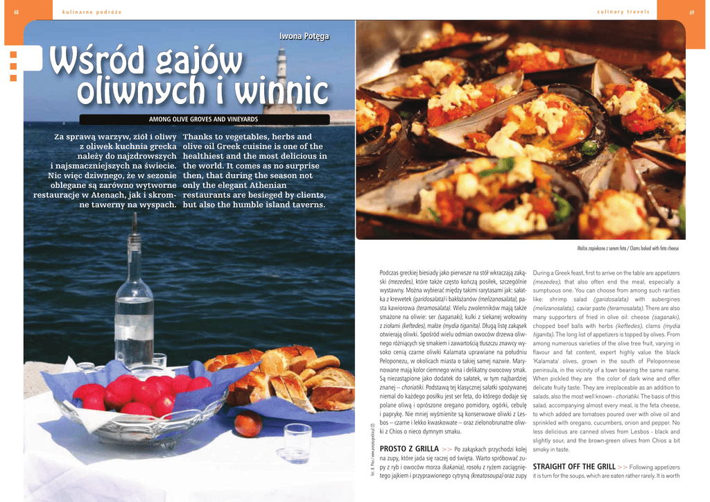 culinary travels kulinarne podró˝e Iwona Pot´ga AMONG OLIVE GROVES AND VINEYARDS Za sprawà warzyw, ziół i oliwy z oliwek kuchnia grecka nale˝y do najzdrowszych i najsmaczniejszych na Êwiecie. Nic wi´c dziwnego, ˝e w sezonie oblegane sà zarówno wytworne restauracje w Atenach, jak i skromne tawerny na wyspach. Thanks to vegetables, herbs and olive oil Greek cuisine is one of the healthiest and the most delicious in the world. It comes as no surprise then, that during the season not only the elegant Athenian restaurants are besieged by clients, but also the humble island taverns. Mał˝e zapiekane z serem feta / Clams baked with feta cheese Fot.: B. Pitus / www.przepisygreckie.pl (2) 68 Podczas greckiej biesiady jako pierwsze na stół wkraczajà zakàski (mezedes), które tak˝e cz´sto koƒczà posiłek, szczególnie wystawny. Mo˝na wybieraç mi´dzy takimi rarytasami jak: sałatka z krewetek (garidosalata) i bakła˝anów (melizanosalata), pasta kawiorowa (teramosalata). Wielu zwolenników majà tak˝e sma˝one na oliwie: ser (saganaki), kulki z siekanej wołowiny z ziołami (keftedes), mał˝e (mydia tiganita). Długà list´ zakàsek otwierajà oliwki. SpoÊród wielu odmian owoców drzewa oliwnego ró˝niàcych si´ smakiem i zawartoÊcià tłuszczu znawcy wysoko cenià czarne oliwki Kalamata uprawiane na południu Peloponezu, w okolicach miasta o takiej samej nazwie. Marynowane majà kolor ciemnego wina i delikatny owocowy smak. Sà niezastàpione jako dodatek do sałatek, w tym najbardziej znanej – choriatiki. Podstawà tej klasycznej sałatki spo˝ywanej niemal do ka˝dego posiłku jest ser feta, do którego dodaje si´ polane oliwà i oprószone oregano pomidory, ogórki, cebul´ i papryk´. Nie mniej wyÊmienite sà konserwowe oliwki z Lesbos – czarne i lekko kwaskowate – oraz zielonobrunatne oliwki z Chios o nieco dymnym smaku. During a Greek feast, first to arrive on the table are appetizers (mezedes), that also often end the meal, especially a sumptuous one. You can choose from among such rarities like: shrimp salad (garidosalata) with aubergines (melizanosalata), caviar paste (teramosalata). There are also many supporters of fried in olive oil: cheese (saganaki), chopped beef balls with herbs (keftedes), clams (mydia tiganita). The long list of appetizers is topped by olives. From among numerous varieties of the olive tree fruit, varying in flavour and fat content, expert highly value the black 'Kalamata' olives, grown in the south of Peloponnese peninsula, in the vicinity of a town bearing the same name. When pickled they are the color of dark wine and offer delicate fruity taste. They are irreplaceable as an addition to salads, also the most well known - choriatiki. The basis of this salad, accompanying almost every meal, is the feta cheese, to which added are tomatoes poured over with olive oil and sprinkled with oregano, cucumbers, onion and pepper. No less delicious are canned olives from Lesbos - black and slightly sour, and the brown-green olives from Chios a bit PROSTO Z GRILLA >> Po zakàskach przychodzi kolej smoky in taste. na zupy, które jada si´ raczej od Êwi´ta. Warto spróbowaç zupy z ryb i owoców morza (kakania), rosołu z ry˝em zaciàgni´- STRAIGHT OFF THE GRILL >> Following appetizers tego jajkiem i przyprawionego cytrynà (kreatosoupa) oraz zupy it is turn for the soups, which are eaten rather rarely. It is worth 69 culinary travels kulinarne podró˝e Kalzounia, czyli piero˝ki w cieÊcie filo / Kalzounia, filo dough dumplings Saganaki, sma˝ony ser / Saganaki, fried cheese, a favoured appetizer Faszerowane liÊcie winoroÊli / Stuffed vine leaves Cukinia sma˝ona w gł´bokim tłuszczu / Courgette fried in deep oil jogurtowej z dodatkiem ry˝u, soku pomidorowego i wina. WÊród daƒ mi´snych królujà pieczone na ro˝nie jagni´cina lub wołowina. Klimat Grecji nie pozwala na konsumpcj´ mi´sa niewykrwawionego bardzo dokładnie, dlatego potrawy sà przyrzàdzane długo na wolnym ogniu. Zamiast befsztyków jada si´ podawane prosto z ro˝na szaszłyki z jagni´ciny lub wołowiny (souvlaki) lub wàtrob´ zawini´tà w jagni´ce flaczki (kokoretsi). Potrawy te wybornie smakujà z ry˝em oraz tzatziki, czyli sałatkà z ogórka polanà sosem jogurtowo-czosnkowym. Jako danie na wynos znakomicie sprawdzajà si´ souvlaki pita, czyli zawini´te w placek typu pita kawałki grillowanego mi´sa, pomidory, ogórki i cebula z sosem czosnkowym. to try the fish and seafood soup (kakania), broth with rice,egg and seasoned with lemon (kreatosoupa) and a yoghurt soup with rice, tomato juice and wine. Among meat dishes reign the spit roasted lamb or beef. Greek climate does not allow for consumption of meat previously well bled. That is why dishes are cooked over a small fire. Instead beefsteaks, a variety of lamb and beef shashliks (souvlaki) or liver wrapped in lamb intestines (kokoretsi) are served. These dishes taste well with rice and tzatziki, a cucumber salad poured over with yoghurtgarlic sauce. As a take away dish souvlaki pita are just perfect, as it is grilled meat chunks, tomatoes, cucumbers and onion in garlic sauce, all wrapped in pita pie. staniemy w ka˝dej tawernie rybnej (psarotawernie) nad brzegiem morza. Bez problemu zamówimy tam tak˝e filety rybne zapiekane w pikantnym sosie pomidorowym, tzw. psari a la spetsiota, czyli na sposób z wyspy Spetse w Zatoce Saronickiej. Owoce morza dominujà w kuchni Dodekanezu, archipelagu 12 wysp na Morzu Egejskim. Jada si´ tam takie rarytasy jak: kalmary pieczone na ruszcie (kalamaria), gotowany krab podawany z pikantnymi oliwkami joƒskimi (kavouria) i krewetki pieczone w pomidorach (garides saganaki). or coated in special coating are served in every fish tavern (psarotawernie) at the seaside. We will be able to order there without a problem fish fillet baked in spicy tomato sauce, so called psari a la spetsiota, meaning it was made just like on Spetse island in the Saronic bay. Seafood