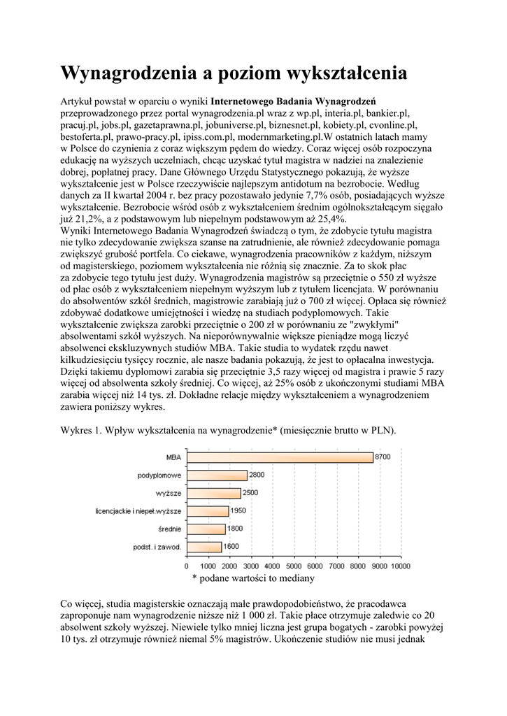Wynagrodzenia a poziom wykształcenia Artykuł powstał w oparciu o wyniki Internetowego Badania Wynagrodzeń przeprowadzonego przez portal wynagrodzenia.pl wraz z wp.pl, interia.pl, bankier.pl, pracuj.pl, jobs.pl, gazetaprawna.pl, jobuniverse.pl, biznesnet.pl, kobiety.pl, cvonline.pl, bestoferta.pl, prawo-pracy.pl, ipiss.com.pl, modernmarketing.pl.W ostatnich latach mamy w Polsce do czynienia z coraz większym pędem do wiedzy. Coraz więcej osób rozpoczyna edukację na wyższych uczelniach, chcąc uzyskać tytuł magistra w nadziei na znalezienie dobrej, popłatnej pracy. Dane Głównego Urzędu Statystycznego pokazują, że wyższe wykształcenie jest w Polsce rzeczywiście najlepszym antidotum na bezrobocie. Według danych za II kwartał 2004 r. bez pracy pozostawało jedynie 7,7% osób, posiadających wyższe wykształcenie. Bezrobocie wśród osób z wykształceniem średnim ogólnokształcącym sięgało już 21,2%, a z podstawowym lub niepełnym podstawowym aż 25,4%. Wyniki Internetowego Badania Wynagrodzeń świadczą o tym, że zdobycie tytułu magistra nie tylko zdecydowanie zwiększa szanse na zatrudnienie, ale również zdecydowanie pomaga zwiększyć grubość portfela. Co ciekawe, wynagrodzenia pracowników z każdym, niższym od magisterskiego, poziomem wykształcenia nie różnią się znacznie. Za to skok płac za zdobycie tego tytułu jest duży. Wynagrodzenia magistrów są przeciętnie o 550 zł wyższe od płac osób z wykształceniem niepełnym wyższym lub z tytułem licencjata. W porównaniu do absolwentów szkół średnich, magistrowie zarabiają już o 700 zł więcej. Opłaca się również zdobywać dodatkowe umiejętności i wiedzę na studiach podyplomowych. Takie wykształcenie zwiększa zarobki przeciętnie o 200 zł w porównaniu ze "zwykłymi" absolwentami szkół wyższych. Na nieporównywalnie większe pieniądze mogą liczyć absolwenci ekskluzywnych studiów MBA. Takie studia to wydatek rzędu nawet kilkudziesięciu tysięcy rocznie, ale nasze badania pokazują, że jest to opłacalna inwestycja. Dzięki takiemu dyplomowi zarabia się przeciętnie 3,5 razy więcej od magistra i prawie 5 razy więcej od absolwenta szkoły średniej. Co więcej, aż 25% osób z ukończonymi studiami MBA zarabia więcej niż 14 tys. zł. Dokładne relacje między wykształceniem a wynagrodzeniem zawiera poniższy wykres. Wykres 1. Wpływ wykształcenia na wynagrodzenie* (miesięcznie brutto w PLN). * podane wartości to mediany Co więcej, studia magisterskie oznaczają małe prawdopodobieństwo, że pracodawca zaproponuje nam wynagrodzenie niższe niż 1 000 zł. Takie płace otrzymuje zaledwie co 20 absolwent szkoły wyższej. Niewiele tylko mniej liczna jest grupa bogatych - zarobki powyżej 10 tys. zł otrzymuje również niemal 5% magistrów. Ukończenie studiów nie musi jednak oznaczać zbytkownego życia. Zarobki większości polskich magistrów (ponad 55%) mieszczą się w przedziale od tysiąca do 3 tys. zł. Za to co piąty pracownik z ukończonymi studiami wyższymi zarabia już przynajmniej 4 500 zł. Wykres 2. Odsetek pracowników z wyższym wykształceniem zarabiających w danym przedziale. Pracownicy, którzy nie ukończyli studiów magisterskich powinni się spodziewać niższych płac. Grupa najmniej zarabiających - do 1 000 zł - jest tutaj niemal trzy razy liczniejsza niż w przypadku osób z wyższym wykształceniem (wykres 3). Zdecydowana większość, bo aż 80%, takich pracowników zarabia maksymalnie 3 000 zł brutto, a ponad połowa (57,4%) co najwyżej 2 tys. zł. Zwróćmy jednocześnie uwagę, że o ile 5% najbogatszych magistrów zarabiało powyżej 10 tys. zł, to tak samo liczna grupa osób bez wyższego wykształcenia zarabia powyżej 6 tys. zł. Powyżej psychologicznej granicy 10 tys. zł zarabia zaledwie co setny pracownik bez wyższego wykształcenia. Wykres 3. Odsetek pracowników nieposiadających wyższego wykształcenia zarabiających w danym przedziale. Kolejną kwestią, która rzuca się w oczy przy analizie wpływu wykształcenia na zarobki to fakt zdecydowanie szybszego wzrostu płac absolwentów studiów wyższych wraz ze zdobywaniem większego doświadczenia. Magistrzy rozpoczynający dopiero swoje kariery zarabiają niewiele więcej, bo około 25%, niż osoby z wykształceniem średnim. Wraz z wiekiem różnica to zdecydowanie się powiększa. Wynagrodzenia magistrów zbliżających się do trzydziestki są już o 30% wyższe niż ich rówieśników z wykształceniem średnim. W przypadku osób doświadczonych, w grupie wiekowej 36 - 40 lat, różnica ta wynosi już ponad 50%. Tak więc zarobki magistrów wraz z rozwojem ich kariery zawodowej wzrastają przeciętnie o prawie 75%. Wzrost zarobków osób z niepełnym wyższym wykształceniem lub z licencjatem wynosi 65%, z wykształceniem średnim niecałe 50%, a z podstawowym lub zawodowym zaledwie 25%. Generalną zasadą, niezależnie od poziomu wykształcenia, jest ustabilizowanie się zarobków po przekroczeniu 30 roku życia. Wynagrodzenia osób starszych nawet nieznacznie spadają. Tabela 1. Wynagrodzenia* ze względu na wykształcenie i wiek (miesięcznie brutto w PLN). Wykształcenie Wiek Podstawowe i zawodowe Średnie Niepełne wyższe i licencjat Wyższe 21 - 25 lat 1 400 1 450 1 630 1 841 26 - 30 lat 1 550 1 845 2 182 2 400 31 - 35 lat 1 780 2 155 2 660 3 100 36 - 40 lat 1 675 2 100 2 700 3 200 Powyżej 41 lat 1 700 2 123 2 550 3 100 * podane wartości to mediany Co ciekawe, wynagrodzenia pracowników z różnym wykształceniem bardzo niewiele różnią się na stanowiskach szeregowych. Na takim szczeblu w hierarchii firmy osoba z wyższym wykształceniem zarabia przeciętnie o 266 zł więcej od pracownika z wykształceniem podstawowym. Jest to różnica niecałych 20%. W przypadku pozostałych stopni wykształcenia, wynagrodzenia są niemal identyczne, co u pracowników po podstawówce lub zawodówce. Rozpiętości przeciętnych płac pracowników szeregow