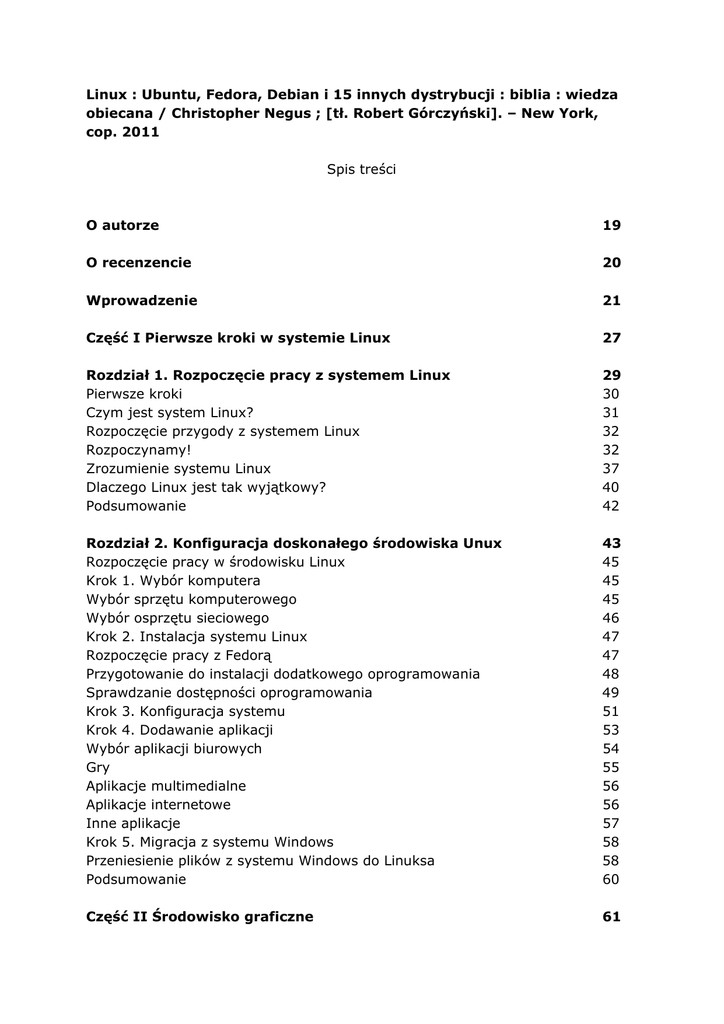 Linux : Ubuntu, Fedora, Debian i 15 innych dystrybucji : biblia : wiedza obiecana / Christopher Negus ; [tł. Robert Górczyński]. – New York, cop. 2011 Spis treści O autorze 19 O recenzencie 20 Wprowadzenie 21 Część I Pierwsze kroki w systemie Linux 27 Rozdział 1. Rozpoczęcie pracy z systemem Linux Pierwsze kroki Czym jest system Linux? Rozpoczęcie przygody z systemem Linux Rozpoczynamy! Zrozumienie systemu Linux Dlaczego Linux jest tak wyjątkowy? Podsumowanie 29 30 31 32 32 37 40 42 Rozdział 2. Konfiguracja doskonałego środowiska Unux Rozpoczęcie pracy w środowisku Linux Krok 1. Wybór komputera Wybór sprzętu komputerowego Wybór osprzętu sieciowego Krok 2. Instalacja systemu Linux Rozpoczęcie pracy z Fedorą Przygotowanie do instalacji dodatkowego oprogramowania Sprawdzanie dostępności oprogramowania Krok 3. Konfiguracja systemu Krok 4. Dodawanie aplikacji Wybór aplikacji biurowych Gry Aplikacje multimedialne Aplikacje internetowe Inne aplikacje Krok 5. Migracja z systemu Windows Przeniesienie plików z systemu Windows do Linuksa Podsumowanie 43 45 45 45 46 47 47 48 49 51 53 54 55 56 56 57 58 58 60 Część II Środowisko graficzne 61 Rozdział 3. Poznajemy środowisko graficzne Zrozumienie środowiska graficznego Uruchamianie środowiska graficznego Uruchomienie w środowisku graficznym Uruchomienie w graficznym ekranie logowania Uruchomienie w środowisku tekstowym Korzystanie ze środowiska KDE Korzystanie z pulpitu KDE Zarządzanie plikami za pomocą menedżerów plików Dolphin i Konqueror Używanie menedżera plików Dolphin Używanie menedżera plików i przeglądarki internetowej Konqueror Zarządzanie środowiskiem KDE Konfiguracja pulpitu Korzystanie ze środowiska GNOME Korzystanie z menedżera okien Metacity Korzystanie z paneli GNOME Korzystanie z menedżera plików Nautilus Efekty 3D za pomocą AIGLX Zmiana ustawień środowiska GNOME Opuszczanie środowiska GNOME Konfiguracja środowiska graficznego Konfiguracja X Wybór menedżera okien Wybór własnego menedżera okien Dodatkowe informacje Podsumowanie 63 63 64 65 65 67 68 69 73 73 78 81 83 85 87 89 94 96 99 100 101 101 105 108 109 109 Rozdział 4. Poczta e-mail i przeglądanie internetu Korzystanie z poczty elektronicznej Wybór klienta poczty elektronicznej Przeniesienie konta pocztowego z systemu Windows Rozpoczęcie pracy z pocztą elektroniczną Dostosowanie działania klienta poczty Poczta elektroniczna w programie Thunderbird Zarządzanie pocztą elektroniczną w programie Evolution Obsługa poczty elektronicznej za pomocą programu SeaMonkey Mail Praca z tekstowymi klientami poczty Wybór przeglądarki internetowej Poznanie pakietu SeaMonkey Korzystanie z przeglądarki Firefox Konfiguracja przeglądarki Firefox Zabezpieczanie przeglądarki Firefox Wskazówki dotyczące używania przeglądarki Firefox Używanie kontrolek przeglądarki Firefox 111 111 112 114 115 116 117 124 127 128 129 130 132 133 137 139 141 Usprawnienie przeglądarki Firefox poprzez dodanie paska narzędziowego ustawień Dodatkowe możliwości przeglądarki Firefox Korzystanie z tekstowych przeglądarek internetowych Podsumowanie 141 143 144 146 Rozdział 5. Odtwarzanie muzyki, wideo, przeglądanie zdjęć i gry w Linuksie Serwery multimedialne Odtwarzanie plików muzycznych i wideo za pomocą programu Totem Dodawanie obsługi plików muzycznych i wideo do odtwarzacza Totem Używanie programu Totem jako odtwarzacza filmów Odtwarzanie muzyki w Linuksie Odtwarzanie muzyki za pomocą programu Rhythmbox Odtwarzanie muzyki za pomocą XMMS Zarządzanie muzyką w urządzeniu iPod za pomocą gtkpod Nagrywanie i kopiowanie muzyki Tworzenie płyty CD Audio za pomocą polecenia cdrecord Zgrywanie płyt CD za pomocą narzędzia Grip Odtwarzanie wideo Analiza kodeków Oglądanie wideo za pomocą xine Praca z grafiką Zarządzanie grafiką za pomocą programu Menedżer zdjęć Shotwell Operacje na grafice za pomocą programu GIMP Przejęcie zrzutu ekranu Gry w Linuksie Ogólny opis gier w Linuksie Wyszukiwanie gier dla Linuksa Skąd czerpać informacje o grach w Linuksie? Ogólny opis gier komercyjnych w Linuksie Korzystanie z oprogramowania Cedega Podsumowanie 147 148 149 149 151 152 152 154 158 160 160 161 163 164 166 169 169 170 173 173 174 174 176 178 179 180 Część III Administracja systemem 181 Rozdział 6. Podstawowa administracja systemem Graficzne narzędzia administracyjne Administracja za pomocą przeglądarki internetowej Administracja graficzna w różnych dystrybucjach Korzystanie z konta użytkownika root Uzyskanie uprawnień użytkownika root z poziomu powłoki (polecenie su) Nadanie ograniczonych uprawnień administracyjnych Nadanie uprawnień administracyjnych za pomocą sudo 183 184 184 186 189 191 192 192 Zrozumienie poleceń administracyjnych, plików konfiguracyjnych oraz plików dzienników zdarzeń Polecenia administracyjne Administracyjne pliki konfiguracyjne Pliki administracyjnych dzienników zdarzeń Korzystanie z innych loginów administracyjnych Podsumowanie 194 194 195 200 201 202 Rozdział 7. instalacja systemu Linux Wybór dystrybucji Linuksa Pobieranie dystrybucji systemu Linux Szukanie innej dystrybucji Linuksa Zrozumienie własnych potrzeb Pobieranie dystrybucji Wypalanie dystrybucji na płycie CD Zagadnienia dotyczące instalacji Informacje dotyczące posiadanej konfiguracji sprzętowej Uaktualnienie lub instalacja od początku Instalacja obok innego systemu operacyjnego Instalacja Linuksa w środowisku wirtualnym Opcje procesu instalacji Partycjonowanie dysku twardego Używanie programów uruchamiających LILO i GRUB Konfiguracja sieci Konfiguracja innych funkcji administracyjnych Podsumowanie 203 204 205 206 207 208 209 209 210 211 212 213 214 214 224 234 234 235 Rozdział 8. uruchamianie poleceń z poziomu powłoki Uruchamianie powłoki Używanie wiersza poleceń powłoki Używanie okna terminalu Używanie terminali wirtualnych Wybór powłoki Używanie powłoki bash (i wcześniejszej sh) U