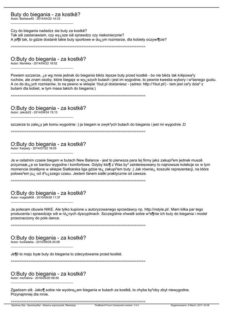 Buty do biegania - za kostkê? Autor: Barbara40 - 2014/04/22 14:33 _____________________________________ Czy do biegania nadadz± sie buty za kostkê? Tak siê zastanawiam, czy wy¿sze siê sprawdz± czy niekoniecznie? A je¶li tak, to gdzie dostanê takie buty sportowe w du¿ym rozmiarze, dla kobiety oczywi¶cie? ============================================================================ O:Buty do biegania - za kostkê? Autor: Monikka - 2014/04/22 18:52 _____________________________________ Powiem szczerze, ¿e wg mnie jednak do biegania bêd± lepsze buty przed kostkê - bo nie bêd± tak krêpowa³y ruchów, ale znam osoby, które biegaj± w wy¿szych butach i jest im wygodnie, to pewnie kwestia wybory i w³asnego gustu. A co do du¿ych rozmiarów, to na pewno w sklepie 1but.pl dostaniesz - (adres: http://1but.pl/) - tam jest ca³y dzia³ z butami dla kobiet, w tym masa takich do biegania:) ============================================================================ O:Buty do biegania - za kostkê? Autor: Jakub22 - 2014/04/24 15:13 _____________________________________ szczerze to zale¿y jak komu wygodnie :) ja biegam w zwyk³ych butach do biegania i jest mi wygodnie ;D ============================================================================ O:Buty do biegania - za kostkê? Autor: Karpaty - 2014/07/22 16:05 _____________________________________ Ja w ostatnim czasie biegam w butach New Balance - jest to pierwsza para tej firmy jak± zakupi³em jednak muszê przyznaæ,¿e s± bardzo wygodne i komfortowe. Gdyby kto¶ z Was by³ zainteresowany to najnowsze kolekcje s± w tym momencie dostêpne w sklepie Siatkarska liga gdzie te¿ zakupi³em buty ;) Jak równie¿ koszulki reprezentacji, na które polowa³em ju¿ od d³u¿szego czasu. Jestem fanem siatki praktycznie od zawsze. ============================================================================ O:Buty do biegania - za kostkê? Autor: magda906 - 2015/09/28 11:37 _____________________________________ Ja polecam obuwie NIKE. Ale tylko kupione u autoryzowanego sprzedawcy np. http://nstyle.pl/. Mam kilka par tego producenta i sprawdzaj± siê w ró¿nych dyscyplinach. Szczególnie chwalê sobie w³a¶nie ich buty do biegania i model przeznaczony do pole dance. ============================================================================ O:Buty do biegania - za kostkê? Autor: funkadelia - 2015/09/29 20:06 _____________________________________ Je¶li to maj± byæ buty do biegania to zdecydowanie przed kostkê. ============================================================================ O:Buty do biegania - za kostkê? Autor: michalina - 2016/05/20 06:50 _____________________________________ Zgadzam siê. Jako¶ sobie nie wyobra¿am biegania w butach za kostkê, to chyba by³oby zbyt niewygodne. Przynajmniej dla mnie. ============================================================================ Sportowy Styl - SportowyStyl - Aktywny wypoczynek, Rekreacja FireBoard Forum Component version: 1.0.4 Wygenerowano: 2 March, 2017, 03:38 O:Buty do biegania - za kostkê? Autor: emgielka - 2016/11/22 14:48 _____________________________________ Te¿ jestem zdania, ¿e buty do biegania powinny byæ przed kostkê nie za kostkê. Znakomit± opini± ciesz± siê buty UNDER ARMOUR SPEEDFORM GEMINI 2 - https://treningowy.pl/product-pol-6259-Under-Armour-Speedform-Gemini-2White.html. W obuwiu tym zastosowano wiele innowacyjnych rozwi±zañ m.in. "Charged Cushioning", odpowiadaj±ce za absorpcjê wstrz±sów podczas biegania. ============================================================================ Sportowy Styl - SportowyStyl - Aktywny wypoczynek, Rekreacja FireBoard Forum Component version: 1.0.4 Wygenerowano: 2 March, 2017, 03:38