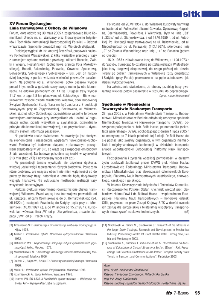 sitk XV Forum Dyskusyjne Linia tramwajowa z Ochoty do Wilanowa Forum, które odbyło się 30 maja 2005 r. zorganizowało Biuro Komunikacji Urzędu m. st. Warszawy oraz Stowarzyszenie Inżynierów i Techników Komunikacji Rzeczpospolitej Polskiej – Oddział w Warszawie. Spotkanie prowadził mgr inż. Wojciech Wojtysiak. Prelekcję wygłosił dr inż. Andrzej Brzeziński, pracownik naukowy Politechniki Warszawskiej. Z kilku wariantów przebiegu trasy z tramwajem wybrano wariant o przebiegu ulicami Banacha, Żwirki i Wigury, Rostafińskich (południowa granica Pola Mokotowskiego), Boboli, Rakowiecką, Puławską, Goworka, Spacerową, Belwederską, Sobieskiego i Sobieskiego – Bis. Jest on najbardziej korzystny z punktu widzenia wielkości przewozów pasażerskich. Na południe od al. Wilanowskiej potok pasażów wynosi ponad 7 tys. osób w godzinie szczytowego ruchu (w obu kierunkach), na odcinku północnym ok. 11 tys. Długość trasy wynosi 11,7 km,. z tego 2,8 km planowaną ul. Sobieskiego – Bis w realizowanym zespole osiedli Miasteczko Wilanów, obok budowanej Świątyni Opatrzności Bożej. Trasa ma być zasilana z 3 podstacji trakcyjnych: przy ul. Zajączkowskiej, Beethovena, al. Wilanowskiej. Wzdłuż ulicy Sobieskiego przewidziano wspólne torowisko tramwajowo-autobusowe przy krawężnikach obu jezdni. W organizacji ruchu, przede wszystkim w sygnalizacji, przewidziano priorytet dla komunikacji tramwajowej, a na przystankach – dynamiczny system informacji pasażerów. Na podstawie analiz stwierdzono, że inwestycja jest efektywna ekonomicznie i uzasadniona względami funkcjonalno-ruchowymi. Powinna być budowana etapami, z planowanym początkiem eksploatacji w 2010 r., co wiąże się z rozpoczęciem budowy 3 lata wcześniej. Na budowę potrzebne są środki w wysokości 213 mln (bez VAT) i nowoczesny tabor (39 szt.). Po prezentacji tematu wywiązała się ożywiona dyskusja, w której udział wzięli reprezentanci różnych środowisk. Poruszono różne problemy, ale wszyscy obecni nie mieli wątpliwości co do potrzeby budowy trasy, natomiast o terminie będą decydowały względy finansowe. Nie wykluczano możliwości realizacji trasy w systemie koncesyjnym. Podczas dyskusji wspominano również historię obsługi tramwajowej Wilanowa. Przed wojną trasa tramwajowa prowadziła od ul. Książęcej, ulicami Czerniakowską do pl. Bernardyńskiego (24. XII.1922 r.), następnie Powsińską do Sadyby, pętla przy ul. Morszyńskiej (10.XII.1927 r.), a do Wilanowa od 15.V.1937 r. Kursowała tam wówczas linia „W” od pl. Starynkiewicza, a czasie okupacji „2W” od pl. Trzech Krzyży. [3] Timoszenko S.P.: Staticzeskije i dinamiczeskije problemy teorii uprugosti. Kijew 1975. [4] Müller L. Przekładnie zębate. Obliczenia wytrzymałościowe. Warszawa 1972. [5] Ustinienko W.Ł.: Napriażennoje sotojanije zubjew cylindriczeskich prjamozybych koles. Moskwa 1972. [6] Muscheliszwili N.I.: Niekotoryje osnownyje zadaczi matematizeskoj teorii uprugosti. Moskwa 1966. [7] Osiński Z., Bajon W., Szucki T.: Podstawy konstrukcji maszyn. Warszawa 1986. [8] Müller L.: Przekładnie zębate. Projektowanie. Warszawa 1996. [9] Krzemieniecki A.: Tabor kolejowy. Warszawa 1976. [10] Norma PN-ISO 6336-3 Przekładnie zębate walcowe – Obliczanie nośności kół – Wytrzymałość zęba na zginanie. Po wojnie od 20.VII.1957 r. do Wilanowa kursowały tramwaje na trasie od ul. Puławskiej ulicami Goworka, Spacerową, Gagarina, Czerniakowską, Powsińską i Wiertniczą. Były to linie „33” i „33bis” od ul. Starynkiewicza, a od 13.VI.1959 r. od ul. Potockiej. Po likwidacji trasy tramwajowej na ul. Rakowieckiej, od al. Niepodległości do ul. Puławskiej (1.IX.1967r), skierowano linię „2” od Żerania Wschodniego oraz linię „14” od Banacha (potem od Okęcia). 16.IX.1973 r. zlikwidowano trasę do Wilanowa, a 11.XI.1973 r. do Sadyby, tłumacząc to działanie potrzebą realizacji Wisłostrady, jako trasy drogowej ekspresowej, do czego później nie doszło. Tereny po pętlach tramwajowych w Wilanowie (przy cmentarzu) i Sadybie (przy Forcie) przeznaczono na pętle autobusowe (do dzisiaj wykorzystywane). Na zakończenie stwierdzono, że obecny przebieg trasy gwarantuje większe potoki pasażerskie w stosunku do poprzedniego. Oprac. Adam Kotuszewski Spotkanie w Niemieckim Towarzystwie Naukowym Transportu 28 lipca 2005 r. w Federalnym Ministerstwie Transportu, Budownictwa i Mieszkalnictwa w Berlinie odbyło się uroczyste spotkanie Niemieckiego Towarzystwa Naukowego Transportu (DVWG), poświęcone pożegnaniu dr. hab. Ralfa Haase, pełnomocnika (sekretarza generalnego) DVWG, odchodzącego z dniem 1 lipca 2005 r. na emeryturę po 7 latach pełnienia tej funkcji. Dr Ralf Haase dał się poznać jako świetny organizator, w tym organizator niemieckich i międzynarodowych konferencji w dziedzinie transportu, a także współzałożyciel Europejskiej Platformy Nauk Transportowych. Podziękowania i życzenia wszelkiej pomyślności w dalszym życiu przekazali Jubilatowi prezes DVWG prof. Heiner Hautau i przedstawiciele Federalnego Ministerstwa Transportu, Budownictwa i Mieszkalnictwa oraz stowarzyszeń członkowskich Europejskiej Platformy Nauk Transportowych: austriackiego, chorwackiego, czeskiego i polskiego. W imieniu Stowarzyszenia Inżynierów i Techników Komunikacji Rzeczpospolitej Polskiej Stefan Krychniak wręczył prof. Gerhardowi Heimerl’owi i dr. Ralfowi Haase – współtwórcom Europejskiej Platformy Nauk Transportowych – honorowe odznaki SITK, przyznane im przez Zarząd Krajowy SITK w dowód uznania ich zasług dla europejskiej i bilateralnej współpracy transportowych stowarzyszeń naukowo-technicznych. (sk) [11] Sladkowski A., Sitarz M., Sladkowski J.: Research of the Stresses in the Large-Grain Gearings. Research and Development in Mechanical Industry. Proceedings of 3rd Int. Conf. RaDMI 2003. Herceg Novi, Serbia and Montenegro 2003. [12] Sładkowski A., Kuminek T.: Influenc