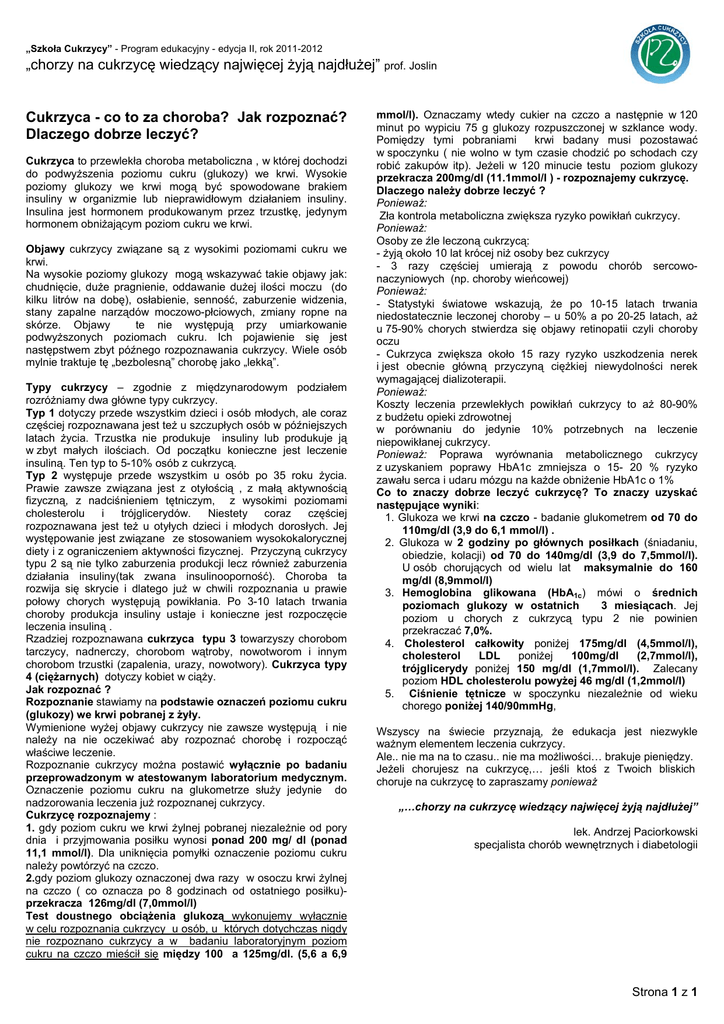 „Szkoła Cukrzycy” - Program edukacyjny - edycja II, rok 2011-2012 „chorzy na cukrzycę wiedzący najwięcej żyją najdłużej” prof. Joslin Cukrzyca - co to za choroba? Jak rozpoznać? Dlaczego dobrze leczyć? Cukrzyca to przewlekła choroba metaboliczna , w której dochodzi do podwyższenia poziomu cukru (glukozy) we krwi. Wysokie poziomy glukozy we krwi mogą być spowodowane brakiem insuliny w organizmie lub nieprawidłowym działaniem insuliny. Insulina jest hormonem produkowanym przez trzustkę, jedynym hormonem obniżającym poziom cukru we krwi. Objawy cukrzycy związane są z wysokimi poziomami cukru we krwi. Na wysokie poziomy glukozy mogą wskazywać takie objawy jak: chudnięcie, duże pragnienie, oddawanie dużej ilości moczu (do kilku litrów na dobę), osłabienie, senność, zaburzenie widzenia, stany zapalne narządów moczowo-płciowych, zmiany ropne na skórze. Objawy te nie występują przy umiarkowanie podwyższonych poziomach cukru. Ich pojawienie się jest następstwem zbyt późnego rozpoznawania cukrzycy. Wiele osób mylnie traktuje tę „bezbolesną” chorobę jako „lekką”. Typy cukrzycy – zgodnie z międzynarodowym podziałem rozróżniamy dwa główne typy cukrzycy. Typ 1 dotyczy przede wszystkim dzieci i osób młodych, ale coraz częściej rozpoznawana jest też u szczupłych osób w późniejszych latach życia. Trzustka nie produkuje insuliny lub produkuje ją w zbyt małych ilościach. Od początku konieczne jest leczenie insuliną. Ten typ to 5-10% osób z cukrzycą. Typ 2 występuje przede wszystkim u osób po 35 roku życia. Prawie zawsze związana jest z otyłością , z małą aktywnością fizyczną, z nadciśnieniem tętniczym, z wysokimi poziomami cholesterolu i trójglicerydów. Niestety coraz częściej rozpoznawana jest też u otyłych dzieci i młodych dorosłych. Jej występowanie jest związane ze stosowaniem wysokokalorycznej diety i z ograniczeniem aktywności fizycznej. Przyczyną cukrzycy typu 2 są nie tylko zaburzenia produkcji lecz również zaburzenia działania insuliny(tak zwana insulinooporność). Choroba ta rozwija się skrycie i dlatego już w chwili rozpoznania u prawie połowy chorych występują powikłania. Po 3-10 latach trwania choroby produkcja insuliny ustaje i konieczne jest rozpoczęcie leczenia insuliną . Rzadziej rozpoznawana cukrzyca typu 3 towarzyszy chorobom tarczycy, nadnerczy, chorobom wątroby, nowotworom i innym chorobom trzustki (zapalenia, urazy, nowotwory). Cukrzyca typy 4 (ciężarnych) dotyczy kobiet w ciąży. Jak rozpoznać ? Rozpoznanie stawiamy na podstawie oznaczeń poziomu cukru (glukozy) we krwi pobranej z żyły. Wymienione wyżej objawy cukrzycy nie zawsze występują i nie należy na nie oczekiwać aby rozpoznać chorobę i rozpocząć właściwe leczenie. Rozpoznanie cukrzycy można postawić wyłącznie po badaniu przeprowadzonym w atestowanym laboratorium medycznym. Oznaczenie poziomu cukru na glukometrze służy jedynie do nadzorowania leczenia już rozpoznanej cukrzycy. Cukrzycę rozpoznajemy : 1. gdy poziom cukru we krwi żylnej pobranej niezależnie od pory dnia i przyjmowania posiłku wynosi ponad 200 mg/ dl (ponad 11,1 mmol/l). Dla uniknięcia pomyłki oznaczenie poziomu cukru należy powtórzyć na czczo. 2.gdy poziom glukozy oznaczonej dwa razy w osoczu krwi żylnej na czczo ( co oznacza po 8 godzinach od ostatniego posiłku)przekracza 126mg/dl (7,0mmol/l) Test doustnego obciążenia glukozą wykonujemy wyłącznie w celu rozpoznania cukrzycy u osób, u których dotychczas nigdy nie rozpoznano cukrzycy a w badaniu laboratoryjnym poziom cukru na czczo mieścił się między 100 a 125mg/dl. (5,6 a 6,9 mmol/l). Oznaczamy wtedy cukier na czczo a następnie w 120 minut po wypiciu 75 g glukozy rozpuszczonej w szklance wody. Pomiędzy tymi pobraniami krwi badany musi pozostawać w spoczynku ( nie wolno w tym czasie chodzić po schodach czy robić zakupów itp). Jeżeli w 120 minucie testu poziom glukozy przekracza 200mg/dl (11.1mmol/l ) - rozpoznajemy cukrzycę. Dlaczego należy dobrze leczyć ? Ponieważ: Zła kontrola metaboliczna zwiększa ryzyko powikłań cukrzycy. Ponieważ: Osoby ze źle leczoną cukrzycą: - żyją około 10 lat krócej niż osoby bez cukrzycy - 3 razy częściej umierają z powodu chorób sercowonaczyniowych (np. choroby wieńcowej) Ponieważ: - Statystyki światowe wskazują, że po 10-15 latach trwania niedostatecznie leczonej choroby – u 50% a po 20-25 latach, aż u 75-90% chorych stwierdza się objawy retinopatii czyli choroby oczu - Cukrzyca zwiększa około 15 razy ryzyko uszkodzenia nerek i jest obecnie główną przyczyną ciężkiej niewydolności nerek wymagającej dializoterapii. Ponieważ: Koszty leczenia przewlekłych powikłań cukrzycy to aż 80-90% z budżetu opieki zdrowotnej w porównaniu do jedynie 10% potrzebnych na leczenie niepowikłanej cukrzycy. Ponieważ: Poprawa wyrównania metabolicznego cukrzycy z uzyskaniem poprawy HbA1c zmniejsza o 15- 20 % ryzyko zawału serca i udaru mózgu na każde obniżenie HbA1c o 1% Co to znaczy dobrze leczyć cukrzycę? To znaczy uzyskać następujące wyniki: 1. Glukoza we krwi na czczo - badanie glukometrem od 70 do 110mg/dl (3,9 do 6,1 mmol/l) . 2. Glukoza w 2 godziny po głównych posiłkach (śniadaniu, obiedzie, kolacji) od 70 do 140mg/dl (3,9 do 7,5mmol/l). U osób chorujących od wielu lat maksymalnie do 160 mg/dl (8,9mmol/l) 3. Hemoglobina glikowana (HbA1c) mówi o średnich poziomach glukozy w ostatnich 3 miesiącach. Jej poziom u chorych z cukrzycą typu 2 nie powinien przekraczać 7,0%. 4. Cholesterol całkowity poniżej 175mg/dl (4,5mmol/l), cholesterol LDL poniżej 100mg/dl (2,7mmol/l), trójglicerydy poniżej 150 mg/dl (1,7mmol/l). Zalecany poziom HDL cholesterolu powyżej 46 mg/dl (1,2mmol/l) 5. Ciśnienie tętnicze w spoczynku niezależnie od wieku chorego poniżej 140/90mmHg, Wszyscy na świecie przyznają, że edukacja jest niezwykle ważnym elementem leczenia cukrzycy.