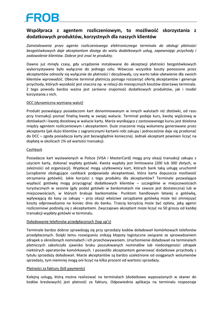 Współpraca z agentem rozliczeniowym, to możliwość skorzystania z dodatkowych produktów, korzystnych dla naszych klientów Zainstalowanie przez agenta rozliczeniowego elektronicznego terminala do obsługi płatności bezgotówkowych daje akceptantom dostęp do wielu dodatkowych usług, zapewniając przychody i zadowolenie klientów. Dobrze jest znać te produkty. Dawno już minęły czasy, gdy urządzenie instalowane do akceptacji płatności bezgotówkowych wykorzystywane było wyłącznie do jednego celu. Wówczas wszystkie koszty ponoszone przez akceptantów odnosiły się wyłącznie do płatności i decydowały, czy warto takie ułatwienie dla swoich klientów wprowadzić. Obecnie terminal płatniczy pomaga rozszerzyć ofertę akceptantów i generuje przychody, których wysokość jest znaczna np. w relacji do miesięcznych kosztów dzierżawy terminala. Z tego powodu bardzo ważna jest zarówno znajomość dodatkowych produktów, jak i model korzystania z nich. DCC (dynamiczna wymiana walut) Produkt pozwalający posiadaczom kart denominowanym w innych walutach niż złotówki, od razu przy transakcji poznać finalną kwotę w swojej walucie. Terminal podaje kurs, kwotę wyjściową w złotówkach i kwotę docelową w walucie karty. Marża wynikająca z zastosowanego kursu jest dzielona między agentem rozliczeniowym i akceptantem. Duże znaczenie mają wolumeny generowane przez akceptanta (jak dużo klientów z zagranicznymi kartami robi zakupy i jednocześnie daje się przekonać do DCC – zgoda posiadacza karty jest bezwzględnie konieczna). Jednak akceptant powinien liczyć na dopłatę w okolicach 1% od wartości transakcji. Cashback Posiadacze kart wystawionych w Polsce (VISA i MasterCard) mogą przy okazji transakcji zakupu z użyciem karty, dokonać wypłaty gotówki. Kwota wypłaty jest limitowana (200 lub 300 złotych, w zależności od organizacji). Wypłacać mogą użytkownicy kart, których bank taką usługę uruchomił (urządzenie obsługujące cashback podpowiada akceptantowi, która karta dopuszcza możliwość otrzymania gotówki). Jakie korzyści z tego produktu dla akceptantów? Terminale pozwalające wypłacić gotówkę mogą przyciągnąć dodatkowych klientów – szczególnie w miejscowościach turystycznych w sezonie (gdy podaż gotówki w bankomatach nie zawsze jest dostateczna) lub w miejscowościach, w których brakuje bankomatów. Punktom handlowym łatwiej o gotówkę, wpływającą do kasy za zakupy – przy okazji właściwe zarządzanie gotówką może też zmniejszyć koszty odprowadzania na koniec dnia do banku. Trzecią korzyścią może być opłata, jaką agenci rozliczeniowi podzielą się z akceptantami. Zwyczajowo akceptant może liczyć na 50 groszy od każdej transakcji wypłaty gotówki w terminalu. Doładowanie telefonów przedpłaconych (top up’s) Terminale bardzo dobrze sprawdzają się przy sprzedaży kodów doładowań komórkowych telefonów przedpłaconych. Dzięki temu rozwiązaniu znikają kłopoty logistyczne związane ze sprowadzaniem zdrapek o określonych nominałach i ich przechowywaniem. Uruchomienie doładowań na terminalach płatniczych zakończyło zjawisko braku poszukiwanych nominałów lub niedostępności zdrapek niektórych operatorów komórkowych. I pozwoliło akceptantom generować dodatkowe przychody z tytułu sprzedaży doładowań. Marże akceptantów są bardzo uzależnione od osiąganych wolumenów sprzedaży, tym niemniej mogą oni liczyć na kilka procent od wartości sprzedaży. Płatności za faktury (bill payments) Kolejną usługą, którą można realizować na terminalach (dodatkowo wyposażonych w skaner do kodów kreskowych) jest płatność za faktury. Odpowiednia aplikacja na terminalu rozpoznaje wystawcę faktury, autoryzuje płatność i drukuje potwierdzenie. Akceptanci udostępniający w swoich punktach usługę mogą liczyć na przyciągnięcie dodatkowych klientów oraz na opłatę od każdej przyjętej płatności. Opłata zależy nie tylko od wolumenów, ale również od rodzaju przyjętej faktury. Zwykle mieści się w przedziale 0,50-1,00 PLN. Programy lojalnościowe Terminale płatnicze powszechnie obsługują programy lojalnościowe – zarówno bardzo proste, funkcjonujące u jednego akceptanta, jak i te bardziej skomplikowane, multipartnerskie, działające w punktach wielu akceptantów. Najczęściej programy lojalnościowe wykorzystują specjalnie wydane karty, odczytywane przez terminal. Zdarzają się również rozwiązania, w których klienci podają swój kod, następnie wprowadzany przez kasjera do terminala. Urządzenia pozwalają zarówno przydzielać punkty lojalnościowe klientom za zakupy, jak i wykorzystywać je przy odbiorze przysługujących nagród. Udział w programach lojalnościowych jest odpłatny dla akceptantów – wykorzystanie terminala, który już pracuje w punkcie handlowo-usługowym może zmniejszyć ogólne koszty uczestnictwa. Couponing Terminal może ułatwić akceptantom prowadzenie programów couponingowych, opartych na wydawaniu klientom kuponów dających prawo do zniżek lub dodatkowych świadczeń. Wykorzystanie terminala zwiększa możliwości (parametry programu zależą wyłącznie od wyobraźni organizatorów) i ogranicza koszty logistyki – nie musimy przechowywać kuponów (drukuje je każdorazowo terminal).