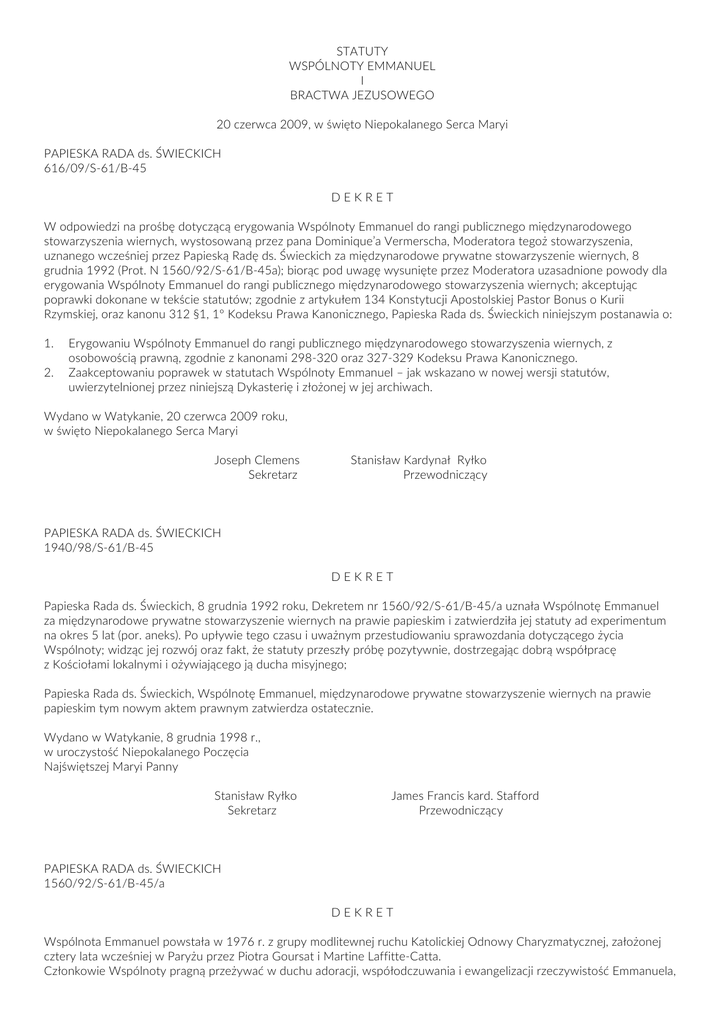 STATUTY WSPÓLNOTY EMMANUEL I BRACTWA JEZUSOWEGO 20 czerwca 2009, w święto Niepokalanego Serca Maryi PAPIESKA RADA ds. ŚWIECKICH 616/09/S-61/B-45 DEKRET W odpowiedzi na prośbę dotyczącą erygowania Wspólnoty Emmanuel do rangi publicznego międzynarodowego stowarzyszenia wiernych, wystosowaną przez pana Dominique’a Vermerscha, Moderatora tegoż stowarzyszenia, uznanego wcześniej przez Papieską Radę ds. Świeckich za międzynarodowe prywatne stowarzyszenie wiernych, 8 grudnia 1992 (Prot. N 1560/92/S-61/B-45a); biorąc pod uwagę wysunięte przez Moderatora uzasadnione powody dla erygowania Wspólnoty Emmanuel do rangi publicznego międzynarodowego stowarzyszenia wiernych; akceptując poprawki dokonane w tekście statutów; zgodnie z artykułem 134 Konstytucji Apostolskiej Pastor Bonus o Kurii Rzymskiej, oraz kanonu 312 §1, 1º Kodeksu Prawa Kanonicznego, Papieska Rada ds. Świeckich niniejszym postanawia o: 1. 2. Erygowaniu Wspólnoty Emmanuel do rangi publicznego międzynarodowego stowarzyszenia wiernych, z osobowością prawną, zgodnie z kanonami 298-320 oraz 327-329 Kodeksu Prawa Kanonicznego. Zaakceptowaniu poprawek w statutach Wspólnoty Emmanuel – jak wskazano w nowej wersji statutów, uwierzytelnionej przez niniejszą Dykasterię i złożonej w jej archiwach. Wydano w Watykanie, 20 czerwca 2009 roku, w święto Niepokalanego Serca Maryi Joseph Clemens Sekretarz Stanisław Kardynał Ryłko Przewodniczący PAPIESKA RADA ds. ŚWIECKICH 1940/98/S-61/B-45 DEKRET Papieska Rada ds. Świeckich, 8 grudnia 1992 roku, Dekretem nr 1560/92/S-61/B-45/a uznała Wspólnotę Emmanuel za międzynarodowe prywatne stowarzyszenie wiernych na prawie papieskim i zatwierdziła jej statuty ad experimentum na okres 5 lat (por. aneks). Po upływie tego czasu i uważnym przestudiowaniu sprawozdania dotyczącego życia Wspólnoty; widząc jej rozwój oraz fakt, że statuty przeszły próbę pozytywnie, dostrzegając dobrą współpracę z Kościołami lokalnymi i ożywiającego ją ducha misyjnego; Papieska Rada ds. Świeckich, Wspólnotę Emmanuel, międzynarodowe prywatne stowarzyszenie wiernych na prawie papieskim tym nowym aktem prawnym zatwierdza ostatecznie. Wydano w Watykanie, 8 grudnia 1998 r., w uroczystość Niepokalanego Poczęcia Najświętszej Maryi Panny Stanisław Ryłko Sekretarz James Francis kard. Stafford Przewodniczący PAPIESKA RADA ds. ŚWIECKICH 1560/92/S-61/B-45/a DEKRET Wspólnota Emmanuel powstała w 1976 r. z grupy modlitewnej ruchu Katolickiej Odnowy Charyzmatycznej, założonej cztery lata wcześniej w Paryżu przez Piotra Goursat i Martine Laffitte-Catta. Członkowie Wspólnoty pragną przeżywać w duchu adoracji, współodczuwania i ewangelizacji rzeczywistość Emmanuela, „Boga z nami”, w życiu codziennym. Eucharystia i Adoracja Eucharystyczna, a także kontemplacja w sercu świata, uzdalniają do współodczuwania z Jezusem, by kochać ubogich i służyć im, ewangelizować i zanosić Jego światło różnym kulturom i środowiskom. Miłość do Maryi, Matki Emmanuela, która pierwsza niosła Go światu, jest gwarancją wierności łasce pierwszego powołania. Wezwanie Ojca Świętego do nowej ewangelizacji skierowane do chrześcijan w adwencie poprzedzającym rok 2000 potwierdza powołanie Wspólnoty Emmanuel do uczestnictwa w wypełnianiu misji Kościoła we współczesnym świecie. Oddziaływanie Wspólnoty w licznych diecezjach i państwach różnych kontynentów, potwierdzone przez biskupów, pozwala uznać, że uczestniczy ona w ubogacaniu życia Kościoła, stając się coraz bardziej znakiem, że Bóg jest z nami. Z tej racji Papieska Rada ds. Świeckich przyjmuje prośbę przedstawioną 4 lutego 1992 r. przez Moderatora Wspólnoty Emmanuel. Po przestudiowaniu projektu statutów poddanego aprobacie i otrzymaniu zgody Jego Świątobliwości Papieża Jana Pawła II 20 listopada 1992 r., Papieska Rada ds. Świeckich uznaje Wspólnotę Emmanuel za powszechne prywatne stowarzyszenie wiernych na prawie papieskim, obdarzone osobowością prawną, zgodnie z przepisami kanonów 298 – 311 i 321 – 329 i zatwierdza jej statut ad experimentum na okres 5 lat. Niech fakt uznania przez Stolicę Apostolską utwierdzi Wspólnotę na jej drodze miłości do Kościoła, wierności jego nauczaniu i oddaniu na służbę, a także pomaga w coraz głębszym zakorzenianiu się Katolickiej Odnowy Charyzmatycznej we wspólnocie Kościoła. Niech Maryja, Matka i Królowa Kościoła prowadzi wciąż ku świętości wszystkich, którzy są i będą powołani, aby podążać za Emmanuelem. Wydano w Watykanie, 8 grudnia 1992 r., w uroczystość Niepokalanego Poczęcia Najświętszej Maryi Panny Paul J. Cordec Wiceprzewodniczący Eduardo F. Kardynał Pironio Przewodniczący STATUTY WSPÓLNOTY EMMANUEL I BRACTWA JEZUSOWEGO WPROWADZENIE I. WSPÓLNOTA EMMANUEL Wspólnota Emmanuel jest stowarzyszeniem wiernych wszystkich stanów życia. Wspólnota bierze swą nazwę z Pisma Świętego: „Oto Panna pocznie i porodzi Syna, któremu nadadzą imię Emmanuel, to znaczy Bóg z nami” (Mt 1,23). EMMANUEL to BÓG Z NAMI, obecny w naszym życiu codziennym. Wszyscy członkowie Wspólnoty uznają Jezusa za centrum swojego życia, aby „być w świecie, nie będąc ze świata”. Niektórzy z nich poszukują uświęcenia w zwyczajnym życiu rodzinnym i zawodowym, inni w celibacie ze względu na Królestwo Boże, jeszcze inni - w życiu całkowicie poświęconym apostolstwu. Najgłębsza łaska Wspólnoty wypływa z adoracji eucharystycznej Boga prawdziwie obecnego pośród nas, EMMANUELA. Z adoracji rodzi się współodczuwanie wobec wszystkich ludzi, którzy umierają z głodu, w znaczeniu materialnym lub duchowym. Ze współodczuwania zaś rodzi się pragnienie ewangelizacji całego świata, a zwłaszcza najuboższych. Powierzenie się Duchowi Świętemu, Słowo Boże, wstawiennictwo Maryi, Matki Bożej, sakramenty święte i liturgia zakorzeniają życie wspólnotowe i apostolskie w ży