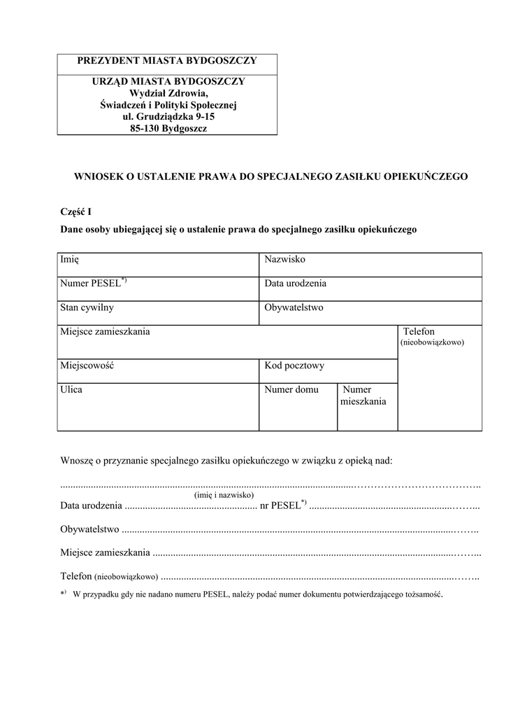 PREZYDENT MIASTA BYDGOSZCZY URZĄD MIASTA BYDGOSZCZY Wydział Zdrowia, Świadczeń i Polityki Społecznej ul. Grudziądzka 9-15 85-130 Bydgoszcz WNIOSEK O USTALENIE PRAWA DO SPECJALNEGO ZASIŁKU OPIEKUŃCZEGO Część I Dane osoby ubiegającej się o ustalenie prawa do specjalnego zasiłku opiekuńczego Imię Nazwisko Numer PESEL*) Data urodzenia Stan cywilny Obywatelstwo Miejsce zamieszkania Telefon (nieobowiązkowo) Miejscowość Kod pocztowy Ulica Numer domu Numer mieszkania Wnoszę o przyznanie specjalnego zasiłku opiekuńczego w związku z opieką nad: ...................................................................................................................……………………………….. (imię i nazwisko) Data urodzenia .................................................... nr PESEL*) ........................................................……... Obywatelstwo ..................................................................................................................................…….. Miejsce zamieszkania ......................................................................................................................……... Telefon (nieobowiązkowo) ...................................................................................................................…….. *) W przypadku gdy nie nadano numeru PESEL, naleŜy podać numer dokumentu potwierdzającego toŜsamość. Część II 1. Dane członków rodziny osoby ubiegającej się sprawującej opiekę (w tym dziecka do ukończenia 25. roku Ŝycia, a takŜe dziecka, które ukończyło 25 rok Ŝycia, legitymującego się orzeczeniem o znacznym stopniu niepełnosprawności, jeŜeli w związku z tą niepełnosprawnością przysługuje świadczenie pielęgnacyjne lub specjalny zasiłek opiekuńczy albo zasiłek dla opiekuna, o którym mowa w ustawie z dnia 4 kwietnia 2014 r. o ustaleniu i wypłacie zasiłków dla opiekunów (Dz. U. poz. 567, z późn zm.). Do członków rodziny nie zalicza się dziecka pozostającego pod opieką opiekuna prawnego, dziecka pozostającego w związku małŜeńskim, a takŜe pełnoletniego dziecka posiadającego własne dziecko. W skład rodziny wchodzą: 1....................................................................................................................................................... (imię i nazwisko stopień pokrewieństwa PESEL*) urząd skarbowy) 2....................................................................................................................................................... (imię i nazwisko stopień pokrewieństwa PESEL*) urząd skarbowy) 3....................................................................................................................................................... (imię i nazwisko stopień pokrewieństwa PESEL*) urząd skarbowy) 4....................................................................................................................................................... (imię i nazwisko stopień pokrewieństwa PESEL*) urząd skarbowy) 5....................................................................................................................................................... (imię i nazwisko *) stopień pokrewieństwa PESEL*) urząd skarbowy) W przypadku gdy nie nadano numeru PESEL, naleŜy podać numer dokumentu potwierdzającego toŜsamość. 2. Dane członków rodziny osoby wymagającej opieki, w przypadku, gdy osoba wymagająca opieki jest małoletnia (rodzice osoby wymagającej opieki, małŜonek rodzica osoby wymagającej opieki, osoba, z którą rodzic osoby wymagającej opieki wychowuje wspólne dziecko, pozostające na ich utrzymaniu dzieci w wieku do ukończenia 25. roku Ŝycia, a takŜe osoba wymagającą opieki; do członów rodziny nie zalicza się dziecka pozostającego pod opieką opiekuna prawnego, dziecka pozostającego w związku małŜeńskim, pełnoletniego dziecka posiadającego własne dziecko, a takŜe rodzica osoby wymagającej opieki zobowiązanego tytułem wykonawczym pochodzącym lub zatwierdzonym przez sąd do alimentów na jej rzecz). W skład rodziny wchodzą: 1.......................................................................................................................................................... (imię i nazwisko stopień pokrewieństwa PESEL*) urząd skarbowy) 2.......................................................................................................................................................... (imię i nazwisko stopień pokrewieństwa PESEL*) urząd skarbowy) 3.......................................................................................................................................................... (imię i nazwisko stopień pokrewieństwa PESEL*) urząd skarbowy) 4.......................................................................................................................................................... (imię i nazwisko stopień pokrewieństwa PESEL*) urząd skarbowy) 5.......................................................................................................................................................... (imię i nazwisko *) stopień pokrewieństwa PESEL*) urząd skarbowy) W przypadku gdy nie nadano numeru PESEL, naleŜy podać numer dokumentu potwierdzającego toŜsamość 3. Dane członków rodziny osoby wymagającej opieki, w przypadku gdy osoba wymagająca opieki jest pełnoletnia (osoba wymagającą opieki, małŜonek osoby wymagającej opieki, osoba, z którą osoba wymagająca opieki wychowuje wspólne dziecko oraz pozostające na ich utrzymaniu dzieci w wieku do ukończenia 25. roku Ŝycia; do członków rodziny nie zalicza się dziecka pozostającego pod opieką opiekuna prawnego, dziecka pozostającego w związku małŜeńskim, a takŜe pełnoletniego dziecka posiadającego własne dziecko). W skład rodziny wchodzą: 1.............................