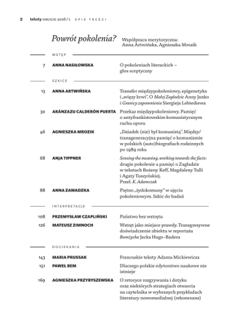 2 teksty drugie 2016 / 1 S P I S T R E Ś C I Powrót pokolenia? WSTĘP 7 ANNA NASIŁOWSKA SZKICE Współpraca merytoryczna: Anna Artwińska, Agnieszka Mrozik pokoleniach literackich – O głos sceptyczny 13 ANNA ARTWIŃSKA 30 ARÁNZAZU CALDERÓN PUERTA Przekaz międzypokoleniowy. Pamięć ransfer międzypokoleniowy, epigenetyka T i „więzy krwi”. O Małej Zagładzie Anny Janko i Granicy zapomnienia Siergieja Lebiediewa o antyfrankistowskim komunistycznym ruchu oporu 46 AGNIESZKA MROZIK „ Dziadek (nie) był komunistą”. Między/ transgeneracyjna pamięć o komunizmie w polskich (auto)biografiach rodzinnych po 1989 roku 68 ANJA TIPPNER S ensing the meaning, working towards the facts: drugie pokolenie a pamięć o Zagładzie w tekstach Bożeny Keff, Magdaleny Tulli i Agaty Tuszyńskiej. Przeł. K. Adamczak 88 ANNA ZAWADZKA iętno „żydokomuny” w ujęciu P pokoleniowym. Szkic do badań I N T E R P R E TA C J E 108 PRZEMYSŁAW CZAPLIŃSKI Państwo bez wstrętu 126 MATEUSZ ZIMNOCH stręt jako miejsce prawdy. Transgresywne W doświadczenie abiektu w reportażu Bomżycha Jacka Hugo-Badera DOCIEKANIA 143 MARIA PRUSSAK Francuskie teksty Adama Mickiewicza 151 PAWEŁ BEM laczego polskie edytorstwo naukowe nie D istnieje 169 AGNIESZKA PRZYBYSZEWSKA O retoryce rozgrywania i dotyku oraz niektórych strategiach otwarcia na czytelnika w wybranych przykładach literatury nowomedialnej (rekonesans) GLOSY 189 KAROLINA SZYMBORSKA hildren studies jako perspektywa C metodologiczna. Współczesne tendencje w badaniach nad dzieckiem 206 ELŻBIETA ZARYCH rzekład literatury dla dzieci i młodzieży – P między tekstem a oczekiwaniami wydawcy i czytelnika ROZTRZĄSANIA I ROZBIORY 228 DANUTA SZAJNERT O prze-pisywaniu 242 DARIUSZ ŚNIEŻKO Przywracanie głosu 253 ANNA ARTWIŃSKA, AGNIESZKA MROZIK pokoleniach z perspektywy O niemieckiej KO M E N TA R Z E 264 EWA KOBYŁECKA-PIWOŃSKA ombrowicz we współczesnej Argentynie. G Lektura grupy „Literal” 281 EWA KOBYŁECKA-PIWOŃSKA ziennik argentyński, czyli jakiego D Gombrowicza czyta się w Buenos Aires? 303 PAU FREIXA TERRADAS, BOŻENA ZABOKLICKA ombrowicz jako postać fikcyjna G w literaturze argentyńskiej P R E Z E N TA C J E 317 SIGRID WEIGEL ROZMOWY enealogia – ikonografia G i retoryka pewnej figury epistemologicznej. Przeł. K. Różańska 347 ANNA ARTWIŃSKA, MAŁGORZATA FIDELIS, AGNIESZKA MROZIK, ANNA ZAWADZKA PRZECHADZKI 367 Pożytki z „pokolenia”. Dyskusja o „pokoleniu” jako kategorii analitycznej WOJCIECH TOMASIK Jeszcze inna zabawa Lalką