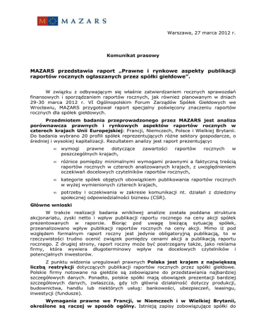 Warszawa, 27 marca 2012 r. Komunikat prasowy MAZARS przedstawia raport „Prawne i rynkowe aspekty publikacji raportów rocznych ogłaszanych przez spółki giełdowe”. W związku z odbywającym się właśnie zatwierdzaniem rocznych sprawozdań finansowych i sporządzaniem raportów rocznych, jak równieŜ planowanym w dniach 29-30 marca 2012 r. VI Ogólnopolskim Forum Zarządów Spółek Giełdowych we Wrocławiu, MAZARS przygotował raport specjalny poświęcony znaczeniu raportów rocznych dla spółek giełdowych. Przedmiotem badania przeprowadzonego przez MAZARS jest analiza porównawcza prawnych i rynkowych aspektów raportów rocznych w czterech krajach Unii Europejskiej: Francji, Niemczech, Polsce i Wielkiej Brytanii. Do badania wybrano 20 profili spółek reprezentujących róŜne sektory gospodarcze, o średniej i wysokiej kapitalizacji. Rezultatem analizy jest raport prezentujący: • wymogi prawne dotyczące poszczególnych krajach, • róŜnice pomiędzy minimalnymi wymogami prawnymi a faktyczną treścią raportów rocznych w czterech analizowanych krajach, z uwzględnieniem oczekiwań docelowych czytelników raportów rocznych, • kategorie spółek objętych obowiązkiem publikowania raportów rocznych w wyŜej wymienionych czterech krajach, • potrzeby i oczekiwania w zakresie komunikacji nt. działań z dziedziny społecznej odpowiedzialności biznesu (CSR). zawartości raportów rocznych w Główne wnioski W trakcie realizacji badania wnikliwej analizie została poddana struktura akcjonariatu, zyski netto i wpływ publikacji raportu rocznego na ceny akcji spółek prezentowanych w raporcie. Biorąc pod uwagę bieŜącą sytuację spółek, przeanalizowano wpływ publikacji raportów rocznych na ceny akcji. Mimo iŜ pod względem formalnym raport roczny jest jedynie obligatoryjną publikacją, to w rzeczywistości trudno ocenić związek pomiędzy cenami akcji a publikacją raportu rocznego. Z drugiej strony, raport roczny moŜe być postrzegany takŜe, jako reklama firmy, która wywiera długoterminowy wpływ na docelowych czytelników i potencjalnych inwestorów. Z punktu widzenia uregulowań prawnych Polska jest krajem z największą liczbą restrykcji dotyczących publikacji raportów rocznych przez spółki giełdowe. Polskie firmy notowane na giełdzie są zobowiązane do przedstawiania najbardziej szczegółowych danych. Ponadto, polskie spółki mają obowiązek prezentacji bardziej szczegółowych danych, zwłaszcza, gdy ich główna działalność dotyczy produkcji, budownictwa, handlu lub niektórych usług: bankowości, ubezpieczeń, leasingu, inwestycji (fundusze). Wymagania prawne we Francji, w Niemczech i w Wielkiej Brytanii, określone są raczej w sposób ogólny. Istnieją zapisy zobowiązujące spółki do poinformowania o kluczowych rodzajach prowadzonej działalności oraz do ujawniania najwaŜniejszych wg nich informacji. Aby spełnić wymagany prawem obowiązek wystarczy więc zaledwie kilka stron raportu rocznego. Konieczne jest ujawnianie tylko tych informacji, które mogą być istotne dla zrozumienia sytuacji firmy, niezaleŜnie od obszaru działań. Oprócz danych finansowych, firmy działające w sektorach przemysłu, których działalność moŜe niekorzystnie wpływać na środowisko, muszą prezentować dane dotyczące działań CSR. W związku z powyŜszym, z jednej strony przepisy mają charakter ogólny, a z drugiej, kluczowe kwestie muszą być opisane szczegółowo. Publikacja wskazuje takŜe róŜnice wynikające z rzeczywistej zawartości raportu w stosunku do wymogów prawnych dotyczących raportów rocznych. Okazuje się, Ŝe raporty roczne spółek traktowane są jako istotne narzędzie marketingowe i zawierają znaczną ilość informacji dotyczących operacji i działalności, które mają zwrócić uwagę akcjonariuszy. „Spółki zagraniczne nie ograniczają się tylko do wymaganego prawem minimum, ale dostarczają takŜe wielu informacji niefinansowych, pozwalających na ocenę potencjału firmy w znacznie szerszym kontekście, co daje akcjonariuszom i inwestorom pełniejszą wiedzę do podjęcia właściwych decyzji” – mówi Monika Kaczorek, partner, wiceprezes zarządu Mazars Audyt Sp. z o.o. Spółki publikują więc dodatkowe informacje o członkach zarządów, innowacjach, pozycji firm w róŜnych obszarach, nagrodach, strukturach organizacyjnych, szczegółach dotyczących działań CSR, partnerach, certyfikatach, trendach w otoczeniu biznesowym. Raporty roczne spółek francuskich powinny obowiązkowo zawierać informacje, które są kluczowe dla zrozumienia sytuacji przedsiębiorstwa i moŜliwych przyszłych kierunków jego rozwoju. MoŜe to być jednocześnie jeden ze sposobów na zwrócenie uwagi inwestorów, podniesienie zaufania i zdobycie uznania dla spółki. Prezentacja działań społecznie odpowiedzialnych moŜe przyczynić się do wzrostu zaufania, bo taka działalność jest dobrze odbierana przez społeczeństwo. Raport roczny moŜe dotyczyć równieŜ zmieniających się trendów w preferencjach klientów i przedsięwziętych przez spółkę działaniach zmierzających do dopasowania do nich produktów (Michelin) lub wyników badania satysfakcji klientów (BNP Paribas, Renault). Spółki brytyjskie zwracają uwagę na szczegółową prezentację członków zarządów, publikując w raportach rocznych ich biografie. W ten sposób akcjonariusze posiadają pełną informację o osobach odpowiedzialnych za rozwój spółki i mogą łatwiej podjąć decyzje inwestycyjne. Innym zaobserwowanym trendem jest szczegółowe opisywanie rynku. Dowodzi to dbałości o bezpieczeństwo inwestorów. Dla przykładu, dla spółek działających w sektorach szkodliwych dla środowiska naturalnego istotnym moŜe być przedstawienie polityki CSR i podjętych działań, co juŜ w przypadku spółek z branŜy finansowej nie ma takiego znaczenia. W Niemczech wszystkie analizowane raporty roczne (poza raportem firmy 