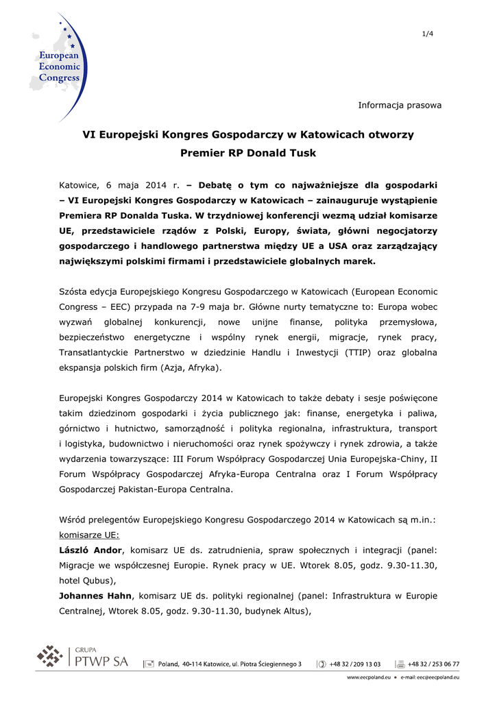 1/4 Informacja prasowa VI Europejski Kongres Gospodarczy w Katowicach otworzy Premier RP Donald Tusk Katowice, 6 maja 2014 r. – Debatę o tym co najważniejsze dla gospodarki – VI Europejski Kongres Gospodarczy w Katowicach – zainauguruje wystąpienie Premiera RP Donalda Tuska. W trzydniowej konferencji wezmą udział komisarze UE, przedstawiciele rządów z Polski, Europy, świata, główni negocjatorzy gospodarczego i handlowego partnerstwa między UE a USA oraz zarządzający największymi polskimi firmami i przedstawiciele globalnych marek. Szósta edycja Europejskiego Kongresu Gospodarczego w Katowicach (European Economic Congress – EEC) przypada na 7-9 maja br. Główne nurty tematyczne to: Europa wobec wyzwań globalnej bezpieczeństwo konkurencji, energetyczne i nowe unijne finanse, polityka wspólny rynek energii, migracje, przemysłowa, rynek pracy, Transatlantyckie Partnerstwo w dziedzinie Handlu i Inwestycji (TTIP) oraz globalna ekspansja polskich firm (Azja, Afryka). Europejski Kongres Gospodarczy 2014 w Katowicach to także debaty i sesje poświęcone takim dziedzinom gospodarki i życia publicznego jak: finanse, energetyka i paliwa, górnictwo i hutnictwo, samorządność i polityka regionalna, infrastruktura, transport i logistyka, budownictwo i nieruchomości oraz rynek spożywczy i rynek zdrowia, a także wydarzenia towarzyszące: III Forum Współpracy Gospodarczej Unia Europejska-Chiny, II Forum Współpracy Gospodarczej Afryka-Europa Centralna oraz I Forum Współpracy Gospodarczej Pakistan-Europa Centralna. Wśród prelegentów Europejskiego Kongresu Gospodarczego 2014 w Katowicach są m.in.: komisarze UE: László Andor, komisarz UE ds. zatrudnienia, spraw społecznych i integracji (panel: Migracje we współczesnej Europie. Rynek pracy w UE. Wtorek 8.05, godz. 9.30-11.30, hotel Qubus), Johannes Hahn, komisarz UE ds. polityki regionalnej (panel: Infrastruktura w Europie Centralnej, Wtorek 8.05, godz. 9.30-11.30, budynek Altus), 2/4 Informacja prasowa główni negocjatorzy TTIP Ignacio Garcia Bercero, główny negocjator transatlantyckiego partnerstwa z ramienia UE (panel: Unia Europejska-USA. Założenia i perspektywy negocjacji w sprawie Transatlantyckiego Partnerstwa w zakresie Handlu i Inwestycji (TTIP), 7 maja, godz. 12.30-14.00, Centrum Kultury Katowice), Dan Mullaney, główny negocjator USA (panele: Unia Europejska-USA. Założenia i perspektywy negocjacji w sprawie Transatlantyckiego Partnerstwa w zakresie Handlu i Inwestycji (TTIP), 7 maja, godz. 12.30-14.00, Centrum Kultury Katowice oraz Partnerstwo transatlantyckie – skutki dla gospodarki, 8 maja, godz. 9.30-11.30, hotel Monopol), goście ze świata, m.in.: Kamel Bennaceur, minister przemysłu, energetyki i górnictwa Tunezji (II Forum Współpracy Gospodarczej Afryka-Europa Centralna, 8 maja, godz. 9.30-11.30, budynek Altus), Zoltán Cséfalvay, minister stanu, Ministerstwo Gospodarki Narodowej Węgier (panele: Europejska i globalna współpraca gospodarcza. W 10 lat po rozszerzeniu UE. 7 maja, godz. 10.30-11.45, Centrum Kultury Katowice oraz Europa przyszłości, 8 maja, godz. 12.00-14.00, hotel Monopol i Przemysł motoryzacyjny w Europie, 9 maja, godz. 9.3011.30 budynek Altus), Khurram Dastgir Khan, minister handlu Pakistanu (panele: Europejska i globalna współpraca gospodarcza. W 10 lat po rozszerzeniu UE. 7 maja, godz. 10.30-11.45, Centrum Kultury Katowice oraz Forum współpracy gospodarczej Pakistan-Europa Centralna, 8 maja, godz. 9.30-11.30, budynek Altus), Essossimna Legzim-Balouki, minister handlu i promocji sektora prywatnego Togo (panele: Europejska i globalna współpraca gospodarcza. W 10 lat po rozszerzeniu UE. 7 maja, godz. 10.30-11.45, Centrum Kultury Katowice oraz II Forum Współpracy Gospodarczej Afryka-Europa Centralna, 8 maja, godz. 9.30-11.30, budynek Altus), Jaroslav Neverovič – minister ds. energii Litwy (panel: Energia w Europie, energia na świecie, 7 maja, godz. 16.45-18.30, Centrum Kultury Katowice), Antonín Prachař, minister transportu Czech (panel: Centralnej, Wtorek 8.05, godz. 9.30-11.30, budynek Altus), Infrastruktura w Europie 3/4 Informacja prasowa oraz przedstawiciele rządu RP Elżbieta Bieńkowska, wicepremier, minister infrastruktury i rozwoju RP (panel: Infrastruktura w Europie Centralnej, Wtorek 8.05, godz. 9.30-11.30, budynek Altus), Maciej Grabowski, minister środowiska RP (panel: II Pakiet klimatyczny UE? Energetyka wobec nowych wyzwań, 9 maja, godz. 9.30-11.30, budynek Altus), Lena Kolarska-Bobińska, minister nauki i szkolnictwa wyższego RP (panele: Innowacyjność, badania i rozwój, 8 maja, godz. 9.30-11.30, budynek Altus oraz Mechanizmy rynkowe dla inteligentnego rozwoju, 8 maja, godz. 12.00-14.00, hotel Qubus), Władysław Kosiniak-Kamysz, minister pracy i polityki społecznej RP (panel: Migracje we współczesnej Europie. Rynek pracy w UE. Wtorek 8.05, godz. 9.30-11.30, hotel Qubus), Janusz Piechociński, wicepremier, minister gospodarki RP (panele: Europejska i globalna współpraca gospodarcza. W 10 lat po rozszerzeniu UE. 7 maja, godz. 10.3011.45, Centrum Kultury Katowice oraz Unia Europejska-USA. Założenia i perspektywy negocjacji w sprawie Transatlantyckiego Partnerstwa w zakresie Handlu i Inwestycji (TTIP), 7 maja, godz. 12.30-14.00, Centrum Kultury Katowice i Energia w Europie, energia na świecie, 7 maja, godz. 16.45-18.30, Centrum Kultury Katowice), Mateusz Szczurek, minister finansów RP (panel: Finanse publiczne, 8 maja, godz. 14.30-16.00, hotel Monopol), Rafał Trzaskowski, minister administracji i cyfryzacji RP (panele: E-commerce w gospodarce, 8 maja, godz.12.00-14.00, budynek Altus oraz Cyfryzacja w gospodarce i administracji, 8 maja, godz. 14.30-16.30, budynek Altus). *** Europejski Kongres Gospodarczy (European Economic Congress – EEC) w Katowicach to trzydniowy cykl debat, spotkań i wydarzeń towarzyszących z udziałem sześciu tysięcy gości z Polski, Europy, świata. W blisko 100 sesjach bierze co roku udzi