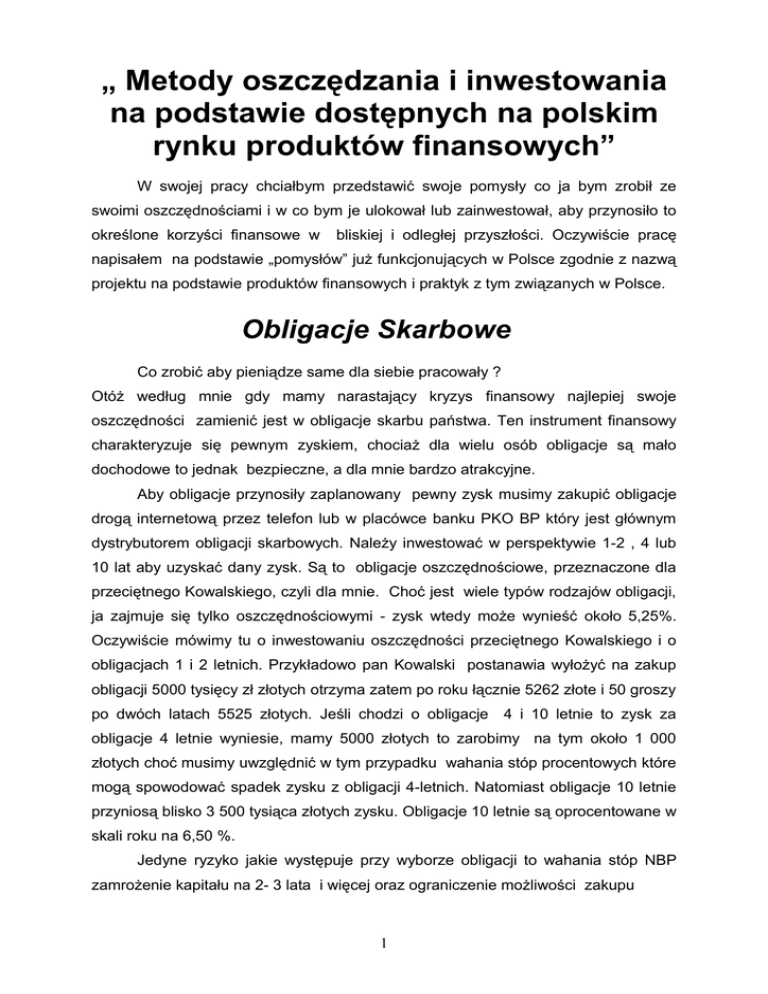 „ Metody oszczędzania i inwestowania na podstawie dostępnych na polskim rynku produktów finansowych” W swojej pracy chciałbym przedstawić swoje pomysły co ja bym zrobił ze swoimi oszczędnościami i w co bym je ulokował lub zainwestował, aby przynosiło to określone korzyści finansowe w bliskiej i odległej przyszłości. Oczywiście pracę napisałem na podstawie „pomysłów” już funkcjonujących w Polsce zgodnie z nazwą projektu na podstawie produktów finansowych i praktyk z tym związanych w Polsce. Obligacje Skarbowe Co zrobić aby pieniądze same dla siebie pracowały ? Otóż według mnie gdy mamy narastający kryzys finansowy najlepiej swoje oszczędności zamienić jest w obligacje skarbu państwa. Ten instrument finansowy charakteryzuje się pewnym zyskiem, chociaż dla wielu osób obligacje są mało dochodowe to jednak bezpieczne, a dla mnie bardzo atrakcyjne. Aby obligacje przynosiły zaplanowany pewny zysk musimy zakupić obligacje drogą internetową przez telefon lub w placówce banku PKO BP który jest głównym dystrybutorem obligacji skarbowych. Należy inwestować w perspektywie 1-2 , 4 lub 10 lat aby uzyskać dany zysk. Są to obligacje oszczędnościowe, przeznaczone dla przeciętnego Kowalskiego, czyli dla mnie. Choć jest wiele typów rodzajów obligacji, ja zajmuje się tylko oszczędnościowymi - zysk wtedy może wynieść około 5,25%. Oczywiście mówimy tu o inwestowaniu oszczędności przeciętnego Kowalskiego i o obligacjach 1 i 2 letnich. Przykładowo pan Kowalski postanawia wyłożyć na zakup obligacji 5000 tysięcy zł złotych otrzyma zatem po roku łącznie 5262 złote i 50 groszy po dwóch latach 5525 złotych. Jeśli chodzi o obligacje 4 i 10 letnie to zysk za obligacje 4 letnie wyniesie, mamy 5000 złotych to zarobimy na tym około 1 000 złotych choć musimy uwzględnić w tym przypadku wahania stóp procentowych które mogą spowodować spadek zysku z obligacji 4-letnich. Natomiast obligacje 10 letnie przyniosą blisko 3 500 tysiąca złotych zysku. Obligacje 10 letnie są oprocentowane w skali roku na 6,50 %. Jedyne ryzyko jakie występuje przy wyborze obligacji to wahania stóp NBP zamrożenie kapitału na 2- 3 lata i więcej oraz ograniczenie możliwości zakupu 1 obligacji do ściśle określonego okresu subskrypcji. Korzyści są za to dużo większe, ponieważ mamy pewny określony zysk, a odsetki możemy wypłacać jak chcemy – kwartalnie, półrocznie lub pod koniec terminu wykupu natomiast gdy mamy obligacje wykupione na giełdzie papierów wartościowych podobnie jak akcje możemy je sprzedać po aktualnej cenie rynkowej. Cena emisyjna obligacji waha się miedzy 99,90 złotych – a 100 złotych. Głównym ich” emitentem „ jest państwo polskie które wypłaci nam należne pieniądze razem z uzyskanym zyskiem. Możemy zarobić na tej operacji, ale również państwo polskie zdobywa pieniądze z emisji obligacji na niezbędne inwestycje państwowe i finansowanie deficytu budżetowego, a wiec korzyści są dwustronne . Jeśli chodzi o nabywanie obligacji skarbu państwa hurtowo i po niższej cenie to bardzo polecam 2 fundusze PKO/Credit Suisse obligacji długoterminowych . ’’PKO CREDIT SUISSE” Obligacji Długoterminowych inwestuje m.in. w bezpieczne, wysokooprocentowane Obligacje Skarbu Państwa. To Fundusz o niskim poziomie ryzyka, rekomendowany dla osób ceniących bezpieczeństwo. Fundusz ma możliwość wypracowania większych zysków niż klient indywidualny kupujący obligacje, ponieważ może nabywać je od Skarbu Państwa hurtowo i po niższej cenie. W obecnej sytuacji rynkowej jest to bezpieczna forma inwestowania umożliwiająca osiągnięcie wysokiej stopy zwrotu. W 2008 r. PKO CREDIT SUISSE Obligacji Długoterminowych osiągnął stopę zwrotu na poziomie 21,46%*. Korzyści :Długoterminowy wzrost wartości aktywów poprzez inwestowanie w polskie i zagraniczne papiery wartościowe, przy zachowaniu kontrolowanego poziomu ryzyka inwestycji. Cechy funduszu: • Rekomendowany dla osób posiadających nadwyżki finansowe, które myślą o inwestycji w średnim lub długim terminie i akceptują jedynie ograniczony poziom ryzyka, • Propozycja dla osób ceniących bezpieczeństwo i możliwości pomnażania kapitału, przy zachowaniu wysokiej płynności inwestycji, 2 • Długoterminowy wzrost wartości aktywów funduszu poprzez inwestowanie powierzonych środków w polskie i zagraniczne papiery wartościowe, przy zachowaniu kontrolowanego poziomu ryzyka inwestycji, • W portfelu funduszu znajdują się starannie dobrane przez doradców obligacje o wysokich ratingach inwestycyjnych, • Rekomendowany czas inwestycji: min. 2,5 roku, • Minimalna wpłata 100 zł (50 zł w ramach Planu Systematycznego Oszczędzania). Informacje o funduszu: • Fundusz funkcjonuje od 14 grudnia 2005 roku. • Aktywa netto 204 mln zł (dane na dzień 31.12.2008 roku). • Wyniki funduszu (dane na dzień 31.01.2008 roku): 3 Drugi fundusz to natomiast fundusz stabilnego wzrostu którego główne korzyści to : Bezpieczny, średnio i długoterminowy wzrost wartości inwestycji poprzez inwestowanie powierzonych środków w polskie i zagraniczne papiery wartościowe, przy dążeniu do ograniczenia ryzyka inwestycji. Cechy funduszu: • Inwestycja głównie w obligacje i bony skarbowe • Niewielki udział akcji w portfelu pozwala w dłuższej perspektywie oczekiwać wyższych zysków niż fundusze oparte tylko na obligacjach • Bezpieczna i zyskowna inwestycja dla inwestorów o dłuższym horyzoncie inwestycyjnym (powyżej 3 lat) • Fundusz o umiarkowanym ryzyku wahań wartości inwestycji Informacje o funduszu: • Fundusz funkcjonuje od 23 stycznia 1998 roku. • Wyniki funduszu (dane na dzień 31.01.2008 roku)*: • Aktywa netto 1 mld 688 mln zł (dane na dzień 31.12.2008 roku).” 4 Informację , Ilustrację i charakterystyka funduszy cytowana ze strony internetowej banku PKO BP. Podsumowując obligacje skarbu państw