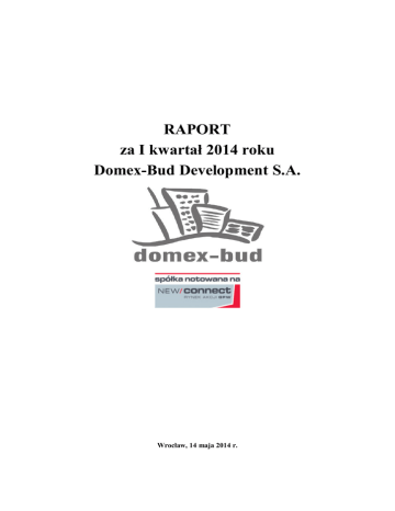 RAPORT za I kwartał 2014 roku Domex-Bud Development S.A. Wrocław, 14 maja 2014 r. Raport za I kwartał 2014 roku SPIS TREŚCI I. LIST ZARZĄDU DO AKCJONARIUSZY ................................................................. 3 II. WYBRANE DANE FINANSOWE ............................................................................... 4 III. ZWIĘZŁA CHARAKTERYSTYKA ISTOTNYCH DOKONAŃ LUB NIEPOWODZEŃ EMITENTA W OKRESIE, KTÓREGO DOTYCZY RAPORT, WRAZ Z OPISEM NAJWAŻNIEJSZYCH CZYNNIKÓW I ZDARZEŃ, W SZCZEGÓLNOŚCI O NIETYPOWYM CHARAKTERZE, MAJĄCYCH WPŁYW NA OSIĄGNIĘTE WYNIKI ...................................................................................................... 5 IV. INFORMACJE ZARZĄDU NA TEMAT AKTYWNOŚCI W I KW. 2014 W OBSZARZE ROZWOJU PROWADZONEJ DZIAŁALNOŚCI, W SZCZEGÓLNOŚCI POPRZEZ DZIAŁANIA NASTAWIONE NA WPROWADZENIE ROZWIĄZAŃ INNOWACYJNYCH W PRZEDSIĘBIORSTWIE . ................................................................................................................................. 5 V. INFORMACJE O ZASADACH PRZYJĘTYCH PRZY SPORZĄDZANIU RAPORTU, W TYM INFORMACJE O ZMIANACH STOSOWANYCH ZASAD (POLITYKI) RACHUNKOWOŚCI .................................................................................... 5 VI. SPRAWOZDANIE FINANSOWE .............................................................................. 7 VII. WŁADZE SPÓŁKI S.A. ..................................................................................... 13 1. Zarząd Spółki S.A. ...................................................................................................... 13 2. Rada Nadzorcza Spółki S.A...................................................................................... 13 VIII. AKCJONARIAT ................................................................................................... 13 IX. STRATEGIA ROZWOJU .......................................................................................... 14 X. INFORMACJE DOTYCZĄCE LICZBY OSÓB ZATRUDNIONYCH PRZEZ EMITENTA, W PRZELICZENIU NA PEŁNE ETATY .................................................. 15 XI. SPÓŁKI ZALEŻNE .................................................................................................... 15 XII. STANOWISKO ODNOŚNIE MOŻLIWOŚCI ZREALIZOWANIA PUBLIKOWANYCH PROGNOZ WYNIKÓW NA DANY ROK ................................... 15 XIII. OŚWIADCZENIE ZARZĄDU W SPRAWIE RZETELNOŚCI SPRAWOZDANIA FINANSOWEGO ............................................................................. 15 XIV. DANE ADRESOWE ............................................................................................ 15 www.domex-bud.pl 2 Raport za I kwartał 2014 roku I. LIST ZARZĄDU DO AKCJONARIUSZY Wrocław, 14 maja 2014 r. Szanowni Akcjonariusze, Mamy przyjemność przedstawić Państwu raport kwartalny spółki Domex-Bud Development S.A., prezentujący wyniki osiągnięte przez Spółkę w pierwszym kwartale 2014 r. Spółka w pierwszym kwartale 2014 roku poniosła stratę w wysokości 62,7 tys. zł, co wynika z faktu transformacji, która obecnie ma miejsce. Spółka pod koniec 2013 roku sprzedała wszystkie ruchomości i nieruchomości związane z działalnością deweloperską. Działania te miały na celu przygotować Spółkę do zmiany profilu działalności. W marcu 2014 r. NWZA podjęło uchwały o zmianie nazwy na BPX S.A. i zmianie profilu działalności. Obecnie trwa proces rejestracji zmian w KRS. Spółka będzie specjalizowała się w doskonaleniu procesów zarządzania z wykorzystaniem systemów informatycznych, klasy ERP i Business Intelligence. W ofercie Spółki znajdą się usługi doradcze dotyczące wykorzystania systemów informatycznych, wdrożenia systemów wspomagających zarządzanie, usługi związane z rozwojem i utrzymaniem tych systemów w ruchu jak również szeroko rozumiane doradztwo biznesowe. W portfolio produktowym Spółki znajdować się będą zarówno systemy klasy ERP (SAP i Infor), jak też nowoczesny system Business Discovery oparty o technologię in memory – QlikView. Zarząd zakłada, że pierwsze pozytywne efekty powyższych zmian będą widoczne już w trzecim kwartale 2014 roku. Dziękujemy za zaufanie, jakim Państwo nas obdarzyliście. Z poważaniem Zarząd Domex-Bud Development S.A. www.domex-bud.pl 3 Raport za I kwartał 2014 roku II. WYBRANE DANE FINANSOWE Poniżej zaprezentowano wybrane dane finansowe Domex-Bud Development S.A. za I kwartał 2014 roku i za I kwartał 2013 roku. Wybrane dane finansowe w PLN Należności długoterminowe Należności krótkoterminowe Środki pieniężne Kapitał własny Zobowiązania długoterminowe Zobowiązania krótkoterminowe Kapitał zakładowy Wybrane dane finansowe w PLN 31.03.2014 31.03.2013 0,00 148 513,76 33 436,07 4 098 190,71 0,00 76 685,29 3 562 537,00 0,00 2 257 426,00 1 561 996,11 6 176 739,60 0,00 1 017 596,83 4 441 537,00 od 01.01.2014 do 31.03.2014 od 01.01.2013 do 31.03.2013 Zysk/strata ze sprzedaży 59 575,60 -106 651,21 3 273 659,30 -163 332,33 Zysk/strata na działalności operacyjnej -104 175,88 -73 828,25 -62 746,14 -62 746,14 0,00 -73 995,82 -73 995,82 5 038,96 3 249 766,31 1 841 522,59 -4 025 000,00 -176 099,63 0,00 -351 812,73 -775 233,69 1 313 610,23 Przychody netto ze sprzedaży Zysk/strata brutto Zysk/strata netto Amortyzacja Przepływy pieniężne netto z działalności operacyjnej Przepływy pieniężne netto z działalności inwestycyjnej Przepływy pieniężne netto z działalności finansowej Przepływy pieniężne netto razem www.domex-bud.pl 4 Raport za I kwartał 2014 roku III. ZWIĘZŁA CHARAKTERYSTYKA ISTOTNYCH DOKONAŃ LUB NIEPOWODZEŃ EMITENTA W OKRESIE, KTÓREGO DOTYCZY RAPORT, WRAZ Z OPISEM NAJWAŻNIEJSZYCH CZYNNIKÓW I ZDARZEŃ, W SZCZEGÓLNOŚCI O NIETYPOWYM CHARAKTERZE, MAJĄCYCH WPŁYW NA OSIĄGNIĘTE WYNIKI W pierwszym kwartale 2014 roku Spółka przechodziła proces zmian i transformacji mających na celu przygotowanie Spółki do zmiany profilu dz
