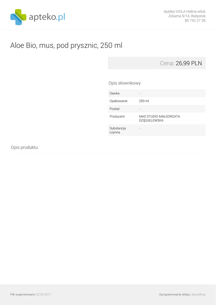 Apteka VIOLA Halina wiluk Żelazna 9/14, Białystok 85 742 27 35 Aloe Bio, mus, pod prysznic, 250 ml Cena: 26,99 PLN Opis słownikowy Dawka - Opakowanie 250 ml Postać - Producent MAD STUDIO MAŁGORZATA DZIĘGIELEWSKA Substancja czynna - Opis produktu Plik wygenerowano: 02-03-2017 Powered by TCPDF (www.tcpdf.org) Oprogramowanie sklepu: AptusShop