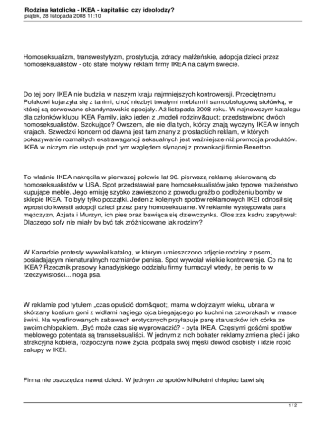 Rodzina katolicka - IKEA - kapitaliści czy ideolodzy? piątek, 28 listopada 2008 11:10 Homoseksualizm, transwestytyzm, prostytucja, zdrady małżeńskie, adopcja dzieci przez homoseksualistów - oto stałe motywy reklam firmy IKEA na całym świecie. Do tej pory IKEA nie budziła w naszym kraju najmniejszych kontrowersji. Przeciętnemu Polakowi kojarzyła się z tanimi, choć niezbyt trwałymi meblami i samoobsługową stołówką, w której są serwowane skandynawskie specjały. Aż listopada 2008 roku. W najnowszym katalogu dla członków klubu IKEA Family, jako jeden z „modeli rodziny" przedstawiono dwóch homoseksualistów. Szokujące? Owszem, ale nie dla tych, którzy znają wyczyny IKEA w innych krajach. Szwedzki koncern od dawna jest tam znany z prostackich reklam, w których pokazywanie rozmaitych ekstrawagancji seksualnych jest ważniejsze niż promocja produktów. IKEA w niczym nie ustępuje pod tym względem słynącej z prowokacji firmie Benetton. To właśnie IKEA nakręciła w pierwszej połowie lat 90. pierwszą reklamę skierowaną do homoseksualistów w USA. Spot przedstawiał parę homoseksualistów jako typowe małżeństwo kupujące meble. Jego emisję szybko zawieszono z powodu gróźb o podłożeniu bomby w sklepie IKEA. To były tylko początki. Jeden z kolejnych spotów reklamowych IKEI odnosił się wprost do kwestii adopcji dzieci przez pary homoseksualne. W reklamie występowała para mężczyzn, Azjata i Murzyn, ich pies oraz bawiąca się dziewczynka. Głos zza kadru zapytywał: Dlaczego sofy nie miały by być tak zróżnicowane jak rodziny? W Kanadzie protesty wywołał katalog, w którym umieszczono zdjęcie rodziny z psem, posiadającym nienaturalnych rozmiarów penisa. Spot wywołał wielkie kontrowersje. Co na to IKEA? Rzecznik prasowy kanadyjskiego oddziału firmy tłumaczył wtedy, że penis to w rzeczywistości... noga psa. W reklamie pod tytułem „czas opuścić dom", mama w dojrzałym wieku, ubrana w skórzany kostium goni z widłami nagiego ojca biegającego po kuchni na czworakach w masce świni. Na wyrafinowanych zabawach erotycznych przyłapuje parę staruszków ich córka ze swoim chłopakiem. „Być może czas się wyprowadzić? - pyta IKEA. Częstymi gośćmi spotów meblowego potentata są transseksualiści. W jednym z nich bohater reklamy zmienia płeć i jako atrakcyjna kobieta, rozpoczyna nowe życia, podpala swój męski dowód osobisty i idzie robić zakupy w IKEI. Firma nie oszczędza nawet dzieci. W jednym ze spotów kilkuletni chłopiec bawi się 1/2 Rodzina katolicka - IKEA - kapitaliści czy ideolodzy? piątek, 28 listopada 2008 11:10 znalezionym wśród zabawek wibratorem, a IKEA sugeruje, że czas posprzątać w domu. W innej reklamie na oczach trzech chłopców ich Niania chowa pod łóżko roznegliżowanego kochanka. Koncern IKEA posiada ponad 250 sklepów w 50 krajach. W Polsce firma jest obecna od 1991 roku. Swoje sklepy Firma ma między innymi w Rumunii, Japonii, Turcji, Izraelu, Kuwejcie czy Arabii Saudyjskiej. Strategia reklamowa jest w nich różna, ale na ogół ewoluuje w stronę opisanych wyżej filmów. W Polsce zrobiono ku temu właśnie pierwszy krok. Źródło: Fronda.pl 2/2