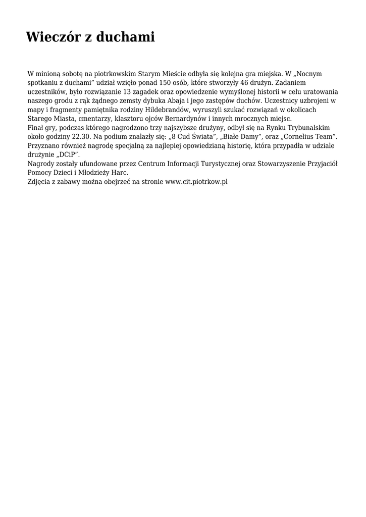 Wieczór z duchami W minioną sobotę na piotrkowskim Starym Mieście odbyła się kolejna gra miejska. W „Nocnym spotkaniu z duchami” udział wzięło ponad 150 osób, które stworzyły 46 drużyn. Zadaniem uczestników, było rozwiązanie 13 zagadek oraz opowiedzenie wymyślonej historii w celu uratowania naszego grodu z rąk żądnego zemsty dybuka Abaja i jego zastępów duchów. Uczestnicy uzbrojeni w mapy i fragmenty pamiętnika rodziny Hildebrandów, wyruszyli szukać rozwiązań w okolicach Starego Miasta, cmentarzy, klasztoru ojców Bernardynów i innych mrocznych miejsc. Finał gry, podczas którego nagrodzono trzy najszybsze drużyny, odbył się na Rynku Trybunalskim około godziny 22.30. Na podium znalazły się: „8 Cud Świata”, „Białe Damy”, oraz „Cornelius Team”. Przyznano również nagrodę specjalną za najlepiej opowiedzianą historię, która przypadła w udziale drużynie „DCiP”. Nagrody zostały ufundowane przez Centrum Informacji Turystycznej oraz Stowarzyszenie Przyjaciół Pomocy Dzieci i Młodzieży Harc. Zdjęcia z zabawy można obejrzeć na stronie www.cit.piotrkow.pl