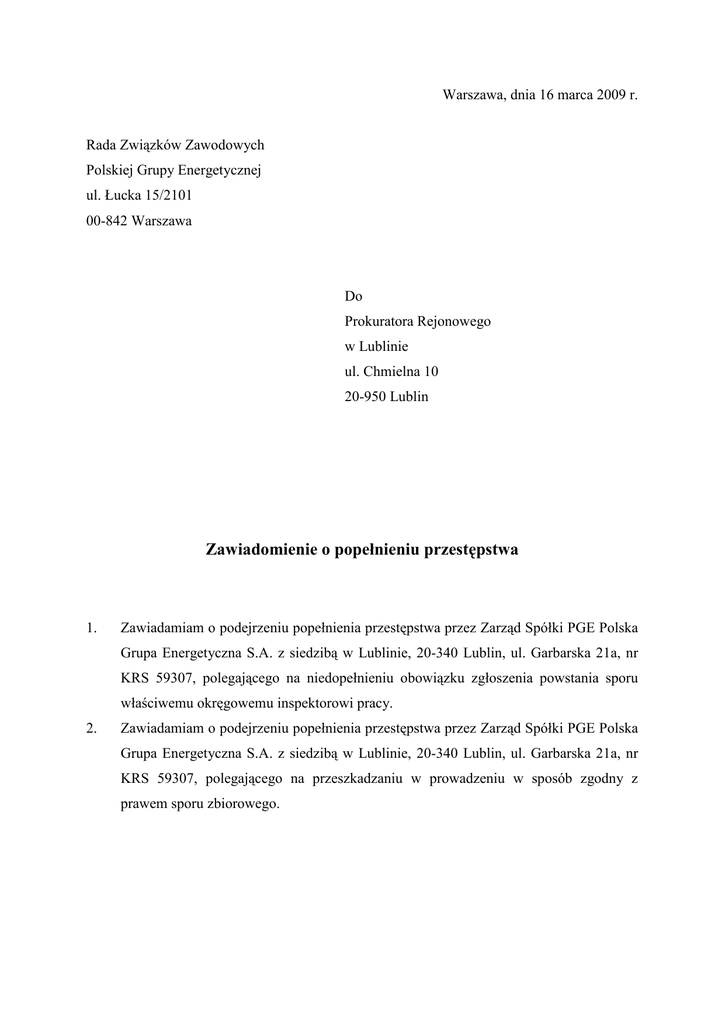 Warszawa, dnia 16 marca 2009 r. Rada Związków Zawodowych Polskiej Grupy Energetycznej ul. Łucka 15/2101 00-842 Warszawa Do Prokuratora Rejonowego w Lublinie ul. Chmielna 10 20-950 Lublin Zawiadomienie o popełnieniu przestępstwa 1. Zawiadamiam o podejrzeniu popełnienia przestępstwa przez Zarząd Spółki PGE Polska Grupa Energetyczna S.A. z siedzibą w Lublinie, 20-340 Lublin, ul. Garbarska 21a, nr KRS 59307, polegającego na niedopełnieniu obowiązku zgłoszenia powstania sporu właściwemu okręgowemu inspektorowi pracy. 2. Zawiadamiam o podejrzeniu popełnienia przestępstwa przez Zarząd Spółki PGE Polska Grupa Energetyczna S.A. z siedzibą w Lublinie, 20-340 Lublin, ul. Garbarska 21a, nr KRS 59307, polegającego na przeszkadzaniu w prowadzeniu w sposób zgodny z prawem sporu zbiorowego. Uzasadnienie AD 1 Rada Związków Zawodowych Polskiej Grupy Energetycznej jest organizacją na prawach związku zawodowego, działającą między innymi w Spółce PGE Polska Grupa Energetyczna S.A., uprawnioną do prowadzenia rozmów płacowych ze Spółką. Celem statutowym Rady jest bowiem: 1) reprezentowanie swoich członków w dialogu społecznym ze Spółką Polska Grupa Energetyczna S.A. z siedzibą w Lublinie, XI Wydział Gospodarczy Krajowego Rejestru Sądowego za numerem KRS 0000059307, (dalej jako PGE Polska Grupa Energetyczna S.A.), Spółką PGE Energia S.A. z siedzibą w Lublinie, zarejestrowaną przez Sąd Rejonowy w Lublinie, XI Wydział Gospodarczy Krajowego Rejestru Sądowego za numerem KRS 0000267235 (dalej jako PGE Energia S.A.) oraz Pracodawcami, 2) pozyskiwanie informacji, udzielanie opinii, prowadzenie konsultacji oraz dokonywanie uzgodnień z PGE Polska Grupa Energetyczna S.A. oraz PGE Energia S.A. na temat zamierzonych działań oraz posunięć w stosunku do przedsięwzięć prowadzonych przez spółki zaleŜne i powiązane z PGE Polska Grupa Energetyczna S.A. i PGE Energia S.A., 3) podejmowanie wszelkiej innej aktywności właściwej związkom zawodowym w relacjach z PGE Polska Grupa Energetyczna S.A. oraz PGE Energia S.A., 4) reprezentacja oraz koordynowanie działań członków Rady w stosunku do PGE Polska Grupa Energetyczna S.A. oraz PGE Energia S.A. Dnia 5 lutego 2009 r., Zarząd Spółki PGE Polska Grupa Energetyczna S.A. podjął decyzję o wstrzymaniu wzrostu wynagrodzeń w Grupie PGE Rada Związków Zawodowych Polskiej Grupy Energetycznej, uwaŜając, Ŝe kwestia wzrostu wynagrodzeń nie moŜe być rozstrzygana przez pracodawcę jednostronnie, bez konsultacji ze stroną społeczną, postanowiła podjąć ze Spółką rozmowy w sprawie wynagrodzeń i dnia 12 lutego 2009 r. wystąpiła w stosunku do władz Spółki PGE Polska Grupa Energetyczna S.A. z Ŝądaniem rozpoczęcia rozmów w sprawie określenia wskaźnika wzrostu wynagrodzeń w Grupie PGE na rok 2009. Prawo to przysługuje Radzie stosownie do art. 7 ust. 1 ustawy z dnia 23 maja 1991 r. o rozwiązywaniu sporów zbiorowych (Dz. U. z 1991 r. Nr 55, poz. 236, z późn. zm.). W związku z brakiem odpowiedzi ze strony Spółki kolejne pisma w tej sprawie wysłane zostały juŜ w trybie ustawy o rozwiązywaniu sporów zbiorowych ze sprecyzowaniem Ŝądania płacowego Na pisma z dnia 16 lutego 2009 r. i dnia 23 lutego 2009 r. Rada Związków Zawodowych nie otrzymała Ŝadnych odpowiedzi. Spółka nie zgłosiła równieŜ powstania sporu zbiorowego, co zostało potwierdzone w piśmie Okręgowego Inspektora Pracy w Lublinie z dnia 3 marca 2009 r. Art. 26 ustawy z dnia 23 maja 1991 r. o rozwiązywaniu sporów zbiorowych (Dz. U. z 1991 r. Nr 55, poz. 236, z późn. zm.) stanowi, Ŝe osoba, która w związku z zajmowanym stanowiskiem lub pełnioną funkcją, przeszkadza we wszczęciu lub w prowadzeniu w sposób zgodny z prawem sporu zbiorowego lub nie dopełnia obowiązków określonych w tej ustawie podlega grzywnie albo karze ograniczenia wolności. Zgodnie z art. 7 powołanej ustawy spór zbiorowy istnieje od dnia wystąpienia przez podmiot reprezentujący interesy pracownicze do pracodawcy z Ŝądaniami objętymi sporem (Ŝądaniami w sprawach wskazanych w art. 1 ustawy), jeŜeli pracodawca nie uwzględnił wszystkich Ŝądań w terminie określonym w wystąpieniu, nie krótszym niŜ 3 dni. Ustawodawca w art. 8 powołanej ustawy nakłada na pracodawcę obowiązek niezwłocznego podjęcia rokowań w celu rozwiązania sporu w drodze porozumienia oraz zgłoszenia sporu właściwemu okręgowemu inspektorowi pracy. Obowiązek ten w imieniu Spółki powinny spełnić osoby, które z racji zajmowanego stanowiska bądź powierzonych im zadań realizują faktycznie niektóre funkcje pracodawców w tym funkcje ustalania wynagrodzeń. Tymczasem Zarząd Spółki PGE Polska Grupa Energetyczna S.A. nie spełnił Ŝadnego z wymienionych obowiązków – nie podjął rokowań ze związkami zawodowymi ani nie zarejestrował sporu zbiorowego. W związku z powyŜszym stwierdzamy, iŜ Zarząd Spółki PGE Polska Grupa Energetyczna S.A., nie zgłaszając zaistnienia sporu zbiorowego do Okręgowego Inspektora Pracy, nie dopełnił obowiązku wynikającego z art. 8 ustawy z dnia 23 maja 1991 r. o rozwiązywaniu sporów zbiorowych (Dz. U. z 1991 r. Nr 55, poz. 236, z późn. zm.). AD 2 Rada skupia w swoich szeregach, a takŜe reprezentuje Międzyzakładowy Związek Zawodowy Pracowników Energetyki Zamojskiej .Związek ten reprezentuje pracowników Spółki Dystrybucja Zamość Sp. z o.o. w Zamościu oraz PGE Zamojska Korporacja Energetyczna SA i w związku z tym przysługuje mu m.in. prawo prowadzenia sporów zbiorowych z pracodawcą w zakresie określonym w art. 1 ustawy z dnia 23 maja 1991 r. o rozwiązywaniu sporów zbiorowych (Dz. U. z 1991 r. Nr 55, poz. 236, z późn. zm.) czyli w zakresie dotyczącym „warunków pracy, płac lub świadczeń socjalnych oraz praw i wolności związkowych pracowników lub innych grup, którym przysługuje prawo zrzeszania się w związkach zawodowych”. Prawo to zostało naruszone przez Zarz