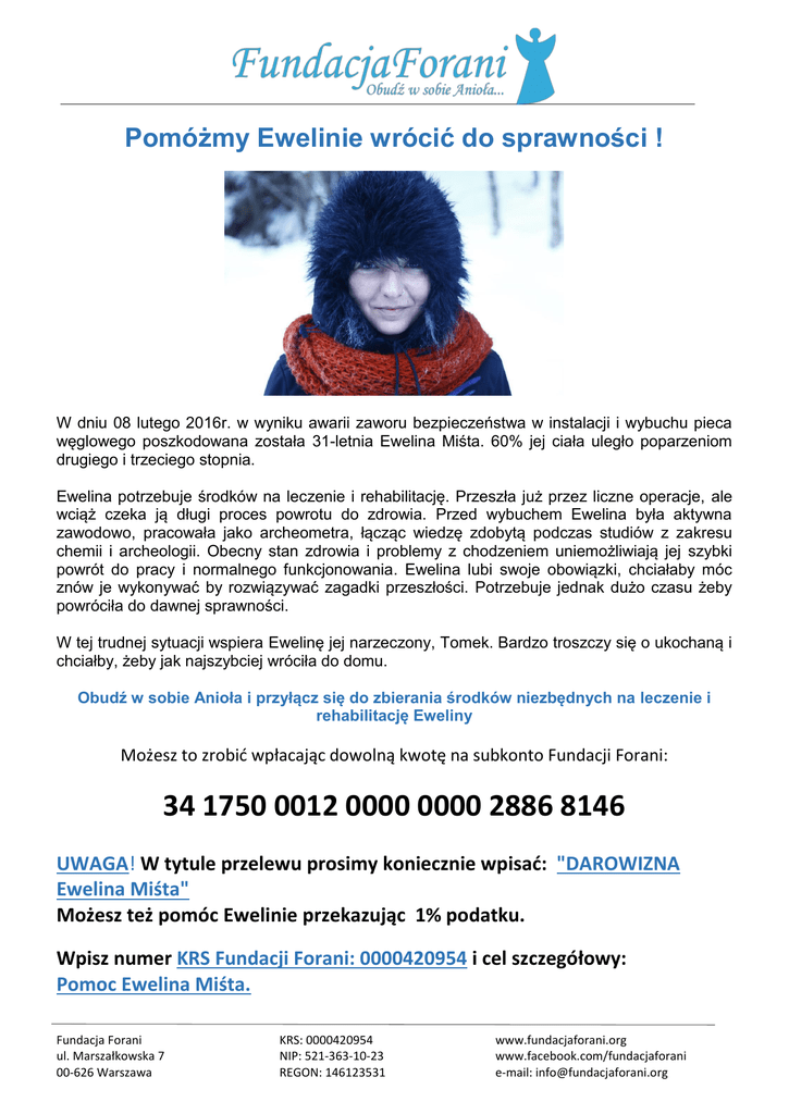 Pomóżmy Ewelinie wrócić do sprawności ! W dniu 08 lutego 2016r. w wyniku awarii zaworu bezpieczeństwa w instalacji i wybuchu pieca węglowego poszkodowana została 31-letnia Ewelina Miśta. 60% jej ciała uległo poparzeniom drugiego i trzeciego stopnia. Ewelina potrzebuje środków na leczenie i rehabilitację. Przeszła już przez liczne operacje, ale wciąż czeka ją długi proces powrotu do zdrowia. Przed wybuchem Ewelina była aktywna zawodowo, pracowała jako archeometra, łącząc wiedzę zdobytą podczas studiów z zakresu chemii i archeologii. Obecny stan zdrowia i problemy z chodzeniem uniemożliwiają jej szybki powrót do pracy i normalnego funkcjonowania. Ewelina lubi swoje obowiązki, chciałaby móc znów je wykonywać by rozwiązywać zagadki przeszłości. Potrzebuje jednak dużo czasu żeby powróciła do dawnej sprawności. W tej trudnej sytuacji wspiera Ewelinę jej narzeczony, Tomek. Bardzo troszczy się o ukochaną i chciałby, żeby jak najszybciej wróciła do domu. Obudź w sobie Anioła i przyłącz się do zbierania środków niezbędnych na leczenie i rehabilitację Eweliny Możesz to zrobić wpłacając dowolną kwotę na subkonto Fundacji Forani: 34 1750 0012 0000 0000 2886 8146 UWAGA! W tytule przelewu prosimy koniecznie wpisać: "DAROWIZNA Ewelina Miśta" Możesz też pomóc Ewelinie przekazując 1% podatku. Wpisz numer KRS Fundacji Forani: 0000420954 i cel szczegółowy: Pomoc Ewelina Miśta. Fundacja Forani ul. Marszałkowska 7 00-626 Warszawa KRS: 0000420954 NIP: 521-363-10-23 REGON: 146123531 www.fundacjaforani.org www.facebook.com/fundacjaforani e-mail: [email protected] Z całego serca dziękujemy Wszystkim Darczyńcom! Fundacja Forani ul. Marszałkowska 7 00-626 Warszawa KRS: 0000420954 NIP: 521-363-10-23 REGON: 146123531 www.fundacjaforani.org www.facebook.com/fundacjaforani e-mail: [email protected]
