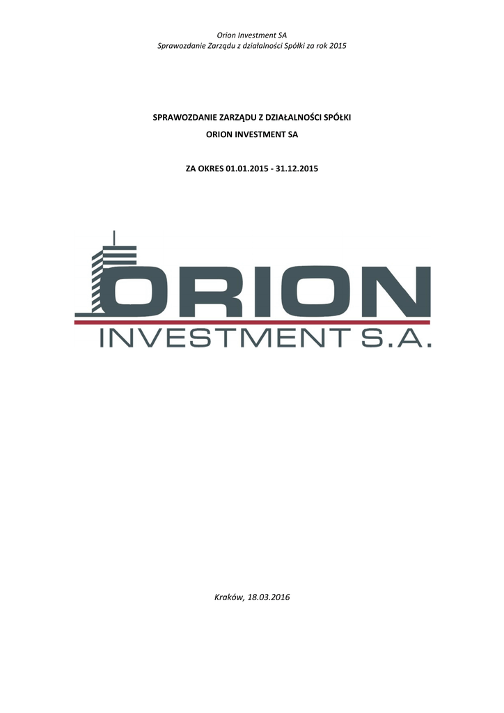 Orion Investment SA Sprawozdanie Zarządu z działalności Spółki za rok 2015 SPRAWOZDANIE ZARZĄDU Z DZIAŁALNOŚCI SPÓŁKI ORION INVESTMENT SA ZA OKRES 01.01.2015 - 31.12.2015 Kraków, 18.03.2016 Orion Investment SA Sprawozdanie Zarządu z działalności Spółki za rok 2015 1. ORION INVESTMENT SA Spółka została zawiązana w dniu 29 listopada 2007 roku w Kancelarii Notarialnej w Dąbrowie Górniczej przed notariuszem Witoldem Krawczykiem. Rejestracja spółki nastąpiła w dniu 10 stycznia 2008 roku. Na dzień bilansowy kapitał akcyjny Spółki wynosił 10 823 120 złotych i dzielił się na 1 082 312 akcje o wartości nominalnej 10 złotych. 2. Siedziba i podstawa działalności Siedziba spółki to ulica Przemysłowa 13, 30-701 Kraków. Spółce nadano numer identyfikacji podatkowej NIP: 644 336 77 54 oraz REGON 2400787244. Wśród podstawowych obszarów działalności Spółki wymienić można: - kupno i sprzedaż nieruchomości na własny rachunek, - wynajem i zarządzanie nieruchomościami własnymi lub dzierżawionymi, - realizacja projektów budowlanych związanych ze wznoszeniem budynków, - zarządzanie nieruchomościami wykonywane na zlecenie. Spółka specjalizuje się przede wszystkim w budownictwie mieszkaniowym wielorodzinnym i jednorodzinnym . Inwestycje realizowane są w wyselekcjonowanych lokalizacjach, które generują duży i stabilny popyt na produkt o wysokim potencjale rentowności i dużych walorach funkcjonalnych. Istotną cechą realizowanych projektów jest estetyka zagospodarowania terenów wspólnych. Lokalizacja każdej inwestycji spełnia również warunek dostępu do komunikacji miejskiej, jak też zaplecza edukacyjnego, medycznego, kulturalnego czy handlowo. Spółka specjalizuje się w realizacjach osiedli, których wielkość to kilkaset mieszkań w jednej lokalizacji. Są to mieszkania o metrażach od ok. 32 do ok. 60 mkw. Inwestycje realizowane są pod własnym nadzorem w trybie generalnego wykonawstwa przy udziale podmiotów zewnętrznych, co daje Spółce jako generalnemu wykonawcy pełną kontrolę nad procesem inwestycyjnym, gwarancję wysokiej jakości zastosowanych materiałów i właściwego ich wbudowania, zdolność do szybkiego reagowania na oczekiwane przez rynek zmiany produktu i pozwala racjonalnie ograniczyć koszty realizacji. 3. Kluczowe wydarzenia zakończonego roku obrotowego W roku 2015 udało się zakończyć realizację drugiego z projektów inwestycyjnych pod nazwą marketingową „Trzy Ogrody – Ogród Różany”. Terminowe zakończenie prac budowlanych umożliwiło uzyskanie decyzji pozwolenia na użytkowanie budynków w planowanym terminie. W dniu 28 Orion Investment SA Sprawozdanie Zarządu z działalności Spółki za rok 2015 października 2015 roku spółka zależna Orion Ogrody Sp. z o.o. otrzymała Decyzję Powiatowego Inspektora Nadzoru Budowlanego dopuszczającą budynki do użytkowania. Decyzja ta, uprawomocniła się w drugiej połowie listopada. Łącznie oddano do użytkowania 118 mieszkań w 23 budynkach. Niezwłocznie po uzyskaniu pozwolenia na użytkowanie spółka celowa rozpoczęła przenoszenie własności mieszkań na nowych właścicieli. Przeniesienie własności przełożyło się na księgowanie przychodów ze sprzedaży na zrealizowanej inwestycji oraz umożliwiło w roku 2015 osiągnięcie wysokiego zysku netto. Do końca 2015 roku Spółce Orion Ogrody Sp. z o.o. udało się przenieść 1 427 metry kwadratowe z 6 718 wybudowanych, co daje 21% zrealizowanej sprzedaży. Zarząd planuje, że sprzedaż pozostałej części inwestycji zostanie zakończona do jesieni 2016 roku. Tak wysoki poziom sprzedaży umożliwił częściową spłatę kredytu inwestycyjnego zaciągniętego na realizację przedmiotowej inwestycji. Zdaniem Zarządu, znacznie zmniejszyło to koszt zewnętrznego finansowania tej inwestycji i pozwoliło skoncentrować środki finansowe w nowe projekty inwestycyjne. Drugą zakończoną inwestycją w roku 2015 była inwestycja pod nazwą marketingową „Zabierzów Zacisze”. Inwestycja została oddana do użytkowania pod koniec 2015 roku, łącznie oddano 36 budynków w zabudowie szeregowej i bliźniaczej o powierzchni całkowitej od 94-137 mkw. Przedsprzedaż tej inwestycji znajdzie odzwierciedlenie w wynikach spółki w roku 2016 kiedy to dla tych budynków zostaną zawarte umowy przenoszące własność. W 2015 roku poprzez powołaną do tego celu spółkę celową Orion Ogrody 2 Sp. z o.o. rozpoczęty został III etap inwestycji w Opatkowicach pod nazwą marketingową „Trzy Ogrody – Ogród Jaśminowy”. Projekt ten zakłada budowę 212 mieszkań o powierzchni od 32 do 60 metrów. W połowie 2015 roku rozpoczęto prace dotyczące tej inwestycji i na dzień 31.12.2015 stopień zaawansowania prowadzonych prac ukształtował się na poziomie 17 %. Oddanie do użytkowania planowane jest na IV kwartał 2016 roku. W minionym roku prowadzona była również sprzedaż w spółkach celowych lokali i mieszkań z zakończonych w latach poprzednich inwestycji przy ulicy Przemysłowej w Krakowie oraz I etapu inwestycji w Opatkowicach „Trzy Ogrody – Ogród Wrzosowy” . Zarząd planuje zakończenie sprzedaży w obydwu inwestycjach do końca I półrocza 2016 roku. 4. Otoczenie rynkowe Konkurenci IV kwartał 2015 roku na rynku mieszkaniowym w Krakowie przyniósł wzrost sprzedaży nowych mieszkań niemal o 6%. Według danych statystycznych GUS w 2015 r. inwestorzy budujący na Orion Investment SA Sprawozdanie Zarządu z działalności Spółki za rok 2015 sprzedaż lub wynajem oddali do użytkowania w Krakowie 5595 mieszkań; co stanowiło 85,8% ogółu mieszkań oddanych do użytkowania. W porównaniu z rokiem poprzednim deweloperzy oddali do użytkowania o 11,2% mniej mieszkań. Bieżące wskaźniki dotyczące intensywności budów wskazują na dalsze ożywienie budownictwa. W 2015 r. deweloperzy rozpoczęli w minionym roku budowę 9 709 mieszkań, co w porównaniu z 2014 r. oznac