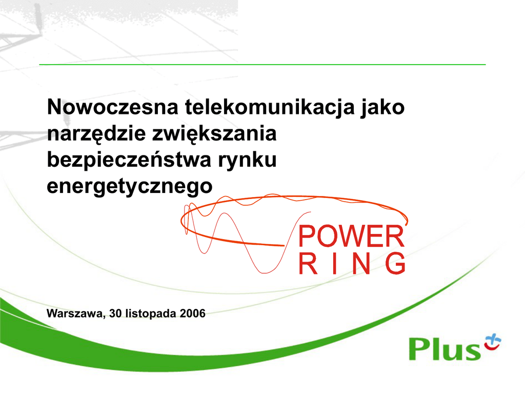 Nowoczesna telekomunikacja jako narzędzie zwiększania bezpieczeństwa rynku energetycznego Warszawa, 30 listopada 2006 Rola mobilnej telekomunikacji • Nowoczesny system wsparcia ruchomej komunikacji wewnętrznej • Wsparcie łączności w sytuacjach kryzysowych • Systemy telemetryczne jako element zarządzania rynkiem odbioru energii Komunikacja wewnętrzna • Sieć GSM/3G jako istotny element systemów łączności – Telefonia komórkowa stała się nieodłącznym systemem komunikacyjnym w każdym przedsiębiorstwie – Możliwość pełnej integracji mobilnych systemów łączności z zakładową łącznością stacjonarną • Telefonia Konwergentna – Tani i wydajny sposób na zapewnienie komunikacji, nawet w rejonach o słabo rozwiniętej infrastrukturze kablowej • Łączność dla oddziałów lub placówek z pełną funkcjonalnością sieci stacjonarnej – Łatwość zarządzania mobilną infrastrukturą telekomunikacyjną • Szybka konfiguracja i rekonfiguracja systemu mobilnej komunikacji wewnętrznej – Wykorzystanie alternatywnych kanałów komunikacyjnych • Wiadomości tekstowe SMS • Łączność rozsiewcza Komunikacja wewnętrzna • Coraz więcej pracowników posiada służbowy telefon komórkowy • Telefon komórkowy może stać się podstawowym narzędziem komunikacyjnym, bo: – Jest skuteczny (z reguły jest tam gdzie właściciel) – Łatwy w użyciu (różne modele telefonów) – Tani (Ryczałtowy System Plus) Komunikacja wewnętrzna • Telefonia komórkowa jako element całościowego systemu łączności – Telefonia Konwergentna • Tania łączność klasy DECT, bez ograniczeń Telefonia Konwergentna • Telefonia Konwergentna to zintegrowany pakiet usług: – Klasycznej telefonii stacjonarnej – Nowoczesnej telefonii mobilnej – Konwergentnych usług dodanych Połączenia lokalne Połączenia międzystrefowe Połączenia międzynarodowe Połączenia komórkowe Telefonia Konwergentna • Integracja z usługą System Plus (VPN): – Jednolity system dla łączności stacjonarnej i mobilnej Pracownik mobilny Pracownik mobilny Pracownik W Centrali Pracownik W Oddziale Pracownik mobilny Telefonia Konwergentna • Prywatny Plan Numeracyjny – Wspólna skrócona numeracja – Jednolity, intuicyjny plan numeracyjny – wybieranie długich i krótkich numerów 601 xx xx xx xxxx 601 yy yy yy yyyy 0 22 vv vv vv vvvv 0 32 zz zz zz zzzz 601 uu uu uu uuuu Zintegrowana łączność RUCH MIĘDZYNARODOWY +48 601 vv vv vv RUCH MIĘDZYSTREFOWY RUCH KOMÓRKOWY +48 22 xxx xx xx +48 601 xx xx xx RUCH LOKALNY +48 22 zzz zz zz +48 601 zz zz zz +48 22 yyy yy yy +48 601 yy yy yy SYSTEM PLUS SUPERSTREFA - połączenia wewnętrzne Dedykowane usługi telekomunikacyjne • Zintegrowana telefonia dla sektora energetycznego Łączność radiotelefoniczna - PUSH-TO-TALK Dedykowane usługi telekomunikacyjne • System zarządzania w sytuacjach kryzysowych --- ZE --Alarm nr 12 10.04.2006 Instrukcje --- ZE --Alarm nr 12 10.04.2006 Instrukcje System powiadamiania SMS-C --- ZE --Alarm nr 12 10.04.2006 Instrukcje Komunikacja w sytuacjach kryzysowych • System komunikacyjny oparty o kilka platform transmisyjnych • Niezależne kanały komunikacji Telemetria • Łatwy sposób opomiarowania dużej liczby odbiorców • Rozwiązanie najszybsze do wdrożenia • Bardzo niskie koszty infrastruktury • Pełny zasięg • Niskie koszty wdrożenia • Element przewagi na rynku – Możliwość „sterowania” odbiorem Dziękuję za uwagę Janusz Orłowski Kierownik Sprzedaży Sektor Energia-Paliwa Tel: (0-22) 426-83-12 GSM: 601 135 110 Fax: 601 224 871 [email protected]