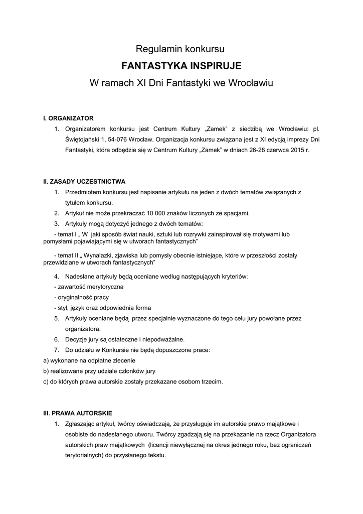 Regulamin konkursu FANTASTYKA INSPIRUJE W ramach XI Dni Fantastyki we Wrocławiu I. ORGANIZATOR 1. Organizatorem konkursu jest Centrum Kultury „Zamek” z siedzibą we Wrocławiu: pl. Świętojański 1, 54-076 Wrocław. Organizacja konkursu związana jest z XI edycją imprezy Dni Fantastyki, która odbędzie się w Centrum Kultury „Zamek” w dniach 26-28 czerwca 2015 r. II. ZASADY UCZESTNICTWA 1. Przedmiotem konkursu jest napisanie artykułu na jeden z dwóch tematów związanych z tytułem konkursu. 2. Artykuł nie może przekraczać 10 000 znaków liczonych ze spacjami. 3. Artykuły mogą dotyczyć jednego z dwóch tematów: - temat I „ W jaki sposób świat nauki, sztuki lub rozrywki zainspirował się motywami lub pomysłami pojawiającymi się w utworach fantastycznych” - temat II „ Wynalazki, zjawiska lub pomysły obecnie istniejące, które w przeszłości zostały przewidziane w utworach fantastycznych” 4. Nadesłane artykuły będą oceniane według następujących kryteriów: - zawartość merytoryczna - oryginalność pracy - styl, język oraz odpowiednia forma 5. Artykuły oceniane będą przez specjalnie wyznaczone do tego celu jury powołane przez organizatora. 6. Decyzje jury są ostateczne i niepodważalne. 7. Do udziału w Konkursie nie będą dopuszczone prace: a) wykonane na odpłatne zlecenie b) realizowane przy udziale członków jury c) do których prawa autorskie zostały przekazane osobom trzecim. III. PRAWA AUTORSKIE 1. Zgłaszając artykuł, twórcy oświadczają, że przysługuje im autorskie prawo majątkowe i osobiste do nadesłanego utworu. Twórcy zgadzają się na przekazanie na rzecz Organizatora autorskich praw majątkowych (licencji niewyłącznej na okres jednego roku, bez ograniczeń terytorialnych) do przysłanego tekstu. 2. Twórcy zgadzają się na publikowanie artykułów przez organizatorów Konkursu na wszelkich polach eksploatacji. 3. Twórcy oświadczają, że nie będą rościć praw do wynagrodzenia z tytułu wykorzystania nadesłanych przez nich artykułów na wszelkich polach eksploatacji, co oznacza zgodę na jego publikację w informatorze imprezy, na stronie Organizatora, Dni Fantastyki we Wrocławiu, materiałach promocyjnych imprezy oraz w wydawnictwie pokonkursowym. IV. ZGŁOSZENIA 1. Prace konkursowe należy nadsyłać jednocześnie na adres mailowy [email protected] wyłącznie jako załącznik w formacie .rtf. Sugerujemy wysłanie e-maili ze zgłoszeniem do konkursu z opcja "potwierdzenie odbioru" 2. W treści maila należy podać dokładne dane osobowe oraz telefon kontaktowy. 3. Wysyłając pracę należy zarazem zaznaczyć wybrany temat 4. Jedna osoba może nadesłać na konkurs jeden artykuł 5. Prace nie spełniające powyższych wymagań nie będą brane pod uwagę. 6. Ostateczny termin zgłoszeń mija 28 lutego 2015 roku. IV. NAGRODY 1. Dla autora najlepszej pracy przewidziano Nagrodę Główną w postaci nagrody pieniężnej w wysokości 250 zł oraz darmowej akredytacji na XI Dni Fantastyki. 2. W zależności od poziomu i atrakcyjności prac, jury może przyznać wyróżnienia. 3. Organizatorzy zastrzegają sobie prawo innego podziału nagród 4. Ogłoszenie wyników konkursu nastąpi na stronie internetowej www.dnifantastyki.pl w dniu 15 marca 2015 r. 5. Laureaci zostaną powiadomieni o wyniku konkursu mailowo. 6. Wręczenie nagród nastąpi podczas imprezy. Udział w konkursie i przesłanie swoich danych osobowych jest jednocześnie wyrażeniem zgody na ich gromadzenie i przetwarzanie przez organizatorów w celach statystycznych i konkursowych, z zastrzeżeniem prawa do ich poprawiania i uzupełniania zgodnie z Ustawą o ochronie danych osobowych z dn. 29.08.1997 r.