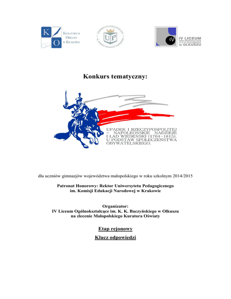 Konkurs tematyczny: dla uczniów gimnazjów województwa małopolskiego w roku szkolnym 2014/2015 Patronat Honorowy: Rektor Uniwersytetu Pedagogicznego im. Komisji Edukacji Narodowej w Krakowie Organizator: IV Liceum Ogólnokształcące im. K. K. Baczyńskiego w Olkuszu na zlecenie Małopolskiego Kuratora Oświaty Etap rejonowy Klucz odpowiedzi Konkurs tematyczny: Upadek I Rzeczypospolitej. Napoleońskie nadzieje i ład wiedeński (1764-1815). U podstaw społeczeństwa obywatelskiego I. Wskaż jedną prawidłową odpowiedź na poniższe pytania. 1. W 1763 roku stronnictwo polityczne Familia prowadziło politykę zagraniczną: a. prorosyjską b. proaustriacką c. propruską 2. Szkoła Rycerska została założona w: a. 1765 roku b. 1773 roku c. 1788 roku 3. Kopalnie soli w Bochni i Wieliczce zostały włączone do zaboru austriackiego w: a. 1768 roku (0-15 pkt.) b. 1772 roku c. 1795 roku 4. Ostatnim Naczelnikiem Powstania Kościuszkowskiego był: a. Jakub Jasiński b. Tomasz Wawrzecki c. Jan Kiliński 5. W bitwie pod Szczekocinami Tadeusz Kościuszko walczył z połączonymi wojskami: a. rosyjsko-austriackimi b. rosyjsko-pruskimi c. prusko-austriackimi 6. Prawo o miastach królewskich sejm przyjął w: a. kwietniu 1790 roku b. kwietniu 1791 roku c. kwietniu 1792 roku 7. Grzegorz Piramowicz był: a. Sekretarzem w Szkole Rycerskiej b. Sekretarzem Komisji Edukacji Narodowej c. Sekretarzem Towarzystwa do Ksiąg Elementarnych Konkurs tematyczny: Upadek I Rzeczypospolitej. Napoleońskie nadzieje i ład wiedeński (1764-1815). U podstaw społeczeństwa obywatelskiego 8. Założycielem i wieloletnim dyrektorem Teatru Narodowego był: a. Adam Naruszewicz b. Wojciech Bogusławski c. Julian Ursyn Niemcewicz 9. Napoleon Bonaparte został pierwszym konsulem w: a. 1799 roku b. 1800 roku c. 1801 roku 10. Na czele Legii Naddunajskiej stał: a. gen. Karol Kniaziewicz b. gen. Jan Henryk Dąbrowski c. gen. Jan Kozietulski 11. IV koalicja antyfrancuska powstała w: a. w lecie 1805 roku b. w lecie 1806 roku c. w lecie 1809 roku 12. „Drugą wojnę polską” Napoleon rozpoczął z: a. Prusami b. Austrią c. Rosją 13. Księstwo Warszawskie powiększono o cztery nowe departamenty na mocy traktatu w: a. Schonbrunn b. Tylży c. Preszburgu 14. W bitwie pod Waterloo Napoleon został pokonany przez wojska: a. rosyjsko-pruskie b. angielsko-pruskie c. austriacko-pruskie 15. Prusy w czasie obrad kongresu wiedeńskiego reprezentował: a. Fryderyk II b. Wilhelm II c. Fryderyk Wilhelm III Konkurs tematyczny: Upadek I Rzeczypospolitej. Napoleońskie nadzieje i ład wiedeński (1764-1815). U podstaw społeczeństwa obywatelskiego II. Ułóż w kolejności chronologicznej podane poniżej wydarzenia, rozpoczynając od wydarzenia najwcześniejszego. Wpisz je do tabeli. (0-3 pkt.) a. konsulat b. monarchia c. dyrektoriat d. cesarstwo e. republika 1 b 2 e 3 c 4 a 5 d a. bitwa pod Austerlitz b. bitwa pod Hohenlinden c. bitwa pod Borodino d. bitwa pod Frydlandem e. bitwa pod Wagram 1 b 2 a 3 d 4 e 5 c 3 e 4 d 5 b a. Czarna procesja w Warszawie b. bitwa pod Racławicami c. konfederacja barska d. II rozbiór Polski e. bitwa pod Zieleńcami 1 c 2 a Konkurs tematyczny: Upadek I Rzeczypospolitej. Napoleońskie nadzieje i ład wiedeński (1764-1815). U podstaw społeczeństwa obywatelskiego III. Uzupełnij tabelę, wpisując po 3 państwa, w odniesieniu do których uczestnicy kongresu wiedeńskiego zastosowali zasadę legitymizmu i równowagi europejskiej. (0-10 pkt.) Kongres Wiedeński 1815 rok Legitymizm 1. 2. 3. 4. 5. Francja Królestwo Obojga Sycylii Państwo Kościelne Piemont (Królestwo Sardynii) Hiszpania Zasada równowagi europejskiej 1. Francja 2. Niemcy 3. Włochy 4. Polska 5. Królestwo Niderlandów (0-6 pkt.) 1. Zasada legitymizmu (0-2 pkt.) nienaruszalność praw dynastii panujących do tronu, gdyż władza królewska pochodzi od Boga, a nie od ludu. 2. Zasada równowagi europejskiej (0-2 pkt.) żadne państwo europejskie nie może dominować nad innymi i nie ma możliwości podporządkowania sobie państw słabszych. Uwaga! Dopuszcza się uwzględnienie przez Komisję Konkursową innych poprawnych odpowiedzi uczniów. IV. Jakiego wydarzenia dotyczą poniższe nagłówki prasowe: (0-1 pkt.) Dotyczą tzw. „Stu dni napoleona” – marszu Napoleona na Paryż po jego ucieczce z Elby. Konkurs tematyczny: Upadek I Rzeczypospolitej. Napoleońskie nadzieje i ład wiedeński (1764-1815). U podstaw społeczeństwa obywatelskiego Spośród przytoczonych poniżej postanowień wskaż te, które zostały wprowadzone w V. czasie obrad Sejmu Wielkiego (wpisując słowo TAK). Lp. 1 2 3 4 5 6 7 8 (0-4 pkt.) wydarzenie Odpowiedź punkty Wprowadzenie tzw. praw kardynalnych nie 0 Ustawa o sejmikach pozbawiająca szlachtę gołotę udziału 1 pkt. TAK w sejmikach ziemskich Opodatkowanie duchowieństwa w wysokości 20 % 1 pkt. TAK Podpisanie przymierza politycznego z Austrią nie 0 Powołanie Rady Nieustającej nie 0 Uchwała o zwiększeniu liczebności wojska do 100 tys. 1 pkt. TAK Prawo o miastach królewskich 1 pkt. TAK Zapewnienie elekcyjności tronu nie 0 Uwaga! Dopuszcza się zaznaczenie przez uczniów prawidłowej odpowiedzi w inny sposób (np. x). Przeczytaj podany niżej tekst źródłowy i wykonaj polecenia A, B, C. VI. (0-7 pkt.) A. Księstwo Warszawskie (0-1 pkt.) B. 1807 r., Tylża (0-2 pkt.) C. cesarz Francuzów Napoleon Bonaparte, car Rosji Aleksander I Romanow (0-2 pkt.) D. rozbiory Polski (0-2 pkt.) VII. Wyjaśnij podane niżej pojęcia historyczne. (0-14pkt.) Proponowane odpowiedzi: 1. Prawa kardynalne - Prawa uchwalone przez sejm delegacyjny (repninowski) w 1768 r., potwierdzały nienaruszalność ustroju politycznego Rzeczypospolitej, liberum veto, wolną elekcję, prawo wypowiadania posłuszeństwa królowi i inne które miały nie dopuścić do postępowych reform kraju. 2. Monarchia konstytucyjna – forma ustroju, w którym król sprawuje władzę zgodnie z uchwalona konstytucją, np. Rzeczpospolita po uchwaleniu Kons