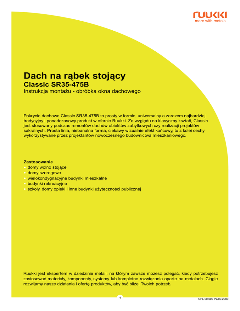 Dach na ràbek stojàcy Classic SR35-475B Instrukcja monta˝u - obróbka okna dachowego Pokrycie dachowe Classic SR35-475B to prosty w formie, uniwersalny a zarazem najbardziej tradycyjny i ponadczasowy produkt w ofercie Ruukki. Ze wzgl´du na klasyczny kształt, Classic jest stosowany podczas remontów dachów obiektów zabytkowych czy realizacji projektów sakralnych. Prosta linia, niebanalna forma, ciekawy wizualnie efekt koƒcowy, to z kolei cechy wykorzystywane przez projektantów nowoczesnego budownictwa mieszkaniowego. Zastosowanie • domy wolno stojàce • domy szeregowe • wielokondygnacyjne budynki mieszkalne • budynki rekreacyjne • szkoły, domy opieki i inne budynki u˝ytecznoÊci publicznej Ruukki jest ekspertem w dziedzinie metali, na którym zawsze mo˝esz polegaç, kiedy potrzebujesz zastosowaç materia∏y, komponenty, systemy lub kompletne rozwiàzania oparte na metalach. Ciàgle rozwijamy nasze dzia∏ania i ofert´ produktów, aby byç bli˝ej Twoich potrzeb. 1 CPL 00.000 PL/09.2009 Instrukcja monta˝u • Classic • Obróbka okna Zamocuj arkusze Classica do miejsca, gdzie przewidywane jest okno dachowe. Zaplanuj miejsce zamontowania okna tak, aby odległoÊci od obydwu boków okna do najbli˝szego ràbka były podobne. Zamontuj oÊcie˝nic´ okna w najwy˝szym poło˝eniu (tak by jak najwi´cej wystawała ponad łaty). Zabezpiecz oÊcie˝nic´ przed działaniem skroplin przy pomocy membrany lub kołnierza paroprzepuszczalnego oferowanego przez producenta okna. Je˝eli zaistnieje taka koniecznoÊç, nabij dodatkowe łaty. Zamocuj arkusze Classic poni˝ej okna tak, aby si´gały ok. 1 cm od dolnej kraw´dzi okna. Przygotuj ràbki po bokach okna do połàczenia poprzecznego wg zaleceƒ na str. 17 w Instrukcji monta˝u. 2 Instrukcja monta˝u • Classic • Obróbka okna UWAGA! Ze wzgl´du na brak w ofercie producentów okien kołnierzy do pokrycia Classic nale˝y wykonaç obróbki na placu budowy. Zamocuj po bokach arkusze o długoÊci = wysokoÊç okna + 2 x długoÊç zakładu według zaleceƒ na str. 17 w Instrukcji monta˝u. Arkusze zagnij tak, aby si´gały górnej kraw´dzi oÊcie˝nicy okna. Ràbki na górze arkusza nale˝y przygotowaç do połàczenia poprzecznego według zaleceƒ na str. 17 w Instrukcji monta˝u. Poni˝ej okna zamocuj listwy podgàsiorowe, a do nich obróbk´ si´gajàcà do górnej kraw´dzi okna. Obróbk´ połàcz na ràbek z obróbkami bocznymi. Nad oknem zamocuj obróbk´ blacharskà si´gajàcà ràbków arkuszy po bokach okna (odgi´ta, by połàczyç z ràbkami). Obróbka powinna si´gaç górnej kraw´dzi oÊcie˝nicy okna. Jej szerokoÊç powinna zapewniç mo˝liwoÊç połàczenia na zakład z arkuszami Classica o długoÊci według zaleceƒ na str. 17 w Instrukcji monta˝u. 3 Instrukcja monta˝u • Classic • Obróbka okna Zamocuj arkusze Classica nad oknem. Zamocuj obróbki maskujàce dostarczone wraz z oknem tak, aby zakrywały obróbki wykonane na budowie. Wykonaj i zamontuj maskownic´ łàczàcà tylnià obróbk´ blacharskà z obróbkà maskujàcà okna. Zamocuj skrzydło okienne. Kontynuuj układanie arkuszy Classica. l Nasi doradcy handlowi z przyjemnoÊcià udzielà Paƒstwu dodatkowych informacji. Szczecin Wrocław Łódê Gdaƒsk Poznaƒ Rzeszów Białystok Warszawa Olsztyn Kielce Kraków tel. +48 502 190 873 tel. +48 504 075 448 tel. +48 502 190 869 tel. +48 504 075 452 tel. +48 502 190 872 tel. +48 502 190 908 tel. +48 504 075 451 tel. +48 516 149 490 tel. +48 504 075 449 tel. +48 502 190 870 tel. +48 502 190 889 Dział Obsługi Klienta tel. +48 46 858 16 00, fax +48 46 858 18 09 Ruukki Polska Sp. z o.o., Jaktorowska 13, 96-300 ˚yrardów, www.ruukki.com/pl W zwiàzku z prowadzonymi pracami badawczymi i rozwojem proponowanego systemu, Ruukki Polska Sp. z o.o. zastrzega sobie prawo do zmian lub poprawek treÊci zawartej w powy˝szym opracowaniu bez wczeÊniejszego uprzedzenia. Niniejsze opracowanie nie stanowi oferty w rozumieniu prawnym. Copyright © 2009 Rautaruukki Corporation. Wszelkie prawa zastrze˝one. Ruukki, More With Metals sà markami Rautaruukki Corporation. Rautaruukki jest zarejestrowanà nazwà Rautaruukki Corporation. Classic jest zarejestrowanà nazwà Rautaruukki Corporation. 4