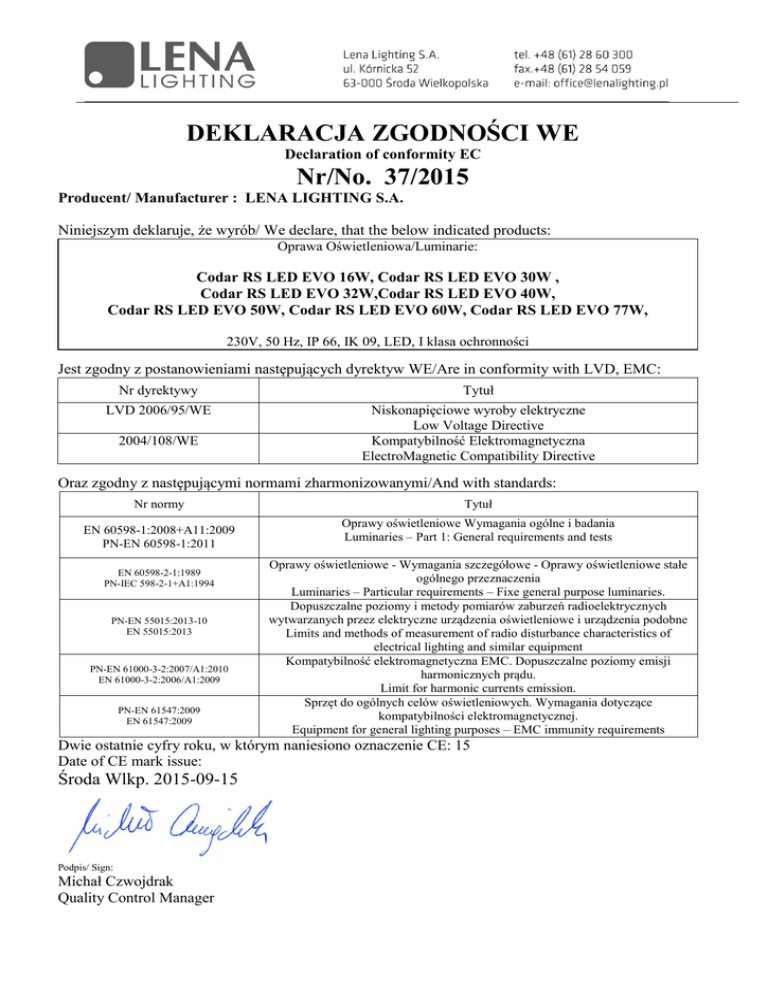 DEKLARACJA ZGODNOŚCI WE Declaration of conformity EC Nr/No. 37/2015 Producent/ Manufacturer : LENA LIGHTING S.A. Niniejszym deklaruje, że wyrób/ We declare, that the below indicated products: Oprawa Oświetleniowa/Luminarie: Codar RS LED EVO 16W, Codar RS LED EVO 30W , Codar RS LED EVO 32W,Codar RS LED EVO 40W, Codar RS LED EVO 50W, Codar RS LED EVO 60W, Codar RS LED EVO 77W, 230V, 50 Hz, IP 66, IK 09, LED, I klasa ochronności Jest zgodny z postanowieniami następujących dyrektyw WE/Are in conformity with LVD, EMC: Nr dyrektywy Tytuł LVD 2006/95/WE Niskonapięciowe wyroby elektryczne Low Voltage Directive Kompatybilność Elektromagnetyczna ElectroMagnetic Compatibility Directive 2004/108/WE Oraz zgodny z następującymi normami zharmonizowanymi/And with standards: Nr normy EN 60598-1:2008+A11:2009 PN-EN 60598-1:2011 EN 60598-2-1:1989 PN-IEC 598-2-1+A1:1994 PN-EN 55015:2013-10 EN 55015:2013 PN-EN 61000-3-2:2007/A1:2010 EN 61000-3-2:2006/A1:2009 PN-EN 61547:2009 EN 61547:2009 Tytuł Oprawy oświetleniowe Wymagania ogólne i badania Luminaries – Part 1: General requirements and tests Oprawy oświetleniowe - Wymagania szczegółowe - Oprawy oświetleniowe stałe ogólnego przeznaczenia Luminaries – Particular requirements – Fixe general purpose luminaries. Dopuszczalne poziomy i metody pomiarów zaburzeń radioelektrycznych wytwarzanych przez elektryczne urządzenia oświetleniowe i urządzenia podobne Limits and methods of measurement of radio disturbance characteristics of electrical lighting and similar equipment Kompatybilność elektromagnetyczna EMC. Dopuszczalne poziomy emisji harmonicznych prądu. Limit for harmonic currents emission. Sprzęt do ogólnych celów oświetleniowych. Wymagania dotyczące kompatybilności elektromagnetycznej. Equipment for general lighting purposes – EMC immunity requirements Dwie ostatnie cyfry roku, w którym naniesiono oznaczenie CE: 15 Date of CE mark issue: Środa Wlkp. 2015-09-15 Podpis/ Sign: Michał Czwojdrak Quality Control Manager DEKLARACJA ZGODNOŚCI WE Declaration of conformity EC Nr/No. 67/2015 Producent/ Manufacturer : LENA LIGHTING S.A. Niniejszym deklaruje, że wyrób/ We declare, that the below indicated products: Oprawa Oświetleniowa/Luminarie: Codar RS LED EVO INDIRECT 32W, 230V, 50 Hz, IP 66, IK 09, LED, I klasa ochronności Jest zgodny z postanowieniami następujących dyrektyw WE/Are in conformity with LVD, EMC: Nr dyrektywy Tytuł LVD 2006/95/WE Niskonapięciowe wyroby elektryczne Low Voltage Directive Kompatybilność Elektromagnetyczna ElectroMagnetic Compatibility Directive 2004/108/WE Oraz zgodny z następującymi normami zharmonizowanymi/And with standards: Nr normy EN 60598-1:2008+A11:2009 PN-EN 60598-1:2011 EN 60598-2-1:1989 PN-IEC 598-2-1+A1:1994 PN-EN 55015:2013-10 EN 55015:2013 PN-EN 61000-3-2:2007/A1:2010 EN 61000-3-2:2006/A1:2009 PN-EN 61547:2009 EN 61547:2009 Tytuł Oprawy oświetleniowe Wymagania ogólne i badania Luminaries – Part 1: General requirements and tests Oprawy oświetleniowe - Wymagania szczegółowe - Oprawy oświetleniowe stałe ogólnego przeznaczenia Luminaries – Particular requirements – Fixe general purpose luminaries. Dopuszczalne poziomy i metody pomiarów zaburzeń radioelektrycznych wytwarzanych przez elektryczne urządzenia oświetleniowe i urządzenia podobne Limits and methods of measurement of radio disturbance characteristics of electrical lighting and similar equipment Kompatybilność elektromagnetyczna EMC. Dopuszczalne poziomy emisji harmonicznych prądu. Limit for harmonic currents emission. Sprzęt do ogólnych celów oświetleniowych. Wymagania dotyczące kompatybilności elektromagnetycznej. Equipment for general lighting purposes – EMC immunity requirements Dwie ostatnie cyfry roku, w którym naniesiono oznaczenie CE: 15 Date of CE mark issue: Środa Wlkp. 2015-09-15 Podpis/ Sign: Michał Czwojdrak Quality Control Manager