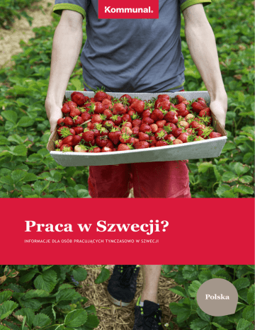 Praca w Szwecji? INFORMACJE DLA OSÓB PRACUJĄCYCH TYMCZASOWO W SZWECJI Polska Informacje dla osób pracujących tymczasowo w Szwecji Mamy nadzieję, że praca będzie Ci odpowiadać i że okres Twojego zatrudnienia w Szwecji będzie dla Ciebie satysfakcjonujący. Folder ten informuje o pewnych istotnych zasadach, które dotyczą osób pracujących w objętych umowami zbiorowymi gospodarstwach rolnych, sadach itp. na terenie Szwecji. Kommunal jest największym związkiem zawodowym w Szwecji, skupiającym ponad 500.000 członków. Kommunal to związek zawodowy dla pracowników gospodarstw rolnych i sadów. Negocjujemy z pracodawcami wysokość wynagrodzeń oraz inne warunki zatrudnienia. Pracujemy w gminach i samo rządach wojewódzkich, kościołach, spółdzielniach, przedsiębiorstwach prywatnych i gminnych, a także w dziedzinie gospodarowania zasobami środowiska przyrodniczego. Członkowie Kommunal opiekują się starszymi, przygotowują szkolne obiady i zajmują się dziećmi w przedszkolu. Prowadzimy autobusy, gasimy pożary, czyścimy kominy i prowadzimy karetki pogotowia. Osoby, które zajmują się zwierzętami w zoo, dbają o trawę na polach golfowych, prowadzą kombajny po polach, również należą do Kommunal. między godziną 7 a 17, od poniedziałku do piątku. W przypadku opieki nad zwierzętami mogą obowiązywać inne godziny. Cały czas przekraczający zwykły czas pracy powinien być liczony jako nadgodziny. Za ten czas przysługuje dodatkowe wynagrodzenie. Zgodnie z umową podpisaną przez Kommunal, masz prawo przepracować do 70 nadgodzin miesięcznie. Jeżeli w miejscu zatrudnienia nie ma umowy, maksymalna liczba nadgodzin dopuszczalna zgodnie z obowiązującymi przepisami wynosi 50 godzin. Dobrze, jeżeli po każdym dniu pracy zanotujesz liczbę przepracowanych godzin. Informacje te są niezbędne do tego, abyśmy byli w stanie udzielić Ci pomocy w przypadku ewentualnego sporu dotyczącego wynagrodzenia. Każdego dnia zapisuj, o której godzinie rozpoczynasz i kończysz pracę oraz jak długie robisz sobie przerwy w pracy. Jakie będzie Twoje wynagrodzenie? Świadectwo zatrudnienia Czym jest Kommunal? Najniższe wynagrodzenie w rolnictwie w roku 2016 podano w tabeli (oczywiście dozwolone jest ustalenie wyższego wynagrodzenia). Jeżeli pracujesz w nadgodzinach, stawka godzinowa jest wyższa. Pracodawca jest również zobowiązany do wypłaty 13% wynagrodzenia urlopowego od całego Twojego wynagrodzenia (włącznie z wynagrodzeniem za nadgodziny). Wynagrodzenie urlopowe powinno być wypłacone najpóźniej w momencie, w którym kończy się Twoje zatrudnienie. Pracodawca jest zobowiązany odliczyć i zapłacić podatek od Twojego wynagrodzenia (jeżeli pracujesz w Szwecji krócej niż 6 miesięcy, podatek wynosi 25%). Jak długi jest czas pracy? Zwykły czas pracy wynosi 40 godzin tygodniowo. Normalnie pracuje się 8 godzin dziennie, Zgodnie z obowiązującymi przepisami pracodawca powinien wystawić Ci pisemne świadectwo zatrudnienia, jeżeli masz pracować przez co najmniej miesiąc. Świadectwo zatrudnienia powinno zawierać między innymi następujące informacje: • Nazwisko pracodawcy • Twoje nazwisko • Miejsce zatrudnienia i zakres Twoich obowiązków (lub stanowisko) • Forma zatrudnienia. W przypadku pracy tymczasowej powinien być podany ostatni dzień zatrudnienia • Wynagrodzenie i inne świadczenia – oraz jak często ma być wypłacane wynagrodzenie • Czas pracy • Płatny urlop • Jaka umowa zbiorowa obowiązuje dla Twojej pracy Warunki pracy Dlaczego korzystasz na istnieniu umowy? Masz prawo do bezpiecznych warunków pracy. Część odpowiedzialności spoczywa na Tobie samym: musisz przestrzegać obowiązujących zasad mających zapobiegać wypadkom i chorobom. W Twoim miejscu pracy powinny się również znajdować środki ochrony osobistej, niezbędne na przykład podczas pracy przy zwierzętach, w hałasie lub przy opryskach. Kommunal posiada społecznego inspektora pracy, który sprawuje nadzór nad zapewnieniem odpowiednich warunków pracy. Z pracującym na rzecz związku regionalnym społecznym inspektorem pracy możesz się skontaktować za pośrednictwem Kommunal. Dane kontaktowe znajdują się na ostatniej stronie folderu. Umowy zbiorowe zawierane przez Kommunal stanowią dla Ciebie gwarancję tego, co obiecał Ci pracodawca: wynagrodzenia podstawowego, za nadgodziny, urlopowego itd. Pamiętaj: jeżeli w Twoim miejscu pracy nie ma umowy, pracodawca niczego nie przyrzekł! Umowy zawierane przez Kommunal zapewniają również różne ubezpieczenia, które obowiązują w przypadku, gdyby coś Ci się stało w pracy. Najważniejsze jest ubezpieczenie TFA obowiązujące w razie wypadków przy pracy. Jeżeli pracodawcą jest agencja zatrudnienia, obowiązuje tak zwana umowa o zatrudnieniu przez pośrednika. W przypadku choroby Jeżeli zachorujesz, pracodawca jest zobowiązany wypłacać Ci od drugiego dnia choroby wynagrodzenie chorobowe. Wynagrodzenie chorobowe wynosi 80% zwykłego wynagrodzenia. Za pierwszy dzień choroby nie otrzymasz wynagrodzenia. Wynagrodzenie chorobowe jest wypłacane maksymalnie do 14 dnia choroby włącznie. Następnie Kasa Ubezpieczeń wypłaca zasiłek chorobowy. Aby otrzymać zasiłek z Kasy Ubezpieczeń, musisz mieszkać i być zameldowany w Szwecji. Czas zostać członkiem Kommunal? Jeżeli pracujesz w sektorze rolnym, możesz zostać członkiem Kommunal, nawet w przypadku zatrudnienia tymczasowego. Jako członek związku masz prawo uzyskać pomoc przy negocjowaniu warunków Twojego zatrudnienia. Jeżeli spór z pracodawcą będzie mieć skutki prawne, możesz otrzymać bezpłatną ochronę prawną. Dwa ubezpieczenia są automatycznie związane z opłaceniem składki członkowskiej na rzecz Kommunal: • ubezpieczenie od nieszczęśliwych wypadków, które obejmuje szkody poniesione w czasie wolnym • ubezpieczenie mieszkania, które obejmuje mienie ruchome w Twoim miejscu zamieszkania w Szwecji Na