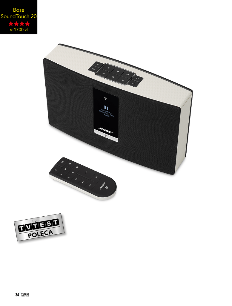 Bose SoundTouch 20 ≈ 1700 zł 34 TVTEST 05/15 Bose SoundTouch 20 ≈ 1700 zł Głośniki w każdym pokoju, wszystko zarządzane z poziomu komputera, tableta lub smartfonu. To nie jest jakaś odległa przyszłość, lecz teraźniejszość od kilku lat wdrażana przez specjalistyczne firmy. Aktualnie jest wiele tego typu rozwiązań, a jednym z nich jest nowy głośnik firmy Bose. Bose SoundTouch to nowy system dźwięku multiroom, który jest bezpośrednim konkurentem dla urządzeń firm Sonos, LG czy Samsung. Jako jeden z pierwszych pojawił się model SoundTouch 20, konkurujący z Sonos Play:3. Urządzenie to służy przede wszystkim do słuchania muzyki z sieci, zarówno internetowej, jak i domowej. Bose SoundTouch nie jest potężnych rozmiarów, ale to nie przeszkadza by wydobyć z niego niezwykłej jakości dźwięk. Urządzenie z powodzeniem nagłaśnia 30-metrowe pomieszczenia i to przy naprawdę wiernym odwzorowaniu dźwięków, nawet przy maksymalnej głośności. Wyraźny i czysty bas sprawia, że słuchanie perkusyjnego kawałka Rush – Der Trommler wywołuje ciągły uśmiech na naszej twarzy. Jest naprawdę dobrze, a po ostatnich zabawach z soundbarem Bose, zaczynałem już wątpić w jakość dźwięku w sprzęcie tego producenta. Na szczęście SoundTouch 20 gwarantuje satysfakcję naszym uszom. Dźwięk to jedno, ale ważne są także funkcje użytkowe. Bose SoundTouch 20 nie jest stacja dokującą, czy wieżą stereo. Po wyjęciu z pudełka urządzenie musimy podłączyć przewodem micro USB do naszego komputera i skonfigurować dzięki dedykowanej aplikacji, rejestrując się też na stronach Bose. Konfiguracja polega na nadaniu urządzeniu nazwy, skonfigurowaniu sieci Wi-Fi oraz zdefiniowaniu sześciu stacji internetowego radia, do których zyskamy szybki dostęp zarówno z poziomu panelu urządzenia, jak i dołączonego pilota. Po odłączeniu od komputera urządzenie w pełni samodzielnie korzysta z zasobów internetowych, tj. ustawionych stacji radiowych. Możemy nim sterować z poziomu smartfona, tableta lub komputera wysyłając muzykę zgromadzoną na komputerze lub korzystać z innych internetowych stacji radiowych. 35 TVTEST 01/15 Użytkownicy urządzeń Apple mogą też cieszyć się obsługą AirPlay. Jeszcze więcej możliwości Bose SoundTouch zyskuje w połączeniu z kolejnymi urządzeniami z tej serii – wtedy możemy łączyć je w pary, grupować i zarządzać muzyką w całym domu. Nie jest to jednak tania zabawa. Na uwagę zasługuje polonizacja urządzenia. Zarówno informacje wyświetlane na ekranie Bose SoundTouch 20, jak i same aplikacje na urządzenia mobilne i komputer, są dostępne w języku polskim. Przy wyświetlaniu nazw utworów nie ma problemów z polską czcionką. Nikt też nie powinien mieć problemów z konfiguracją, bo interfejs aplikacji jest stosunkowo prosty i czytelny, choć nie należy do najnowocześniejszych. Gdy system Bose SoundTouch wchodził na rynek, nie oferował dostępu do popularnych usług streamingu muzyki jak Spotify, czy Deezer, które miała konkurencja w rodzaju Sonosa. Ponadto urządzenie nie zawsze chciało połączyć się z siecią za pierwszym razem; podobnie było z połączeniem z Macbookiem poprzez AirPlay. Na szczęście aktualizacja oprogramowania dokonana w 2014 roku usunęła te mankamenty, co pozwoliło przede wszystkim uniezależnić głośnik od naszego komputera. Dzięki dostępowi do Deezer i Spotify miliony utworów są teraz w zasięgu pilota. Z SoundTouch 20 podobnie jak z konkurencyjnymi produktami jest tylko jeden problem – cena. Prawie 1700 złotych za niewielki głośnik to niestety dużo. Owszem jakość dźwięku jest wręcz wyśmienita, ale to trochę za mało, aby upowszechnić takie rozwiązania. Raczej mało kto zdecyduje się na zakup kilku takich urządzeń do domu – w końcu za kwotę kilku tysięcy złotych można pomyśleć o jakimś zaawansowanym kinie domowym. Sama idea multiroom i zarządzania muzyką w całym domu z poziomu telefonu jest świetna. Bose SoundTouch 20 to sprzęt dobrze wykonany, ze stylowym wyglądem i niezłym dźwiękiem, ale bardziej dla tych, którzy mają zasobne portfele. Paweł Okopień