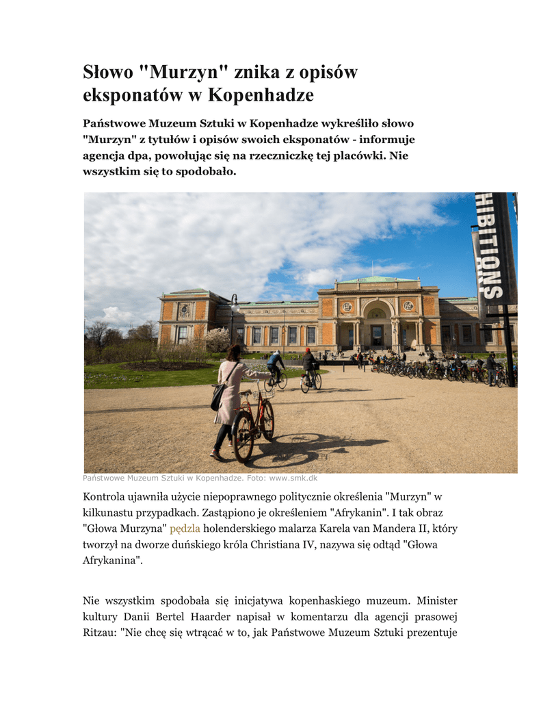 Słowo "Murzyn" znika z opisów eksponatów w Kopenhadze Państwowe Muzeum Sztuki w Kopenhadze wykreśliło słowo "Murzyn" z tytułów i opisów swoich eksponatów - informuje agencja dpa, powołując się na rzeczniczkę tej placówki. Nie wszystkim się to spodobało. Państwowe Muzeum Sztuki w Kopenhadze. Foto: www.smk.dk Kontrola ujawniła użycie niepoprawnego politycznie określenia "Murzyn" w kilkunastu przypadkach. Zastąpiono je określeniem "Afrykanin". I tak obraz "Głowa Murzyna" pędzla holenderskiego malarza Karela van Mandera II, który tworzył na dworze duńskiego króla Christiana IV, nazywa się odtąd "Głowa Afrykanina". Nie wszystkim spodobała się inicjatywa kopenhaskiego muzeum. Minister kultury Danii Bertel Haarder napisał w komentarzu dla agencji prasowej Ritzau: "Nie chcę się wtrącać w to, jak Państwowe Muzeum Sztuki prezentuje swe poszczególne dzieła, ale osobiście uważam, że Dania będzie biedniejsza, jeśli zapomnimy o naszej przeszłości jako mocarstwa kolonialnego". Zobacz więcej Głosy krytyki słychać też w środowisku duńskich muzealników. "Kiedy usuwamy historię, niczego nie możemy się z niej nauczyć" - powiedział prasie dyrektor muzeum sztuki Aros w Aarhus, Erlend Hoyersten. "Wizerunek człowieka, na jaki natrafiamy w starych tytułach i opisach dzieł sztuki, może powiedzieć coś o tym, gdzie jesteśmy dzisiaj i jak daleko zaszliśmy" - dodał. Podobną opinię wyraziła szefowa kopenhaskiego Muzeum Narodowego Camilla Mordhorst: "Kiedy koryguje się historię, istnieje ryzyko utraty historycznej głębi".