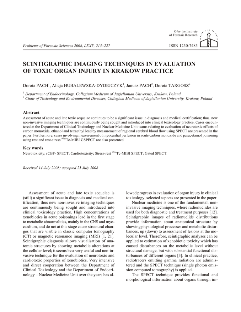 © by the Institute of Forensic Research ISSN 1230-7483 Problems of Forensic Sciences 2008, LXXV, 215–227 SCINTIGRAPHIC IMAGING TECHNIQUES IN EVALUATION OF TOXIC ORGAN INJURY IN KRAKOW PRACTICE Dorota PACH1, Alicja HUBALEWSKA-DYDEJCZYK1, Janusz PACH2, Dorota TARGOSZ2 1 2 Department of Endocrinology, Collegium Medicum of Jagiellonian University, Krakow, Poland Chair of Toxicology and Environmental Diseases, Collegium Medicum of Jagiellonian University, Krakow, Poland Abstract Assessment of acute and late toxic sequelae continues to be a significant issue in diagnosis and medical certification; thus, new non-invasive imaging techniques are continuously being sought and introduced into clinical toxicology practice. Cases encountered at the Department of Clinical Toxicology and Nuclear Medicine Unit teams relating to evaluation of neurotoxic effects of carbon monoxide, ethanol and tetraethyl lead by measurement of regional cerebral blood flow using SPECT are presented in the paper. Furthermore, cases involving measurement of myocardial perfusion in acute carbon monoxide and paracetamol poisoning using rest and rest-stress 99mTc-MIBI GSPECT are also presented. Key words Neurotoxicity; rCBF- SPECT; Cardiotoxicity; Stress-rest 99mTc-MIBI SPECT; Gated SPECT. Received 14 July 2008; accepted 25 July 2008 Assessment of acute and late toxic sequelae is (still) a significant issue in diagnosis and medical certification, thus new non-invasive imaging techniques are continuously being sought and introduced into clinical toxicology practice. High concentrations of xenobiotics in acute poisonings lead in the first stage to metabolic abnormalities, mainly in the CNS and myocardium, and do not at this stage cause structural changes that are visible in classic computer tomography (CT) or magnetic resonance imaging (MRI) [1, 21]. Scintigraphic diagnosis allows visualisation of anatomic structures by showing metabolic alterations at the cellular level; it seems be a very useful and non-invasive technique for the evaluation of neurotoxic and cardiotoxic properties of xenobiotics. Very intensive and direct cooperation between the Department of Clinical Toxicology and the Department of Endocrinology – Nuclear Medicine Unit over the years has al- lowed progress in evaluation of organ injury in clinical toxicology; selected aspects are presented in the paper. Nuclear medicine is one of the fundamental, noninvasive imaging techniques, where radionuclides are used for both diagnostic and treatment purposes [12]. Scintigraphic images of radionuclide distributions provide information about anatomical structure by showing physiological processes and metabolic disturbances, up (down) to assessment of lesions at the molecular level. Therefore, scintigraphic analyses can be applied to estimation of xenobiotic toxicity which has caused disturbances on the metabolic level without structural damage, but with substantial functional disturbances of different organs [3]. In clinical practice, radiotracers emitting gamma radiation are administered and the SPECT technique (single photon emission computed tomography) is applied. The SPECT technique provides functional and morphological information about organs through im- 216 D. Pach, A. Hubalewska-Dydejczyk, J. Pach et al. aging of thin slices of radionuclide distributions. The reconstructed image is based on the 3D distribution of the administered radionuclide in the organ. The physical basis of this method is detection of gamma rays emitted from short half-life radioisotopes (99mTc, 123I). The SPECT technique provides images of slices of radionuclides distributions with image contrast that is higher than that obtained with conventional planar imaging. This state is caused by the effect of superimposition of depth information in the planar technique, but this effect can be reduced by the SPECT technique by means of collecting images from multiple positions around the distributions and producing an image of a transverse slice through the distribution [3, 19]. SPECT data are obtained as multiple projection images collected during rotation of the scintillation camera full circle (360o) at same-degree increments around the longitudinal axis of the patient. Each obtained image is a set of profiles measured from different views with the number of rows of pixels in the acquisition matrix. Positron emission tomography (PET) is an imaging tool using labelled radioisotopes emitting beta rays. This imaging can be used to visualise and measure many biological processes, such as imaging of distributions and measuring kinetics of natural and analogue biological tracers. A benefit of PET is the availability of isotopes of elements that are building blocks of all organic molecules. The most important of these are 11C, 13N, and 15O. However, the most frequently used is 18F. Its chemical properties are similar to those of hydrogen and the OH group, allowing it to substitute for hydrogen or OH to produce positron-labelled analogue tracers of natural compounds. 2-fluoro-2-deoxyglucose (FDG), a glucose analogue labelled with 18F, is the most commonly used in clinical practice. Glucose and FDG both undergo intracellular phosphorylation by hexokinase, but the phosphorylated FDG remains trapped in the cell because it is unable to follow the normal glucose metabolic pathway. The images obtained by PET scanning, therefore, depict regional glucose metabolism [3, 19]. The biggest limitation of PET studies is the relatively short half-life of these isotopes, and the necessity that they be produced close to the PET scanner. Unfortunately, access to PET studies is limited in Poland and PET is used mainly for oncology purposes. SPECT is a research method which allows us, amongst other things, to measure the rCBF (regional Cerebral Blood Flow) and indirectly to estimate the metabolism of the nervous system, because metabolic processes are connected with blood perfusion. Radiotracers used to study cerebral b