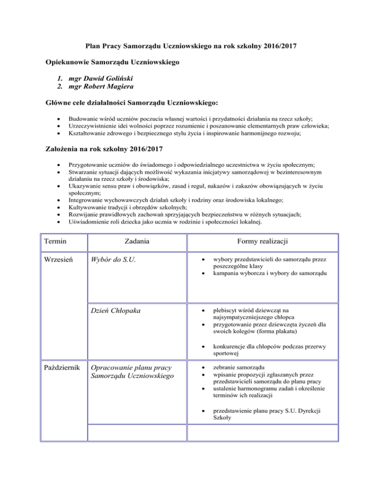 Plan Pracy Samorządu Uczniowskiego na rok szkolny 2016/2017